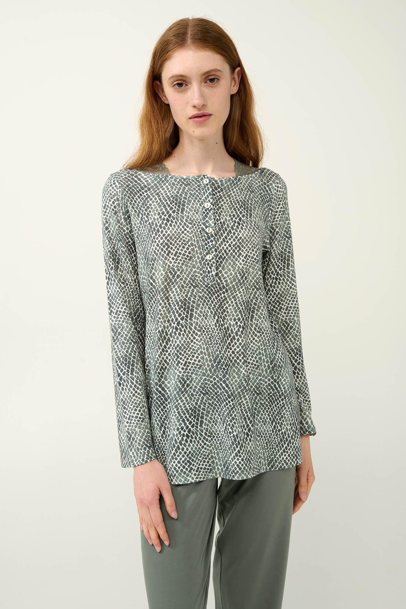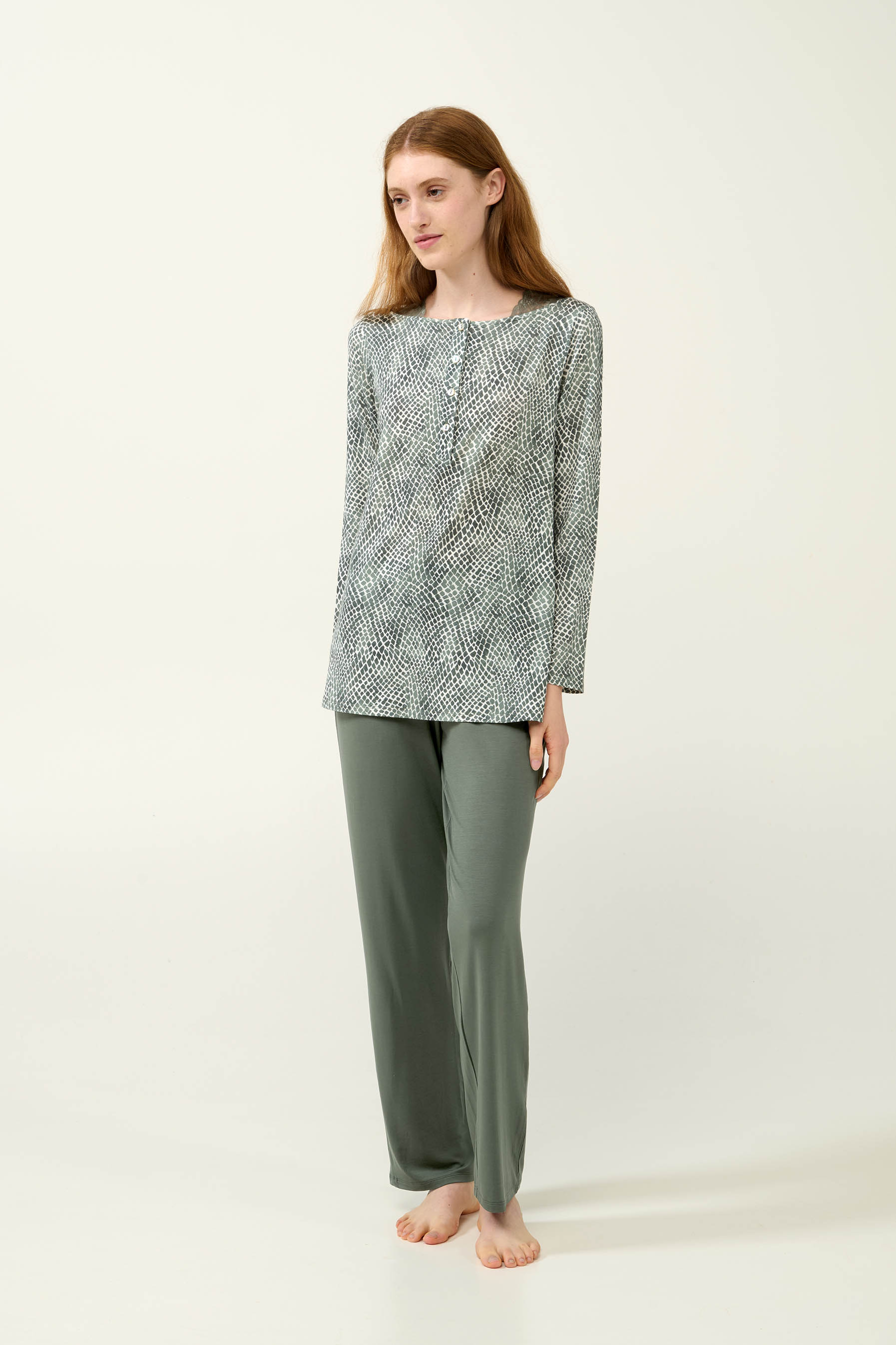 Προσθέστε στη γκαρνταρόμπα σας ένα σετ χειμερινές γυναικείες πυτζάμες, κατασκευασμένο από LENZING Tencel Modal Micro, με εξαιρετικά απαλή υφή και ευχάριστη εφαρμογή. Το επάνω μέρος είναι σχεδιασμένο με ένα εκλεπτυσμένο animal print μοτίβο, πατιλέτα και δαντέλα στη λαιμόκοψη. Το σετ συμπληρώνει ένα μονόχρωμο παντελόνι που δημιουργεί μια αρμονική αντίθεση. Ένα σετ ιδανικό για τις στιγμές χαλάρωσης σας.