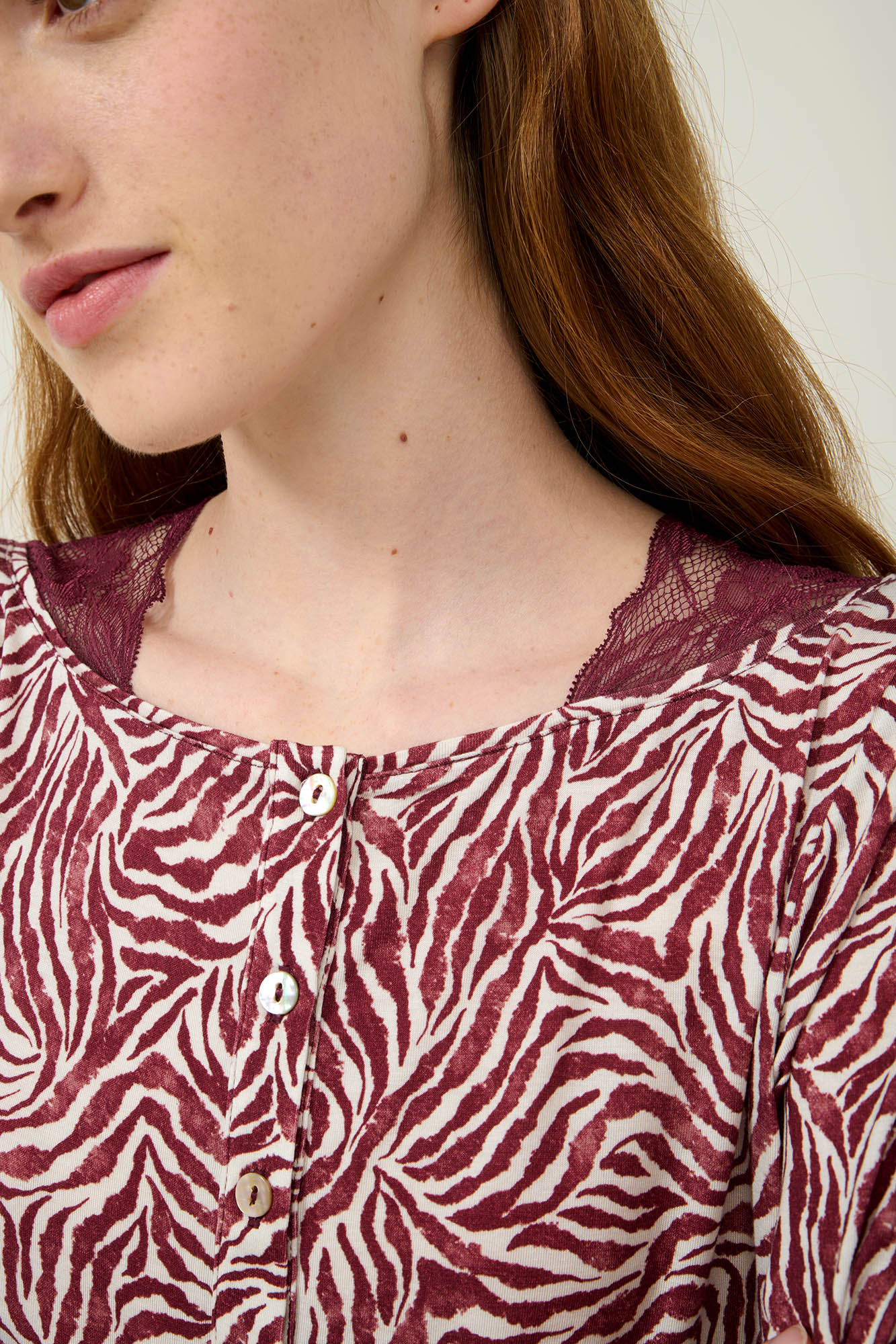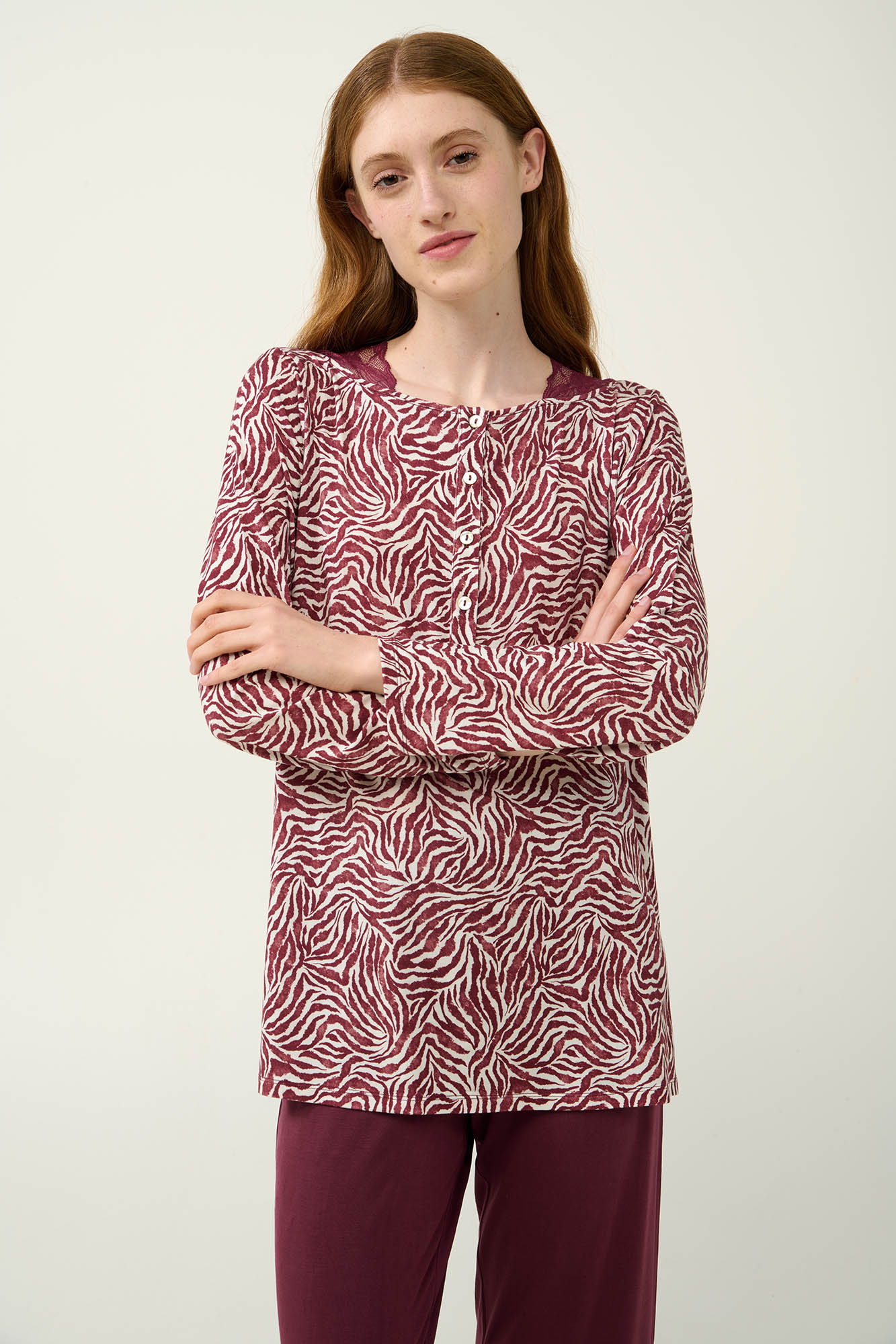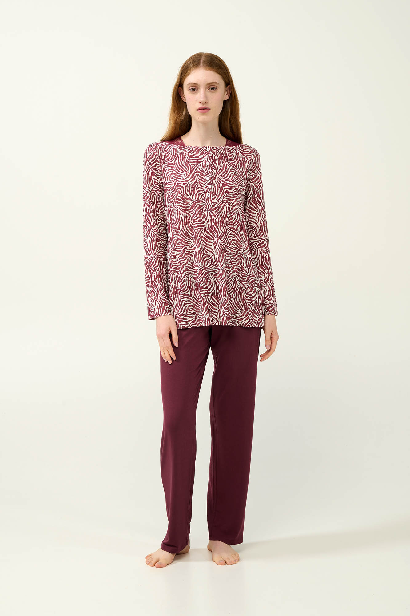 Απόλαυσε απόλυτη άνεση και στυλ με αυτές τις χειμερινές γυναικείες πυτζάμες, φτιαγμένες από απαλό LENZING Tencel Modal Micro. Το επάνω μέρος έχει πατιλέτα στο στήθος και είναι σχεδιασμένο με εντυπωσιακό συνδυασμό μπορντό και λευκού σε ζέβρα μοτίβο, με λεπτομέρειες από δαντέλα που χαρίζει μια ρομαντική νότα. Το σετ συμπληρώνει ένα μονόχρωμο παντελόνι χαρίζει ισορροπία στο σύνολο. Μια ιδανική πρόταση για να απολαύσετε ένα όμορφο απόγευμα και τον βραδινό σας ύπνο.