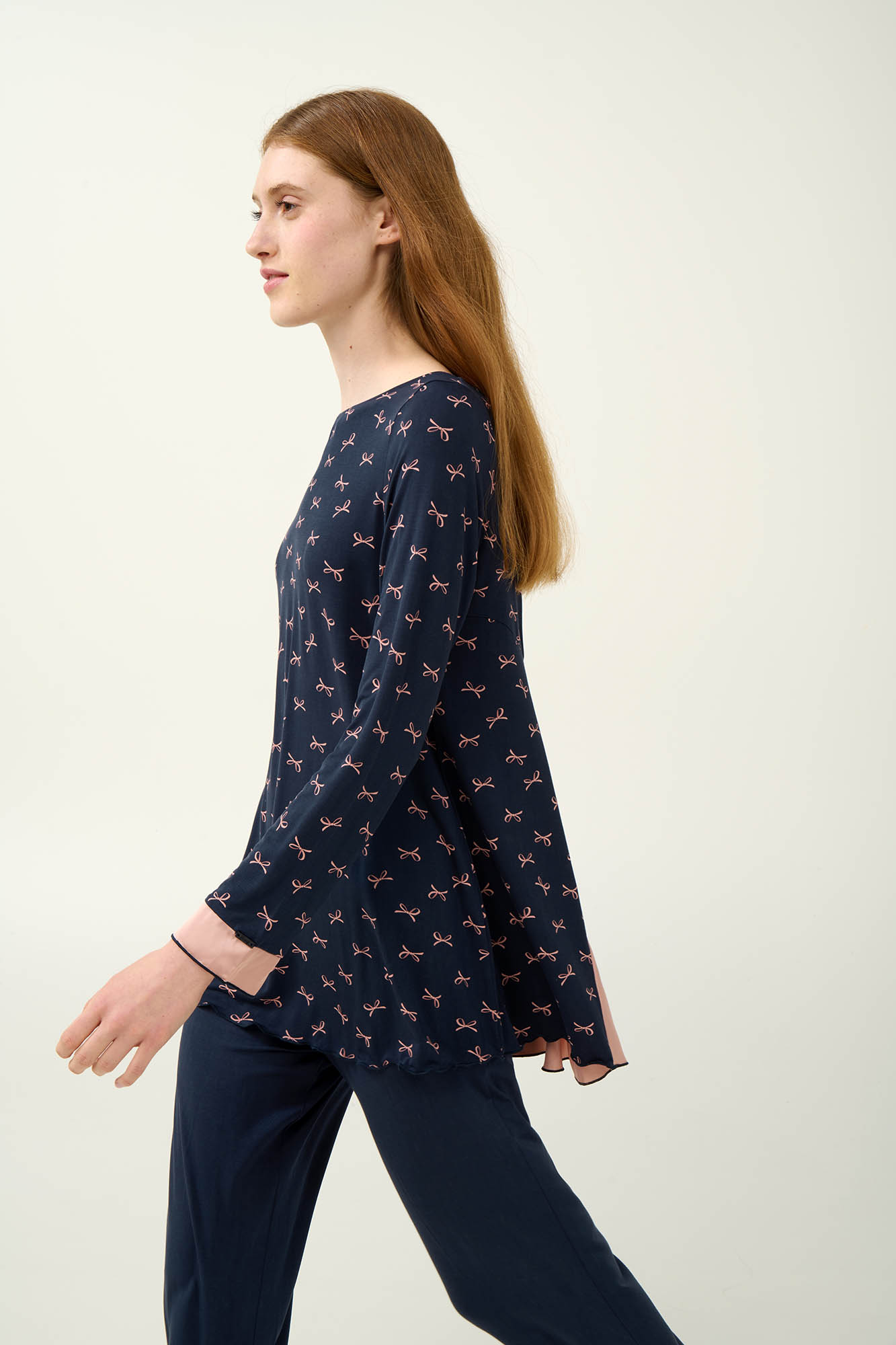Προσθέστε στη γκαρνταρόμπα σας ένα σετ χειμερινές γυναικείες πυτζάμες, φτιαγμένες από εξαιρετικής ποιότητας LENZING Tencel Modal Micro, που προσφέρει μοναδική απαλότητα και διαπνοή στο δέρμα. Η μπλούζα είναι διακοσμημένη με ροζ φιογκάκια πάνω σε ζεστή μπλε βάση, ενώ οι λεπτομέρειες από σιφόν στα μανίκια και την πλάτη προσθέτουν μια ρομαντική νότα. Το μονόχρωμο παντελόνι εξισορροπεί αρμονικά το σύνολο, προσφέροντάς σας στυλ και άνεση σε κάθε σας κίνηση. Ένα ιδανικό σετ για ήρεμα απογεύματα ή και χαλαρά πρωινά.