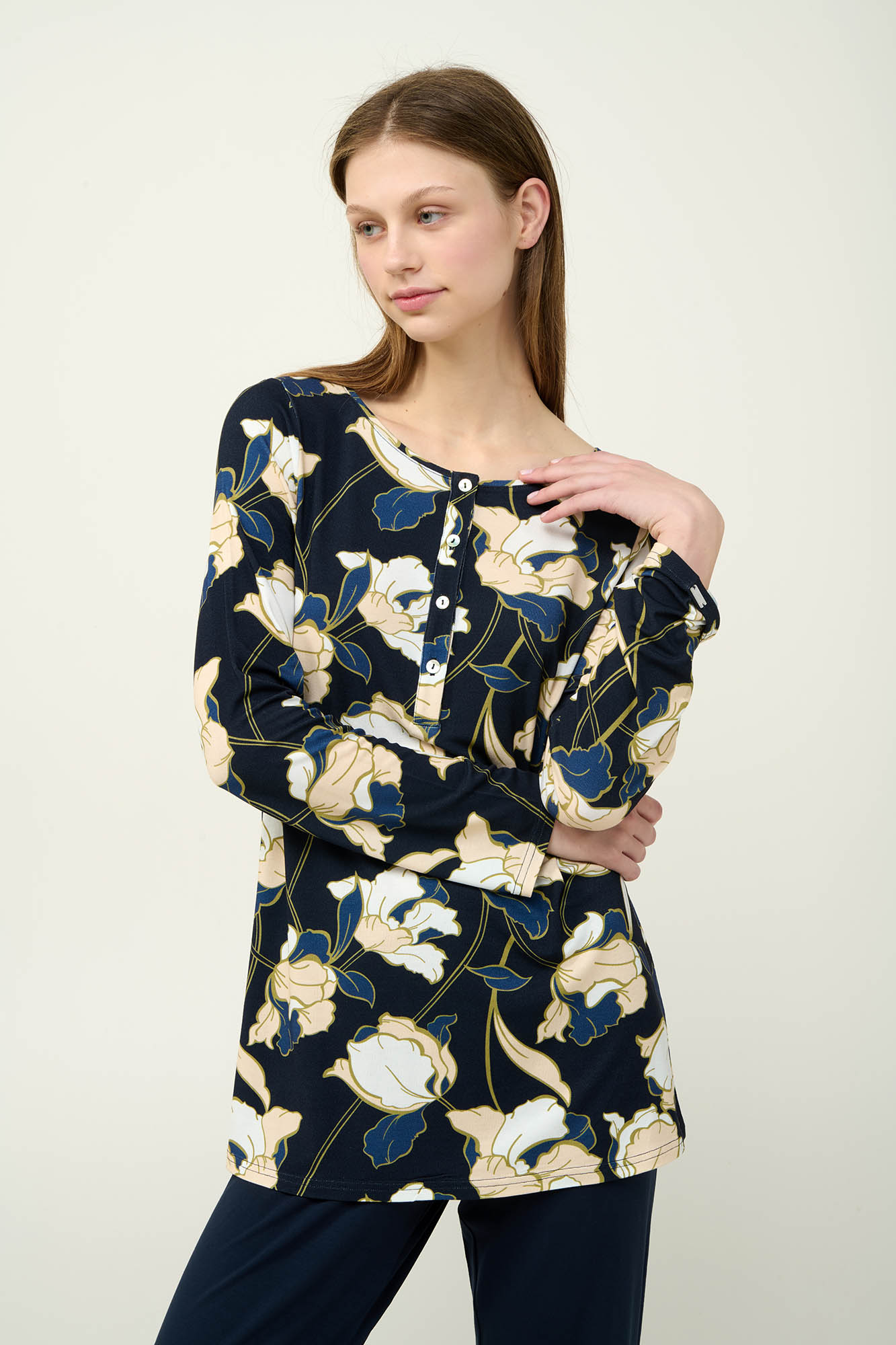 Επιλέξτε ένα σετ γυναικείες πυτζάμες που συνδυάζουν κομψότητα και ρομαντική διάθεση. Αποτελείται από μονόχρωμο, κούρο μπλε πάνω παντελόνι που συνοδεύεται από τοπ με πατιλέτα σε φλοράλ μοτίβο με λευκές τουλίπες που χαρίζουν μια νότα θηλυκότητας. Είναι κατασκευασμένο από απαλή, ελαστική viscose που θα ντύσει ευχάριστα τις στιγμές χαλάρωσης σας.
