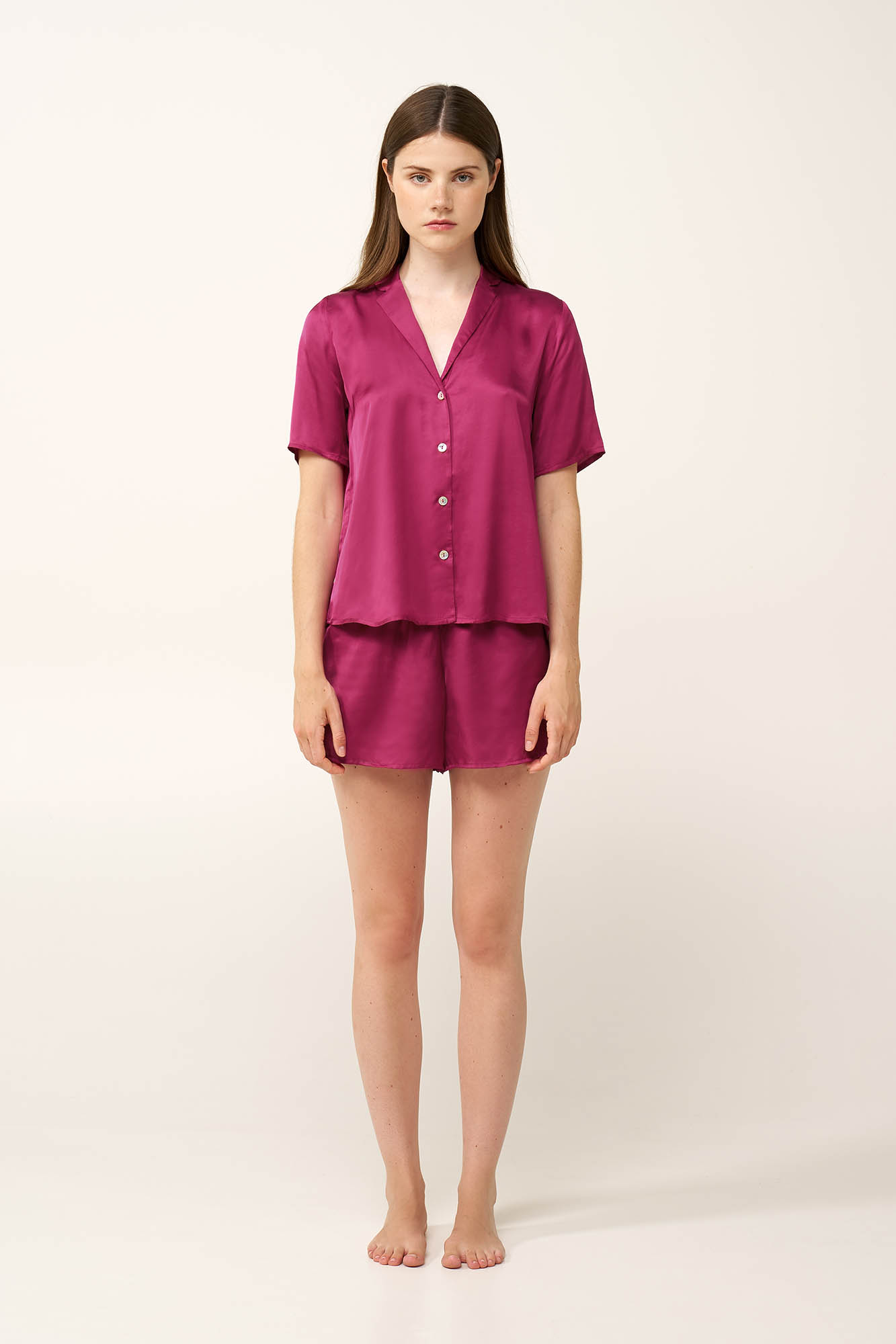 Ανακαλύψτε ένα διαχρονικό σετ γυναικείες πυτζάμες, κατασκευασμένο από λεία και απαλή σατέν viscose. Διακριτικά φωτεινό και εξαιρετικά άνετο είναι σχεδιασμένο με κλασικό κουμπωτό πάνω μέρος και κοντό παντελόνι, που κινείται φυσικά με το σώμα, καθιστώντας το ιδανικό για χαλάρωση, ξεκούραστο ύπνο ή ήσυχες βραδιές στο σπίτι, συνδυάζοντας κομψότητα και διαχρονικό χαρακτήρα.