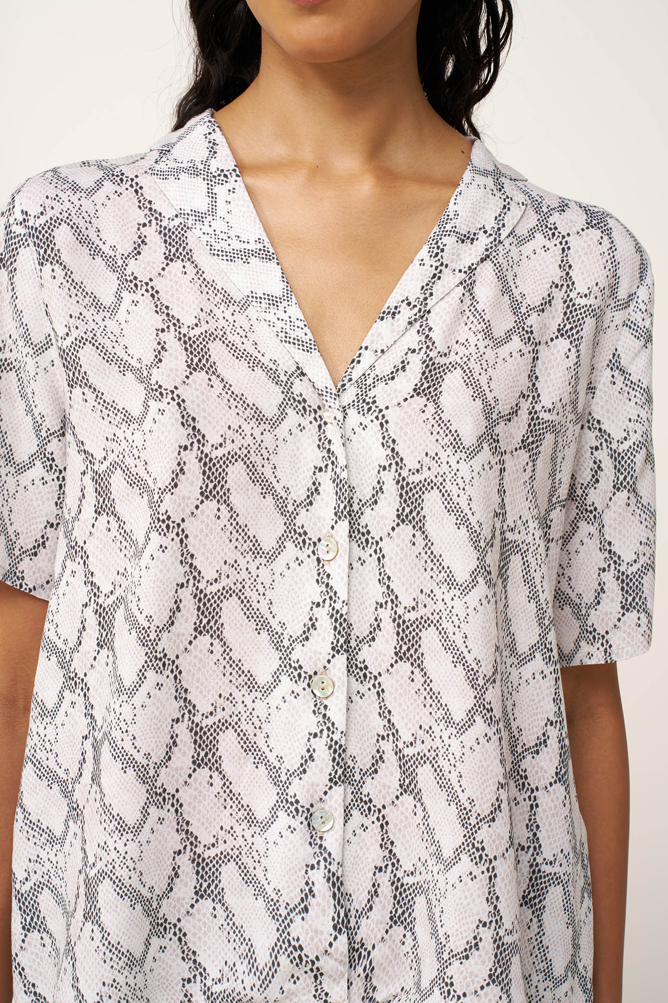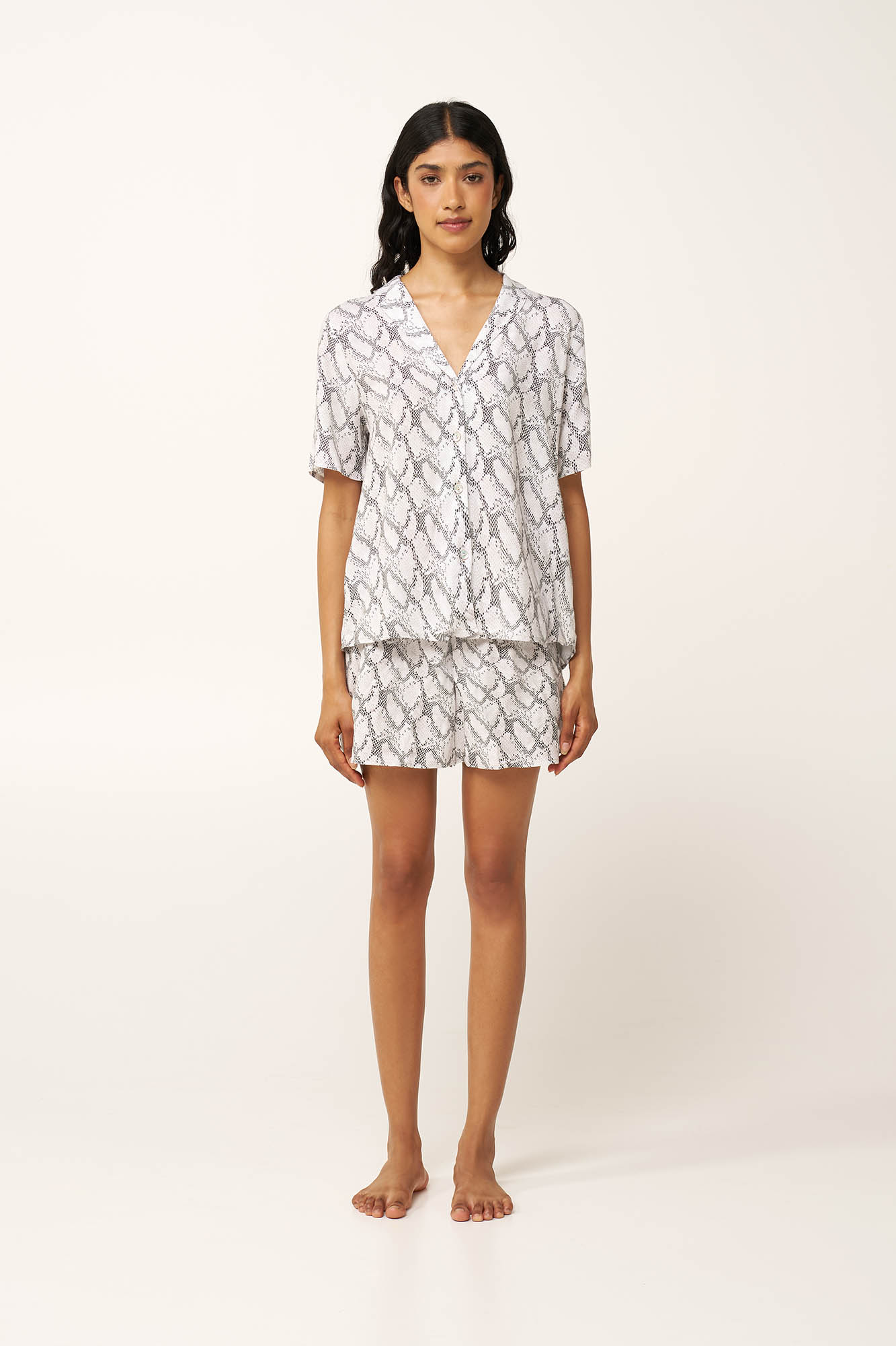 Επιλέξτε ένα δροσερό και κομψό σετ γυναικείες πυτζάμες, κατασκευασμένο από 100% viscose ποπλίνα, προσφέροντας ανάλαφρη αίσθηση τις ζεστές καλοκαιρινές ημέρες . Είναι σχεδιασμένο σε ένα εντυπωσιακό snake print, που προσθέτει μια ήπια δόση αισθησιασμού, με κουμπωτό πάνω μέρος και κοντό παντελόνι σε άνετη γραμμή. Μια ιδανική επιλογή για τον βραδινό σας ύπνο, ή ήρεμα καλοκαιρινά πρωινά, συνδυάζοντας άνεση, στυλ και μια διακριτική θηλυκότητα.