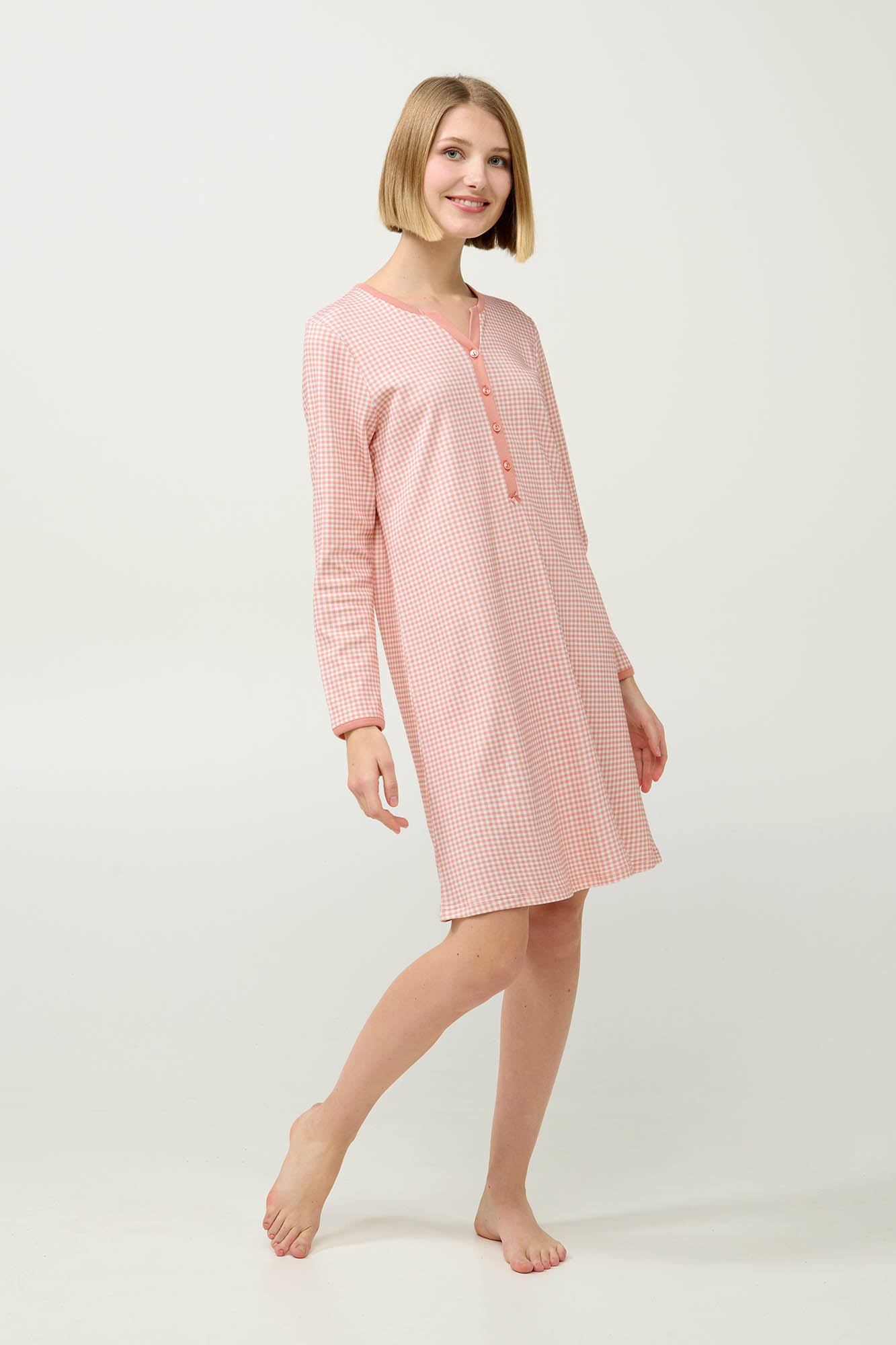 Απολαύστε τη ζεστασιά και την άνεση αυτού του νυχτικού, κατασκευασμένου από 100% βαμβάκι interlock για απαλή και διαπνέουσα αίσθηση. Σχεδιασμένο για τον χειμώνα, διαθέτει πατιλέτα για εύκολη εφαρμογή και μακριά μανίκια. Το θηλυκό ροζ καρό μοτίβο προσθέτει μια χαριτωμένη πινελιά, κάνοντάς το ιδανική επιλογή για ήσυχες νύχτες και χαλαρά πρωινά. Ένα διαχρονικό κομμάτι που συνδυάζει πρακτικότητα και στυλ για καθημερινή άνεση.