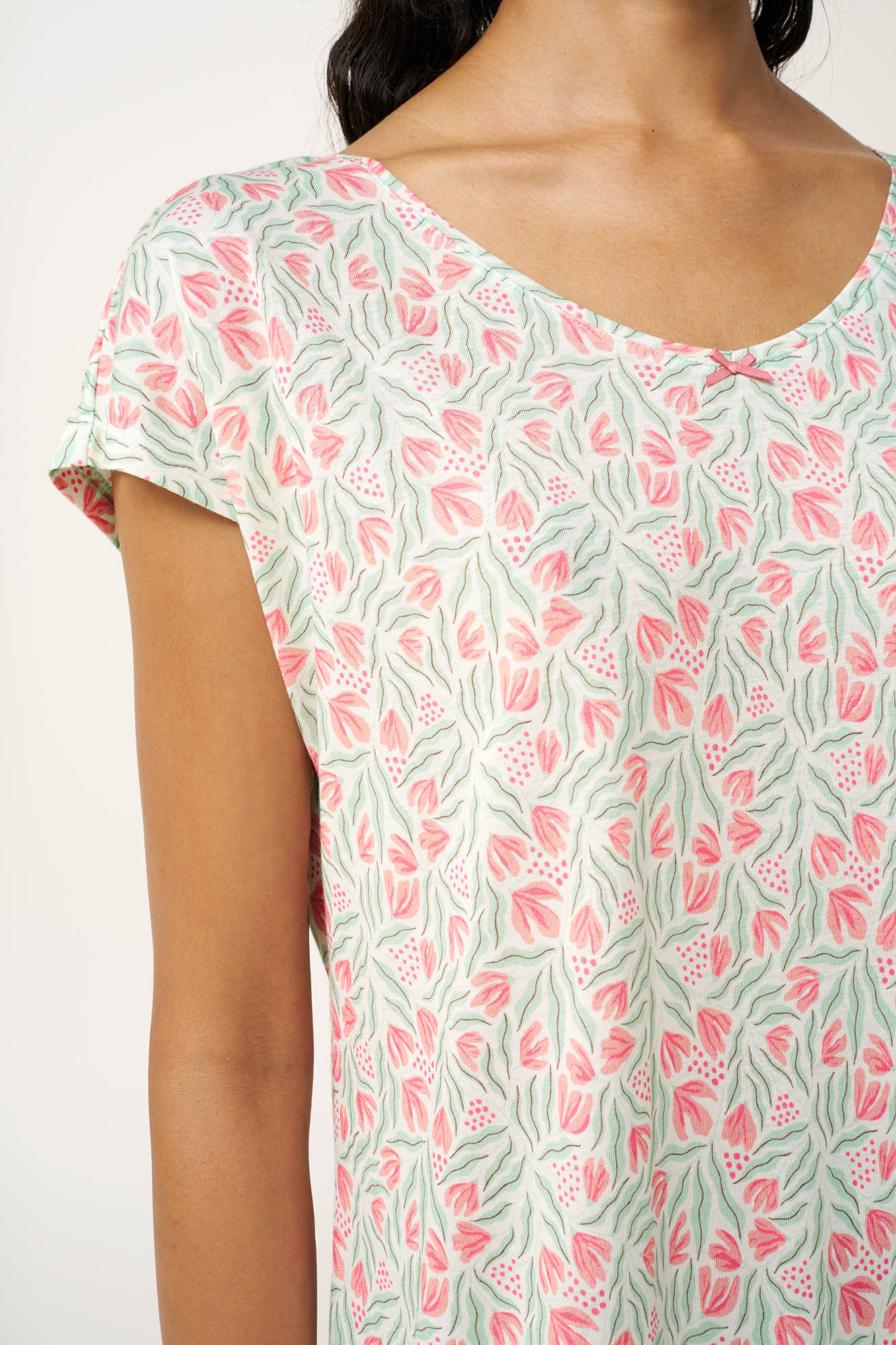 Απαλό και χαλαρό, αυτό το καλοκαιρινό cotton-modal νυχτικό είναι σχεδιασμένο για ζεστές νύχτες όπου η άνεση και η δροσιά έχουν τον πρώτο λόγο. Το ελαφρύ ύφασμα χαρίζει λεία αίσθηση και πέφτει φυσικά στο σώμα, επιτρέποντας στο δέρμα να αναπνέει. Με κοντά μανίκια και άνετη γραμμή, διακοσμείτε από ένα διακριτικό φλοράλ μοτίβο εμπνευσμένο από ροζ άνθη και απαλά πράσινα φύλλα, που προσθέτει μια φρέσκια, θηλυκή πινελιά. Ένα νυχτικό, ιδανικό για ήρεμα βράδια και ξεκούραστα πρωινά στις διακοπές.