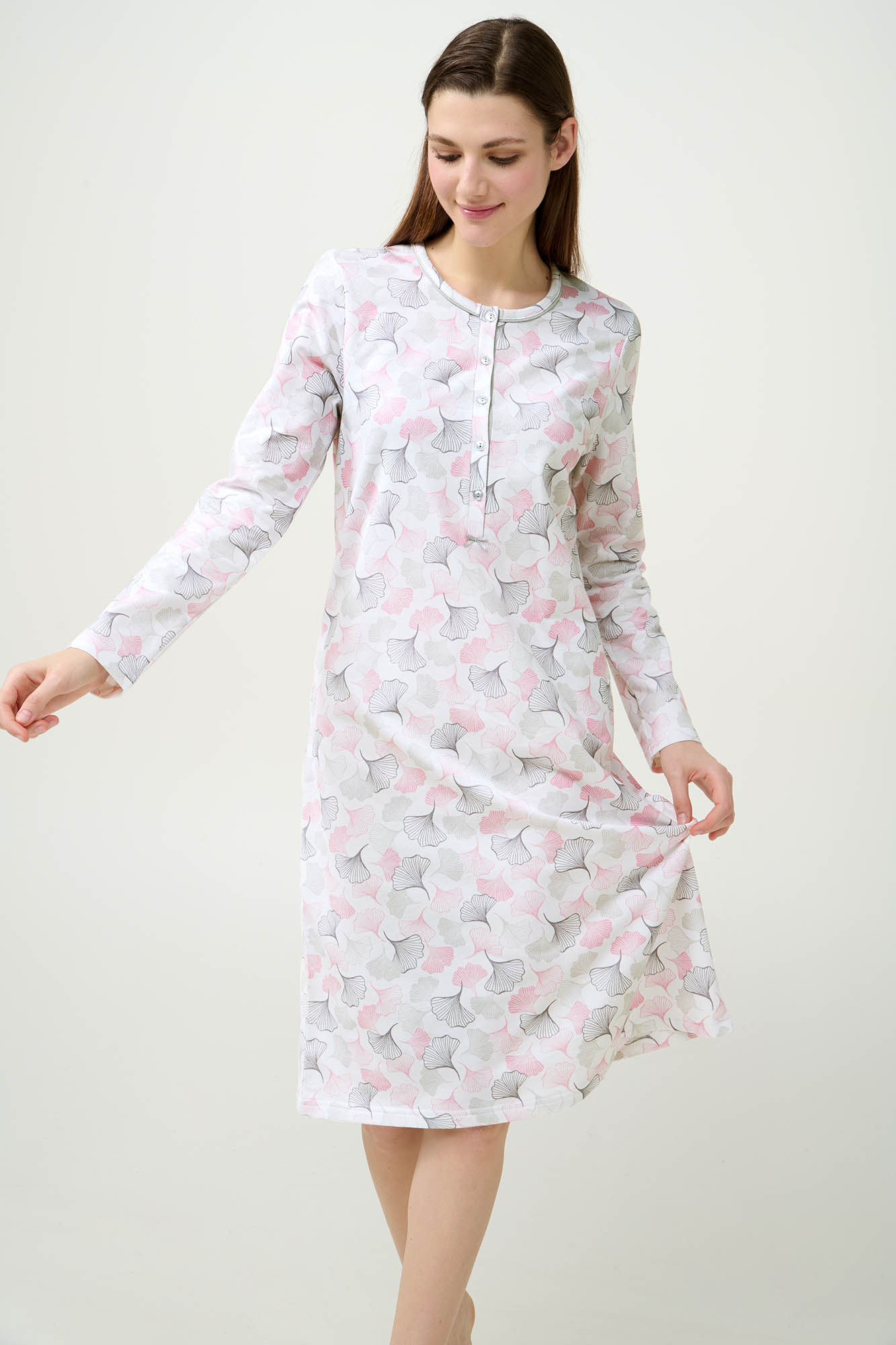 Επιλέξτε για τις κρύες ημέρες του χειμώνα ένα νυχτικό, κατασκευασμένο από 100% βαμβάκι φούτερ που προσφέρει φυσική ζεστασιά και απαλή αίσθηση. Είναι σχεδιασμένο με πατιλέτα και μακριά μανίκια, σε ένα κομψό μοτίβο με παστέλ φύλλα, που προσθέτει μια διακριτική και εκλεπτυσμένη νότα. Ιδανικό για στιγμές χαλάρωσης στο σπίτι ή έναν ήρεμο και ζεστό βραδινό ύπνο.