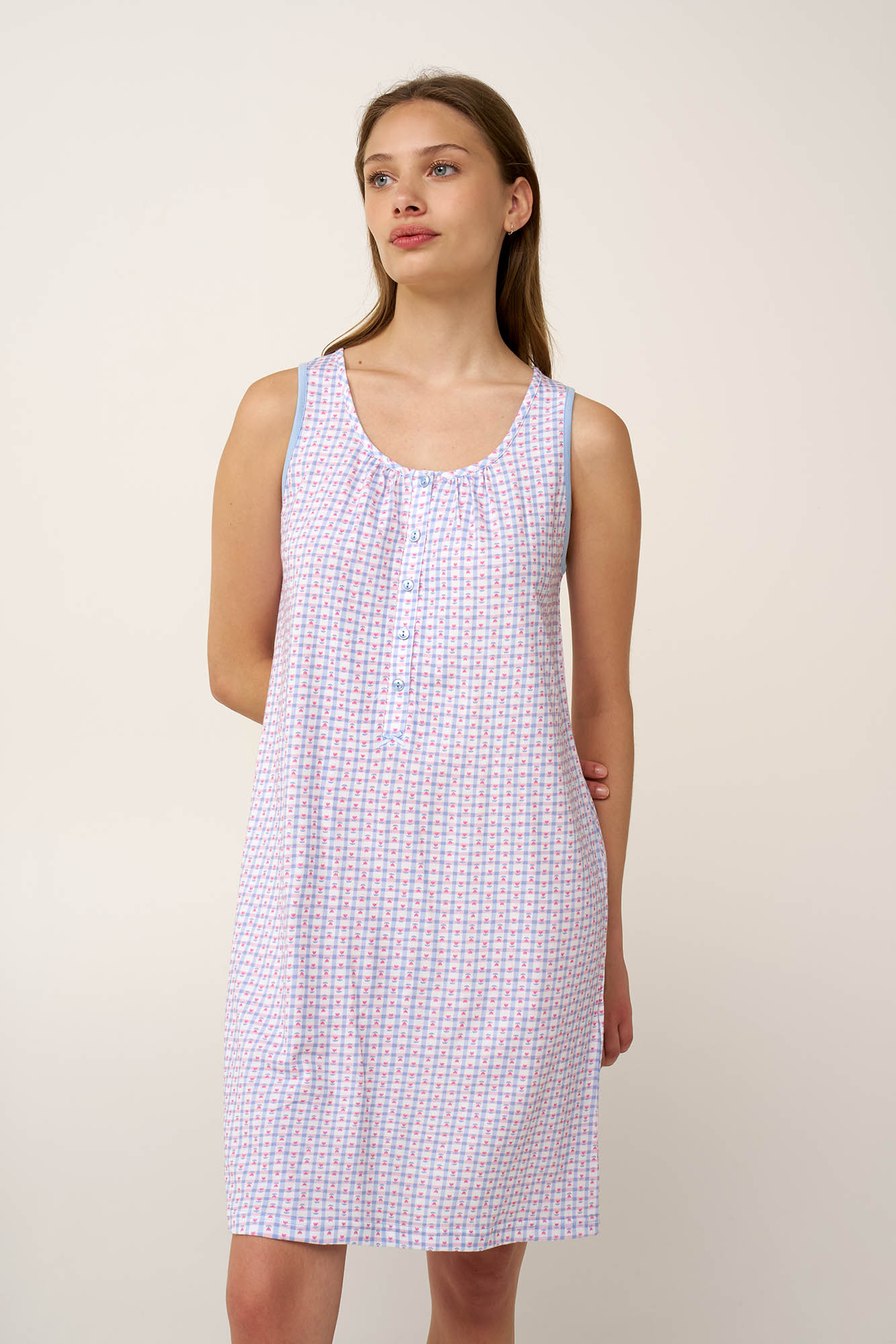 Φωτίστε τις καλοκαιρινές σας νύχτες με αυτό το αμάνικο νυχτικό, κατασκευασμένο από απαλό και διαπνέον 100% βαμβάκι single jersey. Σχεδιασμένο με κλασική πατιλέτα και σούρες στο στήθος που προσφέρει πρακτικότητα και καθημερινή άνεση. Διακοσμημένο με ένα παιχνιδιάρικο καρό μοτίβο σε αποχρώσεις ροζ και μπλε, με μικρές τουλίπες., χαρίζει ανάλαφρη διάθεση και φρεσκάδα. Ιδανικό για έναν άνετο, ξεκούραστο ύπνο ή χαλαρά πρωινά στις διακοπές.