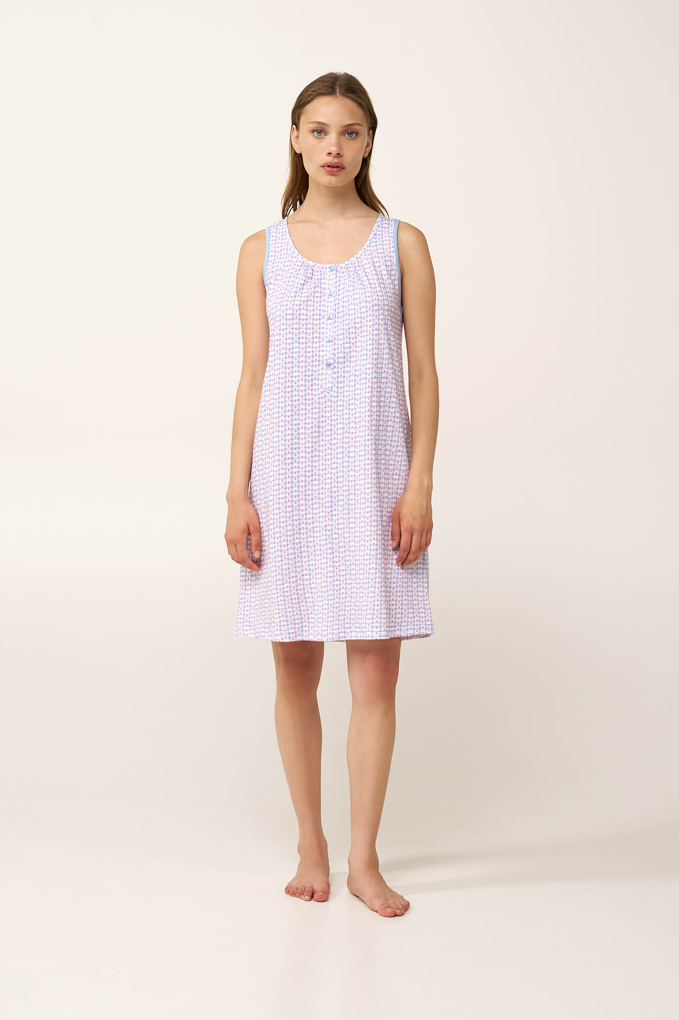 Φωτίστε τις καλοκαιρινές σας νύχτες με αυτό το αμάνικο νυχτικό, κατασκευασμένο από απαλό και διαπνέον 100% βαμβάκι single jersey. Σχεδιασμένο με κλασική πατιλέτα και σούρες στο στήθος που προσφέρει πρακτικότητα και καθημερινή άνεση. Διακοσμημένο με ένα παιχνιδιάρικο καρό μοτίβο σε αποχρώσεις ροζ και μπλε, με μικρές τουλίπες., χαρίζει ανάλαφρη διάθεση και φρεσκάδα. Ιδανικό για έναν άνετο, ξεκούραστο ύπνο ή χαλαρά πρωινά στις διακοπές.