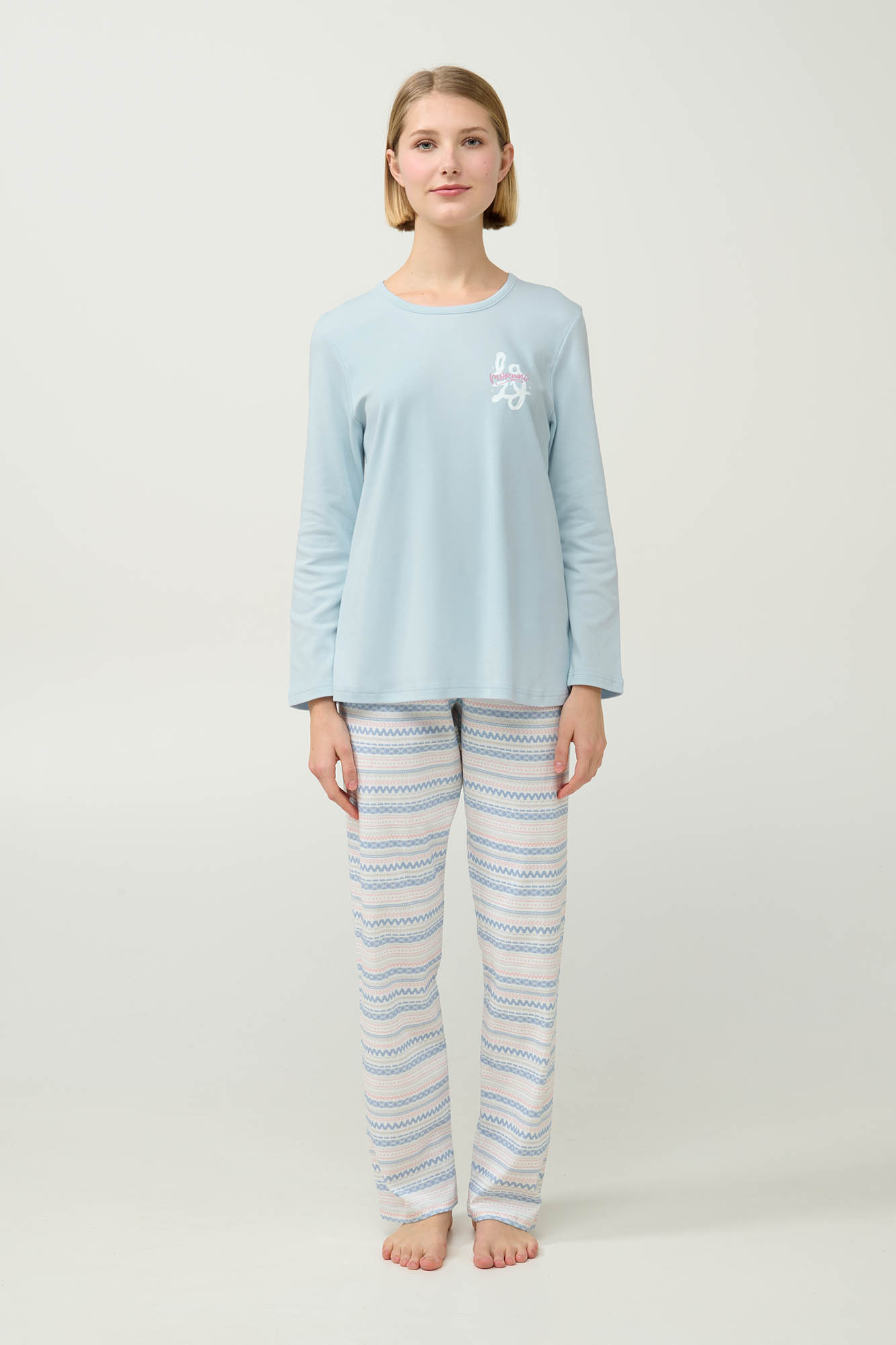Προσθέστε στη συλλογή σας αυτές τις γυναικείες πυτζάμες, κατασκευασμένες από υψηλής ποιότητας 100% βαμβάκι interlock. Το γαλάζιο τοπ διαθέτει μακριά μανίκια και κανονική εφαρμογή για άνεση και ελευθερία κινήσεων, ενώ το παντελόνι είναι διακοσμημένο με ένα σκανδιναβικό μοτίβο σε παστέλ αποχρώσεις που ενισχύει το χειμερινό του χαρακτήρα. Σχεδιασμένο για να απολαύσετε τις στιγμές χαλάρωσης ή με διαχρονικό στυλ και μέγιστη άνεση.