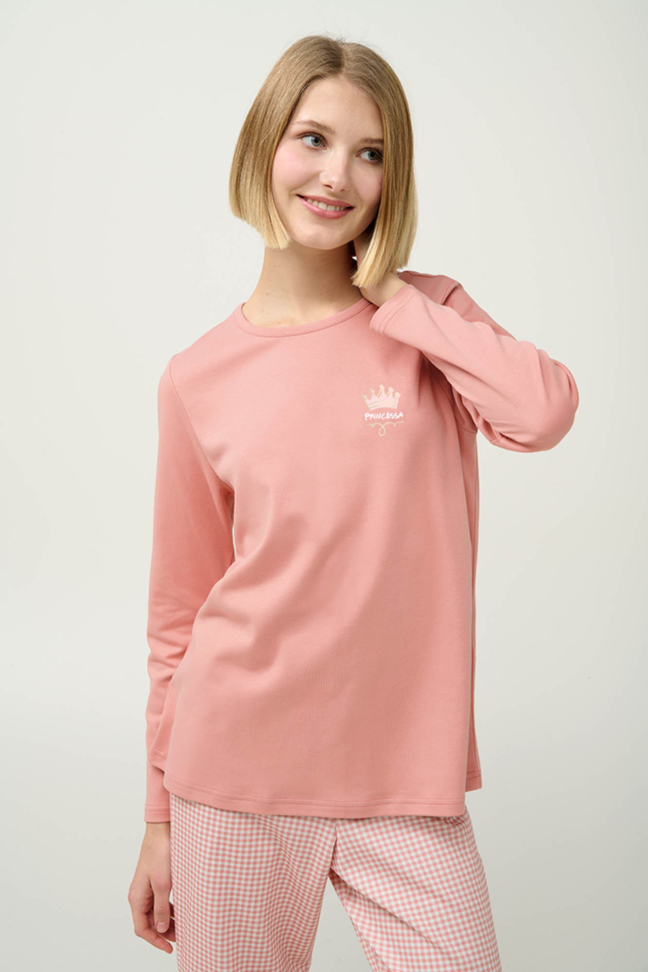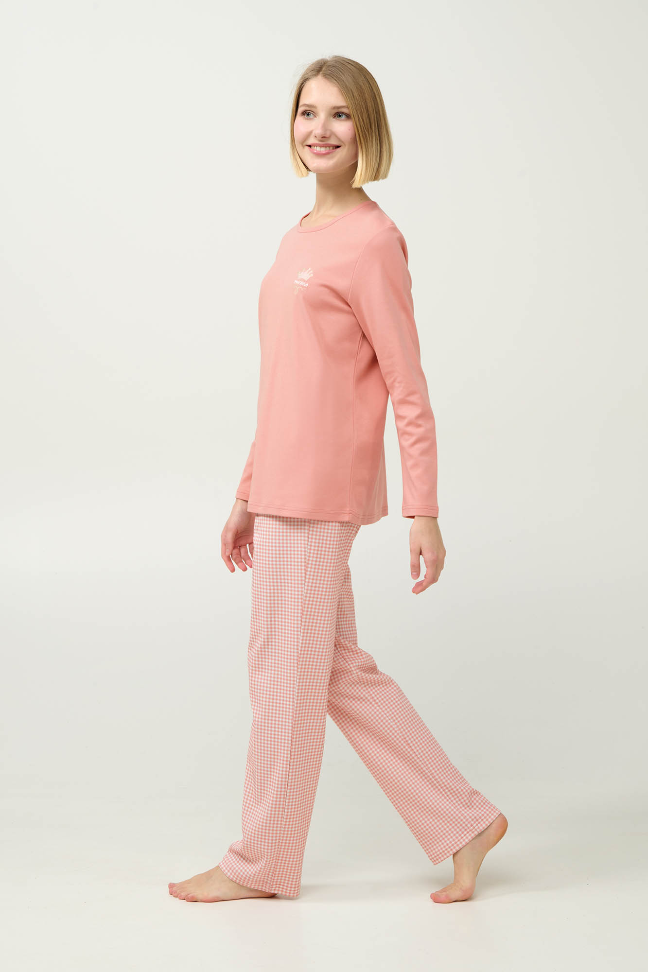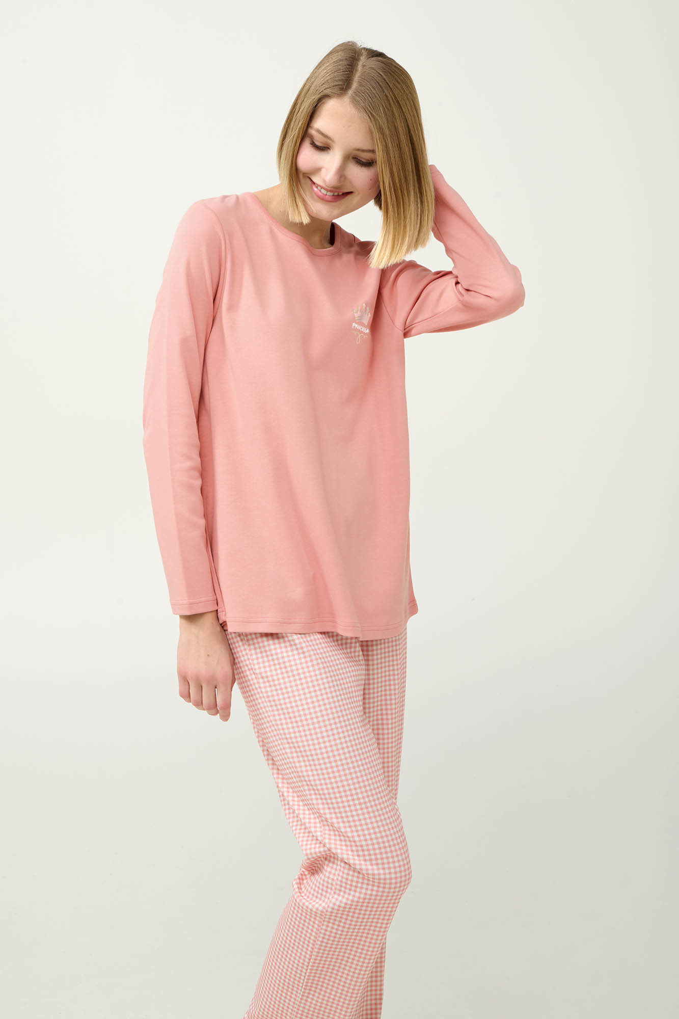 Προσθέστε στη συλλογή σας ένα σετ χειμερινές γυναικείες πυτζάμες από 100% βαμβάκι interlock που επιτρέπει στο δέρμα να αναπνέει. Αποτελείται από μονόχρωμο τοπ με μακριά μανίκια και παντελόνι σε ροζ καρό μοτίβο που προσθέτει μια θηλυκή νότα στο σύνολο. Μια εύκολη επιλογή με διαχρονικά, απλό χαρακτήρα που θα σας βοηθήσει να απολαύσετε ένα ήρεμο απόγευμα στον καναπέ ή τον βραδινό σας ύπνο.