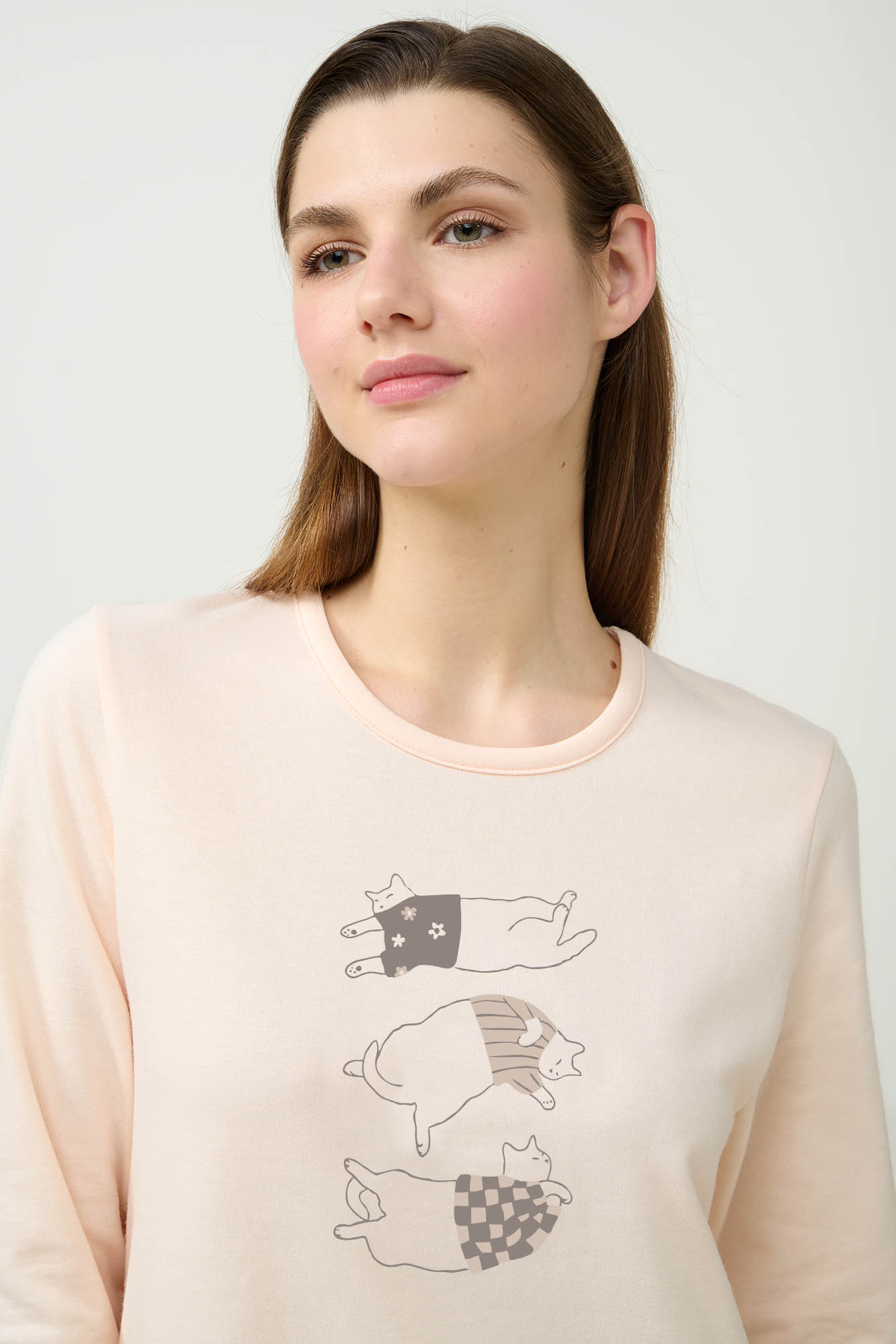 Προσθέστε στην γκαρνταρόμπα σας ένα νυχτικό, κατασκευασμένο από 100% βαμβάκι φούτερ που προσφέρει απαλότητα και διαπνοή, κρατώντας σας ζεστές τις πιο κρύες ημέρες του χειμώνα. Σχεδιασμένο με μακριά μανίκια και ένα χαριτωμένο σχέδιο με τρεις αραχτούς γάτους το στήθος, που προσθέτει μια ανάλαφρη νεανική νότα. Ιδανικό για στιγμές χαλάρωσης μετά από μια μεγάλη ημέρα.
