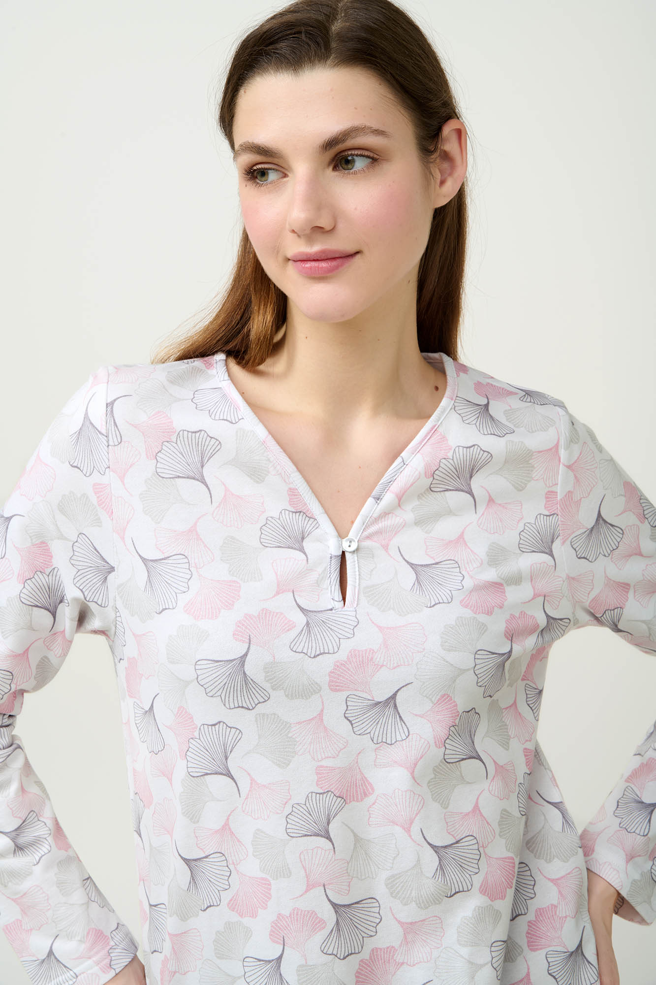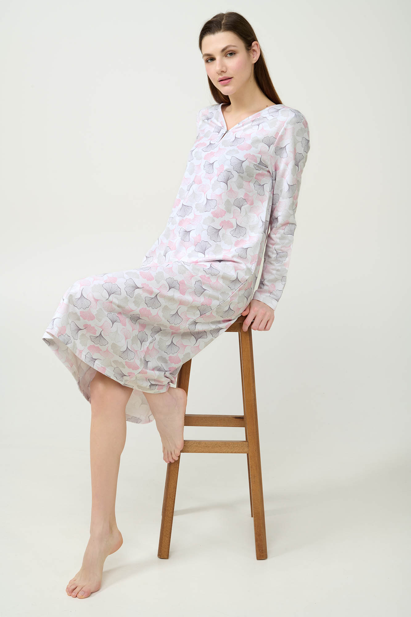 Προσθέστε στη συλλογή σας ένα χειμερινό νυχτικό, κατασκευασμένο από 100% βαμβάκι φούτερ. Διαθέτει κομψό μοτίβο από παστέλ φύλλα και μακριά μανίκια, προσφέροντας διαχρονική κομψότητα, ενώ το διαπνέον ύφασμα χαρίζει φυσική ζεστασιά και διαρκή απαλότητα. Σχεδιασμένο για χαλαρές βραδιές, αυτό το κλασικό νυχτικό συνδυάζει άνεση και στυλ.
