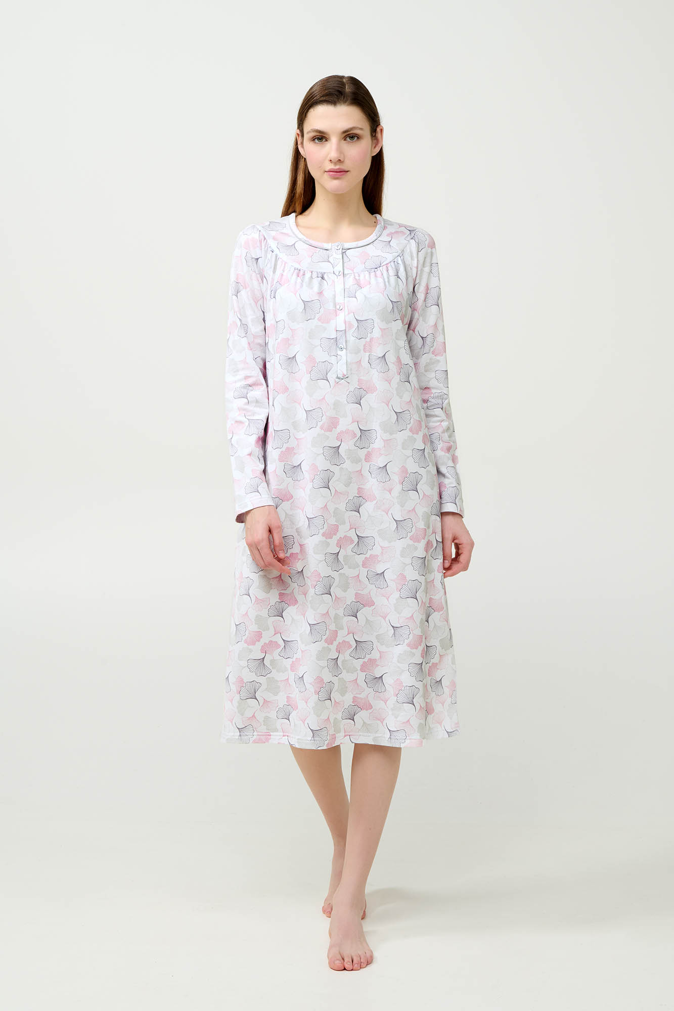 Προσθέστε στη γκαρνταρόμπα σας ένα κλασικό νυχτικό, κατασκευασμένο από 100% βαμβάκι φούτερ που προσφέρει ζεστή αίσθηση στο σώμα για τις κρύες ημέρες του χειμώνα. Είναι σχεδιασμένο με πατιλέτα και διακοσμημένο με κομψό μοτίβο από παστέλ φύλλα, προσθέτοντας διακριτική φινέτσα και διαχρονικό στυλ. Ένα νυχτικό που θα φορέσετε για χρόνια στις στιγμές ξεκούρασής σας.
