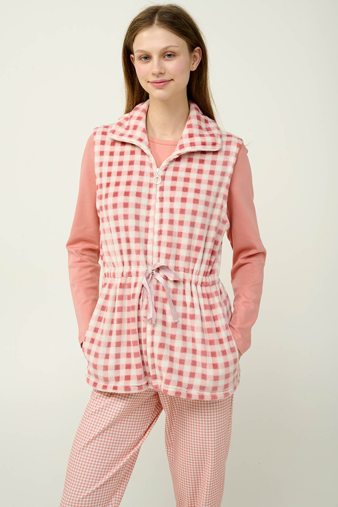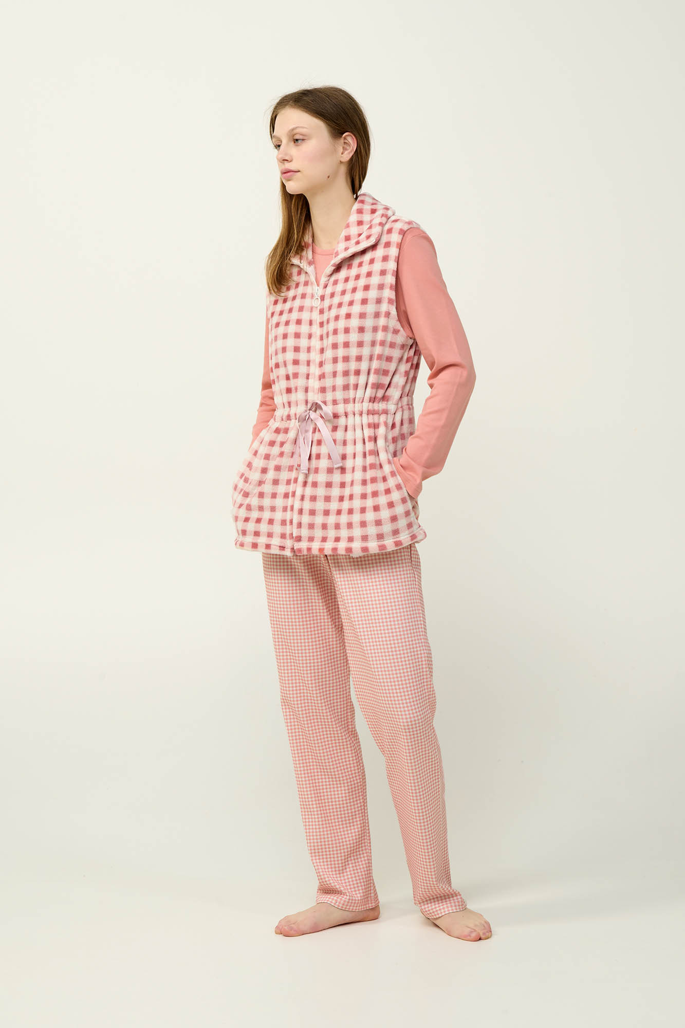 Προσθέστε στη συλλογή σας αυτό το χειμερινό σετ τριών τεμαχίων για μοναδικές στιγμές χαλάρωσης. Αποτελείται από ένα σετ πυτζάμες με μονόχρωμο τοπ και καρό παντελόνι που συνοδεύεται από 100% διαπνέον βαμβάκι interlock. Συνοδεύεται από ένα καρό fleece γιλέκο με φερμουάρ και πλαϊνές τσέπες που θα σας κρατήσει ζεστές τις πιο κρύες ημέρες του χειμώνα. Μια πρακτική επιλογή που θα απολαύσετε κάθε απόγευμα στο καναπέ.