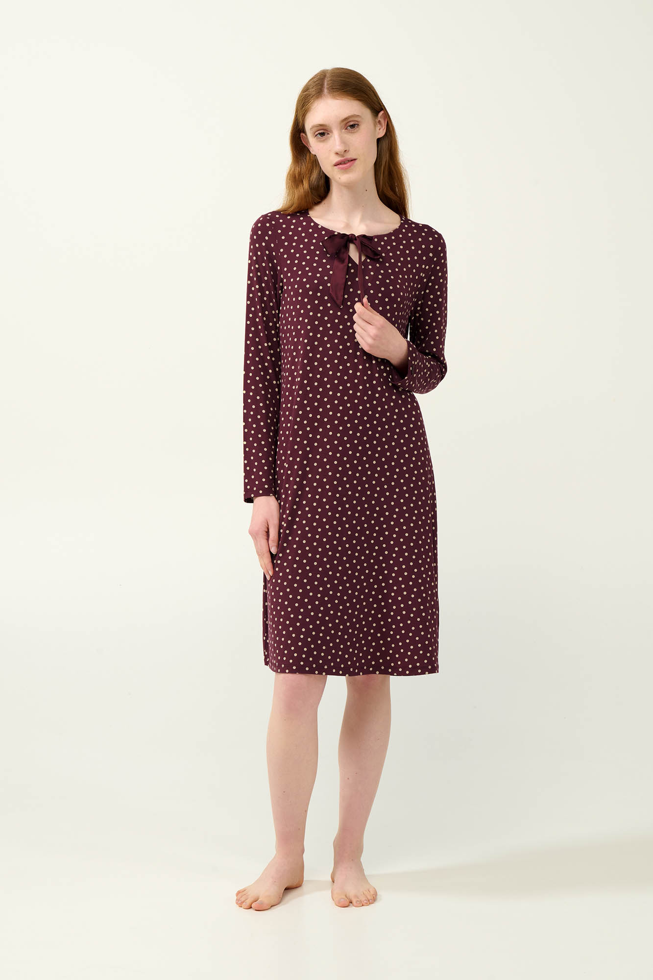 Ζήσε την απόλυτη άνεση και κομψότητα με αυτό το χειμερινό νυχτικό, κατασκευασμένο από πολυτελές LENZING Tencel Modal Micro. Με κλασικό μπεζ πουά πάνω σε πλούσιο μοβ φόντο, προσφέρει απαλή και λεία αίσθηση που αγκαλιάζει το σώμα με χάρη. Σχεδιασμένο με ιδιαίτερη λαιμόκοψη που δένει μπροστά, για να χαρίσει μια γοητευτική και ρομαντική νότα στην εμφάνιση σας. Μια όμορφη επιλογή που συνδυάζει διαχρονικό στυλ με καθημερινή άνεση.