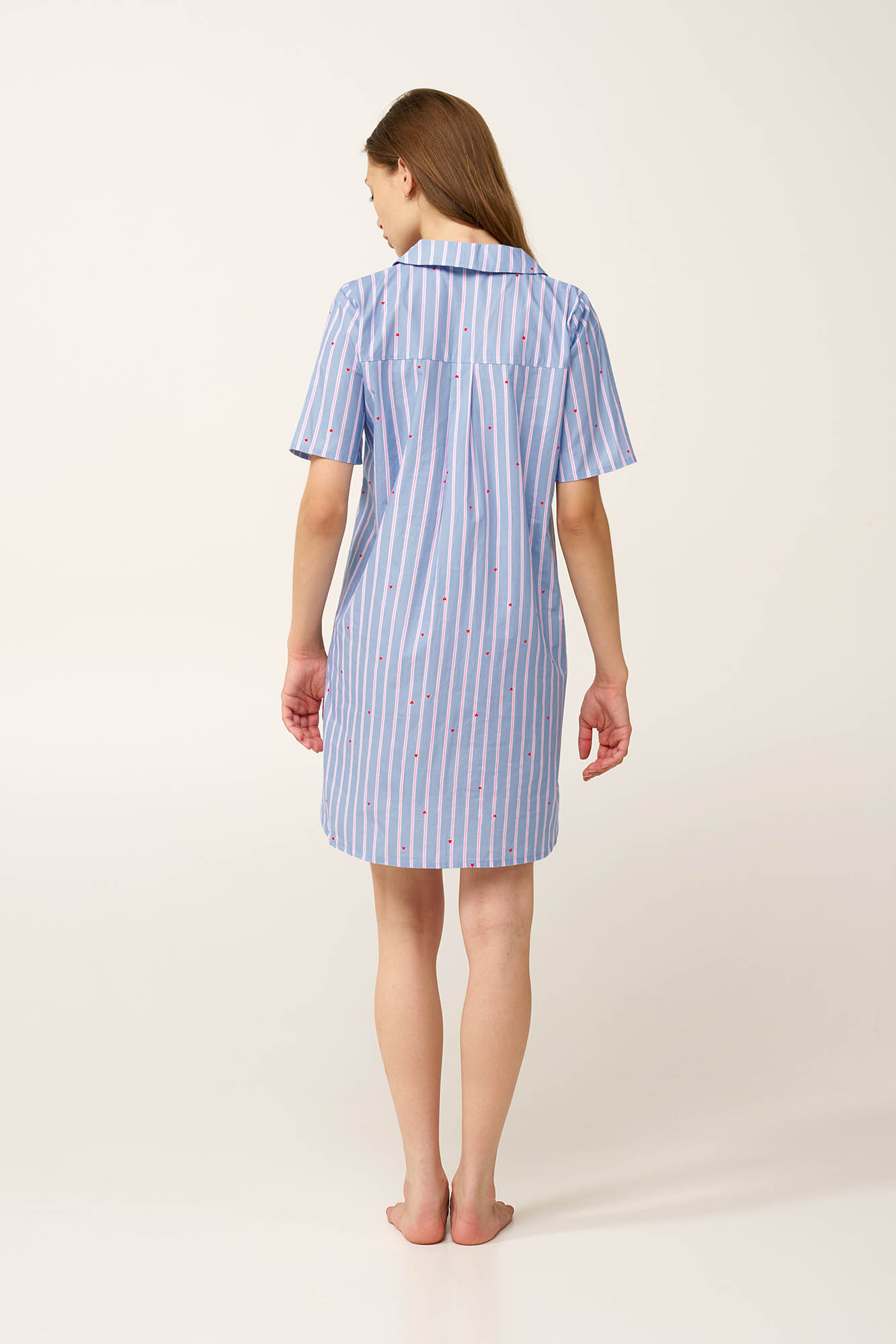 Προσθέστε στην γκαρνταρόμπα σας ένα καλοκαιρινό νυχτικό, κατασκευασμένο από ελαφριά και διαπνέουσα 100% βαμβακερή ποπλίνα που προσφέρει φρεσκάδα και άνεση. Είναι σχεδιασμένο σε κλασικό κουμπωτό πατρόν, με απαλές παστέλ ρίγες που διακόπτονται από μικρές, διάσπαρτες, κόκκινες καρδιές. Κομψό αλλά με ανάλαφρη διάθεση αυτό το νυχτικό είναι ιδανικό για καλοκαιρινές στιγμές χαλάρωσης στο σπίτι ή τις διακοπές.