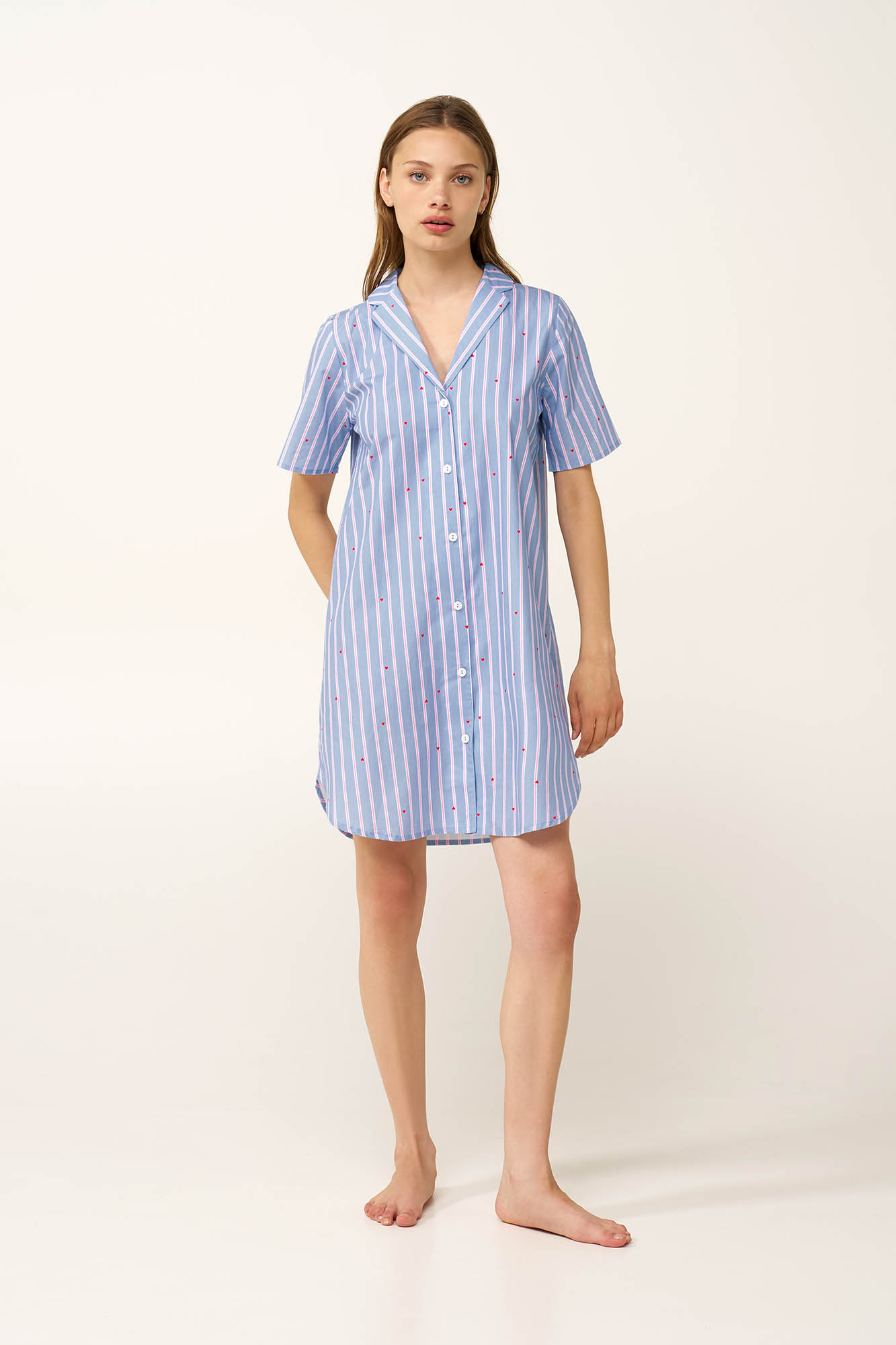 Προσθέστε στην γκαρνταρόμπα σας ένα καλοκαιρινό νυχτικό, κατασκευασμένο από ελαφριά και διαπνέουσα 100% βαμβακερή ποπλίνα που προσφέρει φρεσκάδα και άνεση. Είναι σχεδιασμένο σε κλασικό κουμπωτό πατρόν, με απαλές παστέλ ρίγες που διακόπτονται από μικρές, διάσπαρτες, κόκκινες καρδιές. Κομψό αλλά με ανάλαφρη διάθεση αυτό το νυχτικό είναι ιδανικό για καλοκαιρινές στιγμές χαλάρωσης στο σπίτι ή τις διακοπές.