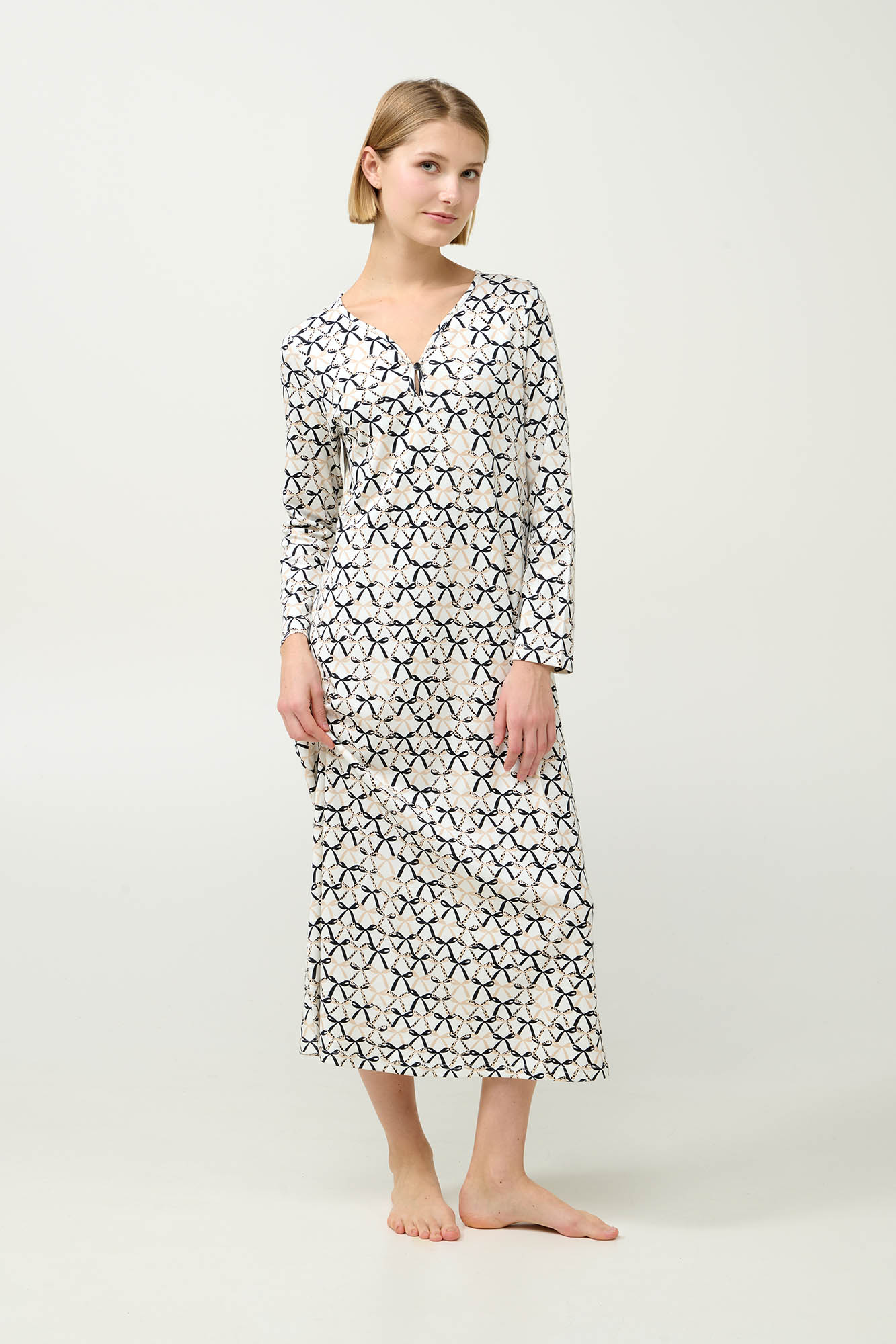 Απολαύστε απαράμιλλη άνεση κατά τη διάρκεια της νύχτας με αυτό το μακρύ νυχτικό, φτιαγμένο από 100% βαμβάκι interlock που χαρίζει απαλή και διαπνέουσα αίσθηση στο δέρμα. Σχεδιασμένο με μακριά μανίκια σε άνετη γραμμή, με κομψό μοτίβο φιόγκων που ενισχύει τον κλασικό του χαρακτήρα. Ιδανικό για χαλάρωση ή ύπνο, προσφέροντάς σας μια ζεστή και κομψή επιλογή για τα βράδια του χειμώνα.