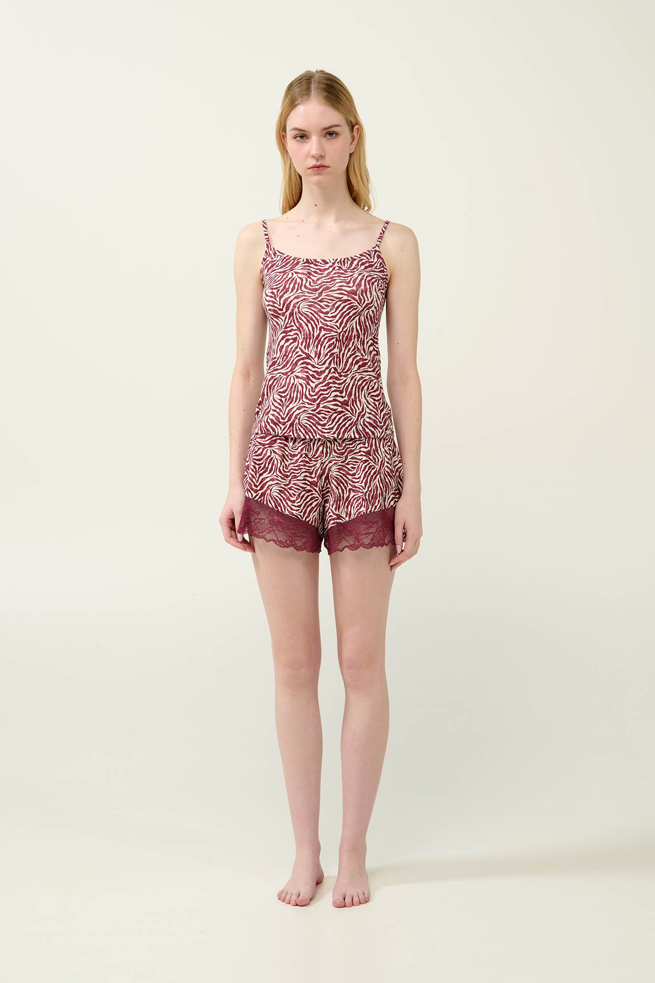 Αποκτήστε ένα cheeky σορτσάκι διακοσμημένο με εντυπωσιακό ζέβρα μοτίβο σε μπορντό και λευκές αποχρώσεις. Είναι κατασκευασμένο από απαλό Lenzing Tencel Modal Micro που επιτρέπει στο δέρμα να αναπνέει, με φαρδύ λάστιχο στη μέση που προσφέρει άνεση και βέλτιστη εφαρμογή. Ιδανικό για στιγμές χαλάρωσης ή το βραδινό σας ύπνο συνδυάζοντας θηλυκότητα και άνεση.