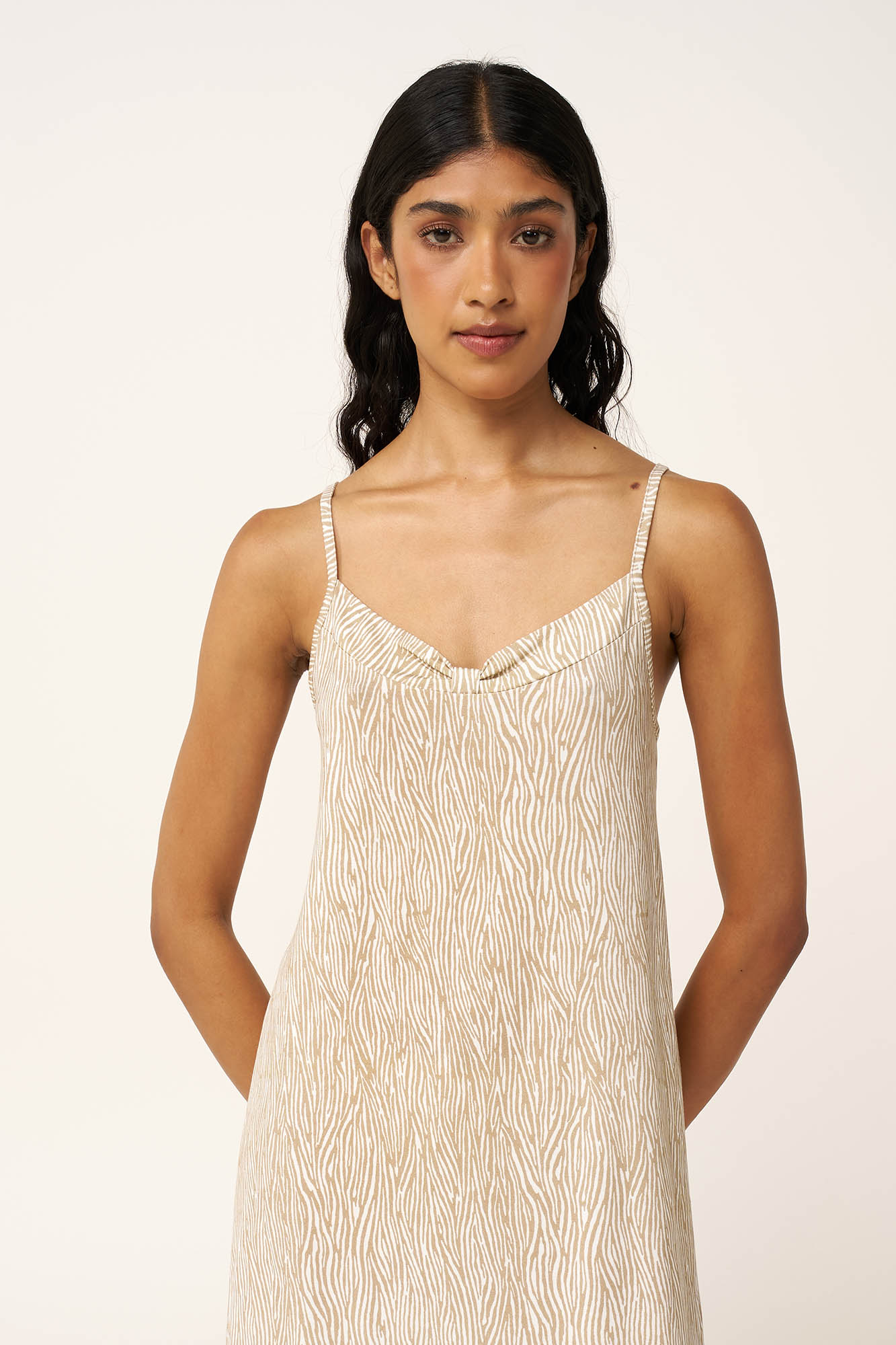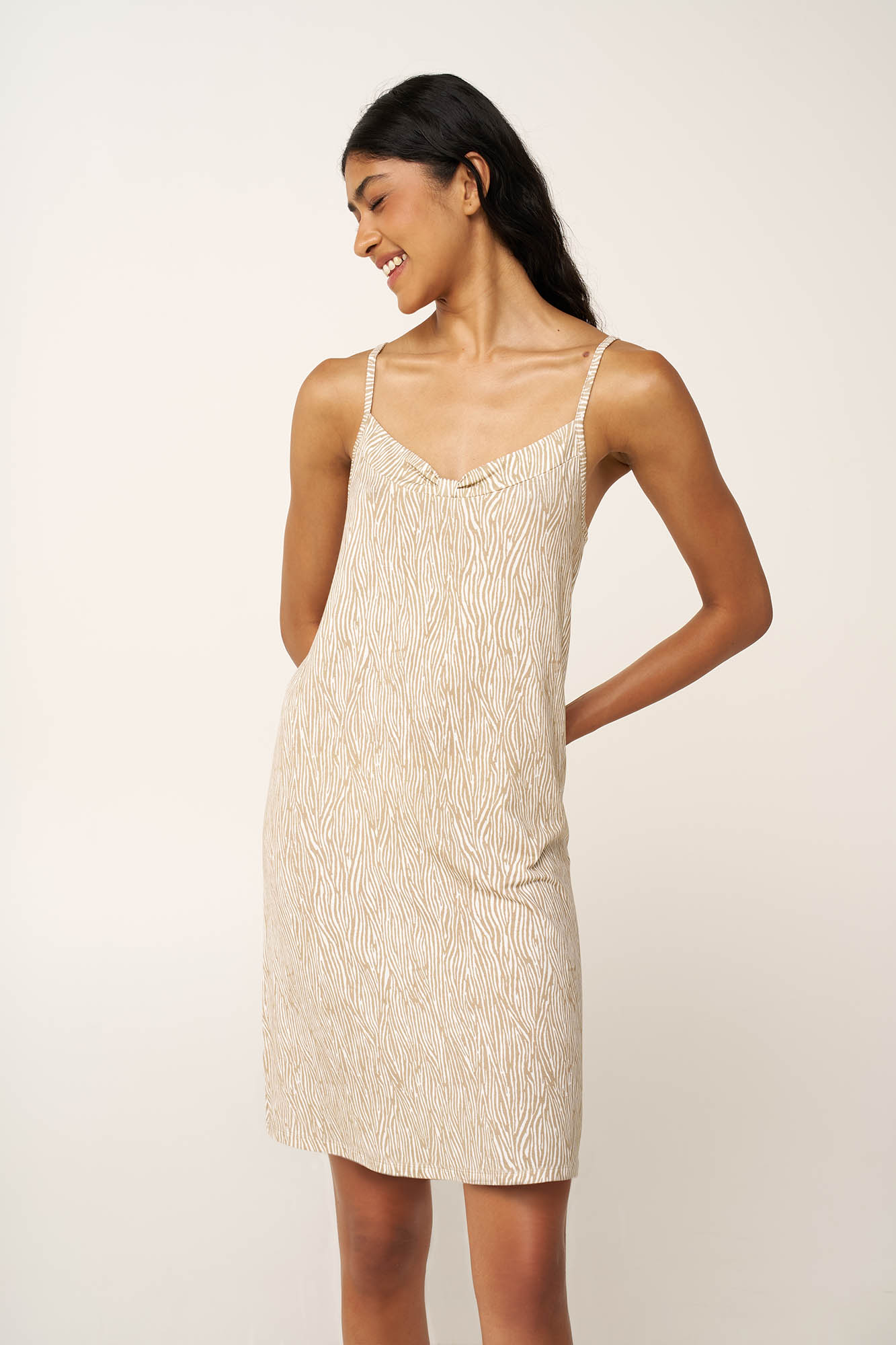 Επιλέξτε ένα καλοκαιρινό νυχτικό από εξαιρετικά απαλό LENZING Tencel Modal Micro και elastane. Το ζέβρα μοτίβο σε γήινες αποχρώσεις προσθέτει μια μοντέρνα νότα, ενώ οι λεπτές τιράντες και η χαμηλή V λαομόκοψη χαρίζει μια θηλυκή πινελιά στην εμφάνιση σας. Ανάλαφρο και διαπνέον είναι μια εύκολη επιλογή για τις ζεστές καλοκαιρινές νύχτες.