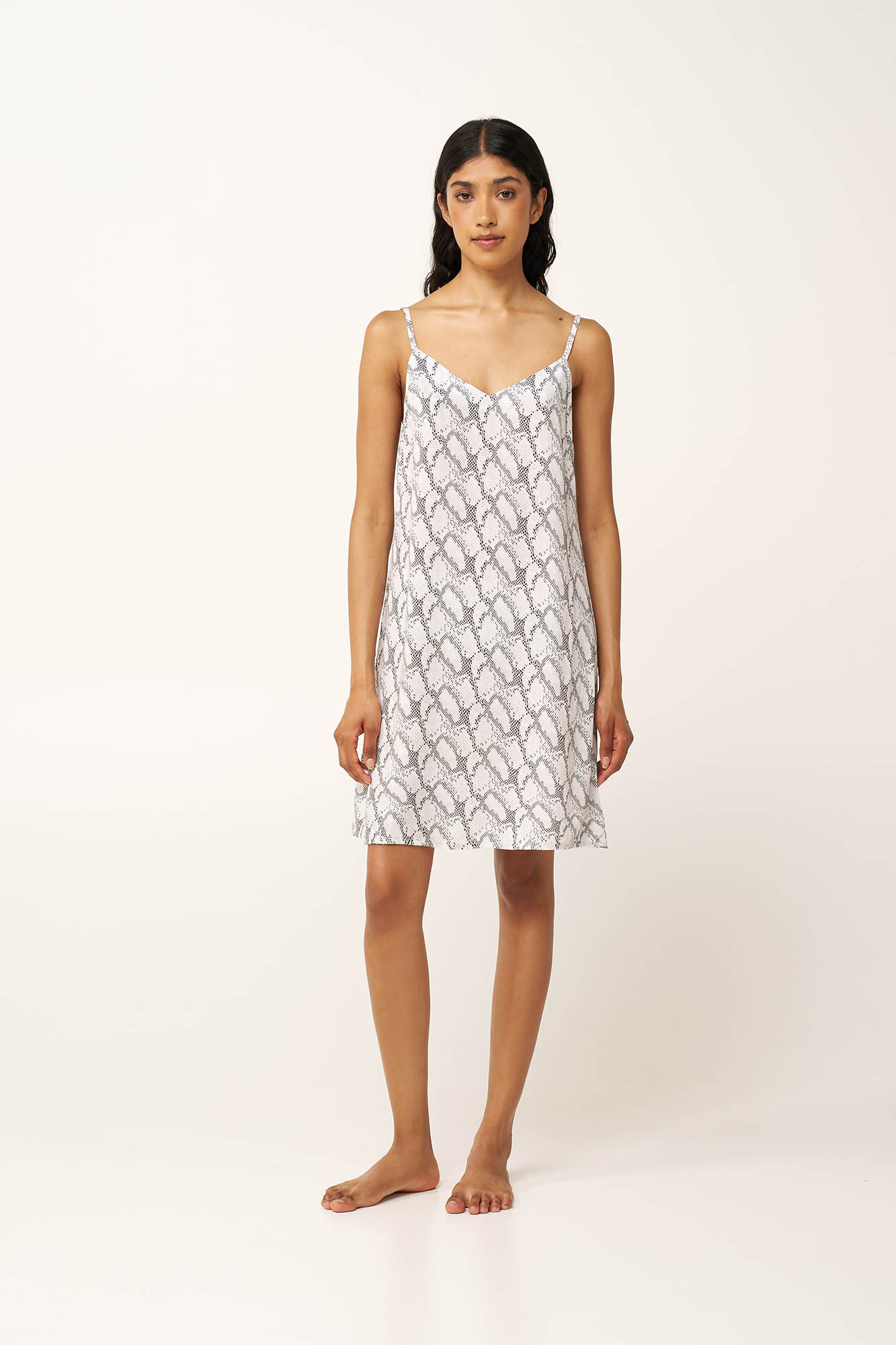 Επιλέξτε ένα καλοκαιρινό νυχτικό που αποπνέει γοητεία και θηλυκότητα, κατασκευασμένο από ελαφριά viscose ποπλίνα, προσφέροντας δροσερή αίσθηση που χαρίζει άνεση τις ζεστές ημέρες. Οι λεπτές τιράντες και χαλαρή γραμμή του δημιουργούν μια κομψή σιλουέτα ενώ το εντυπωσιακό snake print μοτίβο, προσθέτει μια διακριτική νότα αισθησιασμού. Μια ιδανική επιλογή για να απολαύσετε κάθε στιγμή της ημέρας στο σπίτι ή τις καλοκαιρινές σας διακοπές.