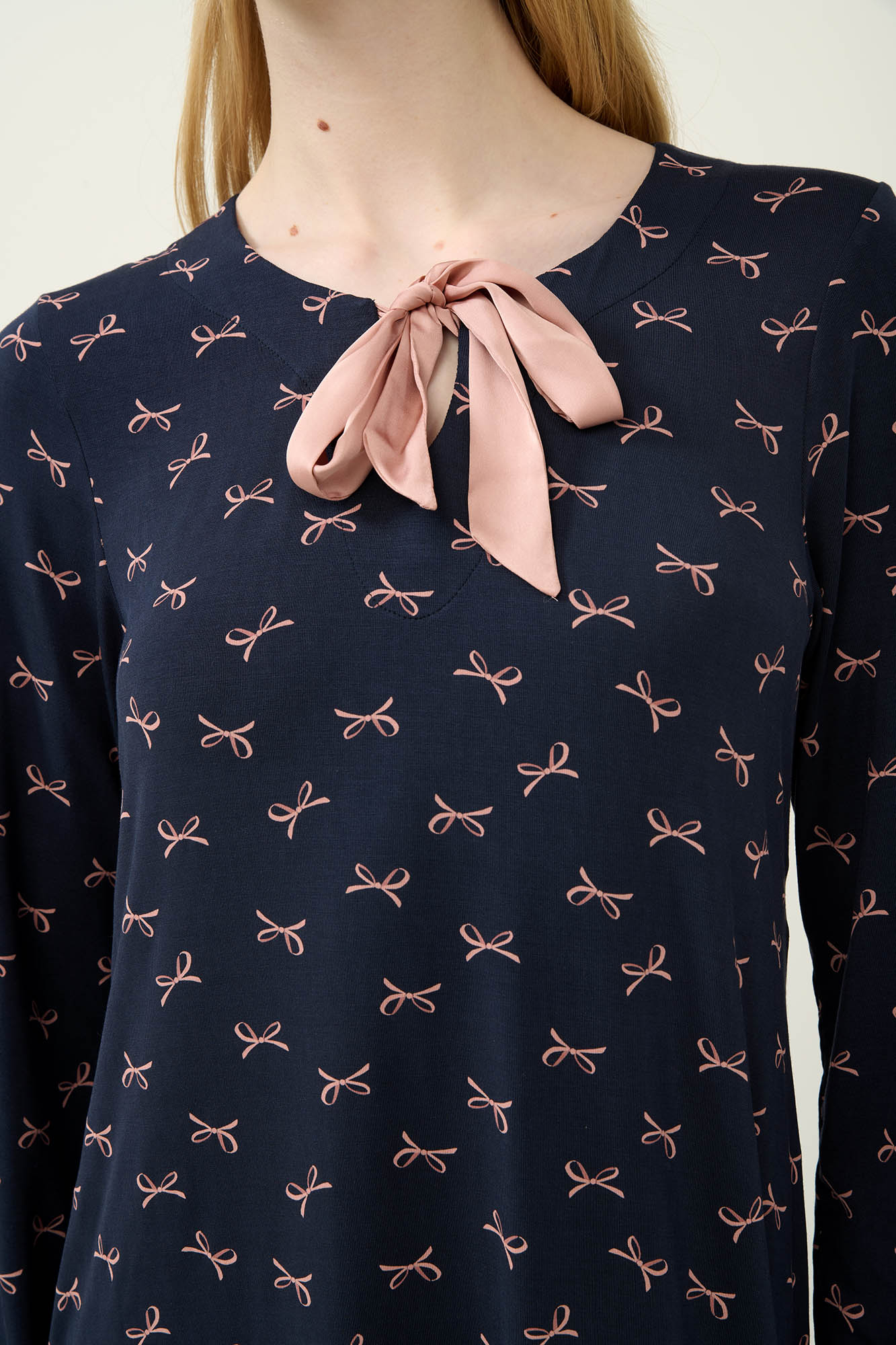 Χαλαρώστε με στυλ και άνεση φορώντας αυτό το υπέροχο γυναικείο νυχτικό, φτιαγμένο από εξαιρετικά απαλό LENZING Tencel Modal Micro που αγκαλιάζει ευχάριστα το σώμα. Ροζ φιογκάκια απλώνονται πάνω σε μπλε φόντο, δημιουργώντας ένα χαριτωμένο αλλά κομψό μοτίβο σε όλη την επιφάνεια. Η λαιμόκοψη διακοσμείται με ένα γλυκό σατέν φιογκάκι, προσθέτοντας μια έξτρα θηλυκή πινελιά. Τα μακριά μανίκια και το διαπνεόμενο ύφασμα εξασφαλίζουν άνεση χωρίς περιορισμούς, είτε χαλαρώνετε στο σπίτι είτε ετοιμάζεστε για έναν ήρεμο ύπνο.