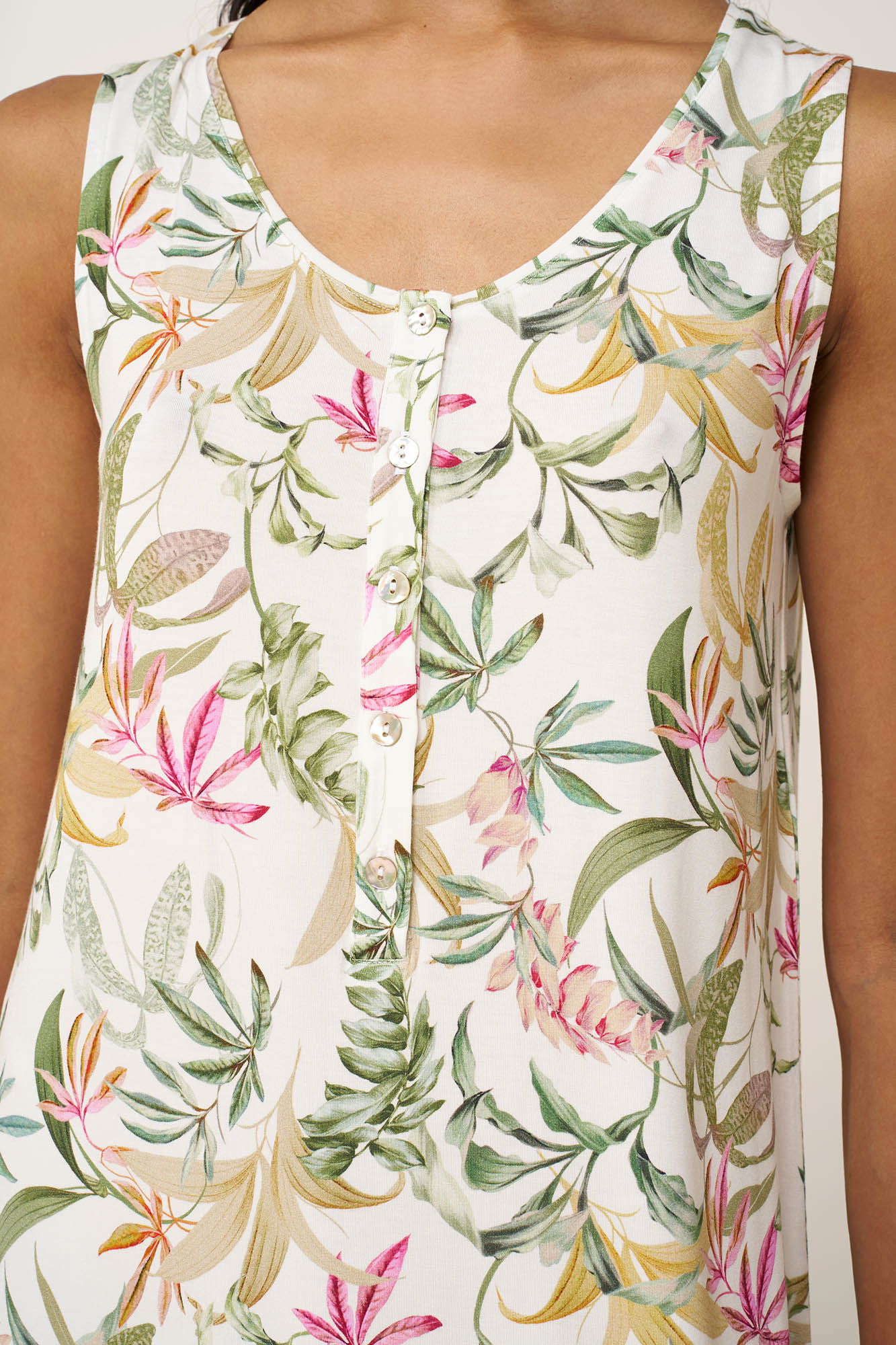 Αφεθείτε στην απόλυτη καλοκαιρινή άνεση με αυτό το πολυτελές αμάνικο νυχτικό, κατασκευασμένο από απαλό και διαπνέον LENZING Tencel Modal Micro. Η χαλαρή γραμμή του αγκαλιάζει ευχάριστα το σώμα, προσφέροντας ελευθερία κινήσεων και δροσερή αίσθηση τις ζεστές νύχτες. Σχεδιασμένο με κλασική πατιλέτα και ένα εκλεπτυσμένο botanical print που χαρίζει φυσική κομψότητα είναι μια ιδανική επιλογή για ήρεμα βράδια ή χαλαρές στιγμές στο σπίτι.
