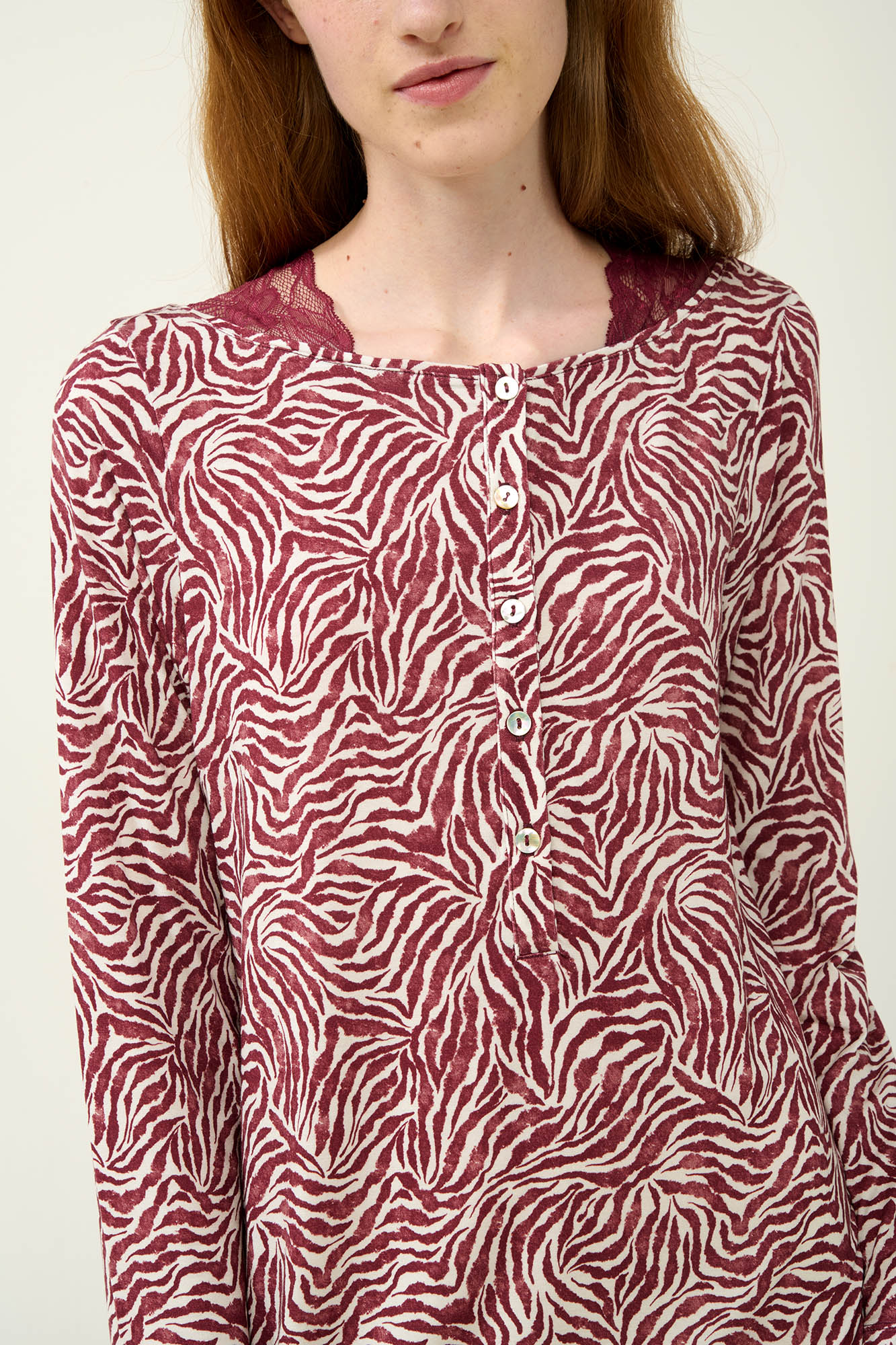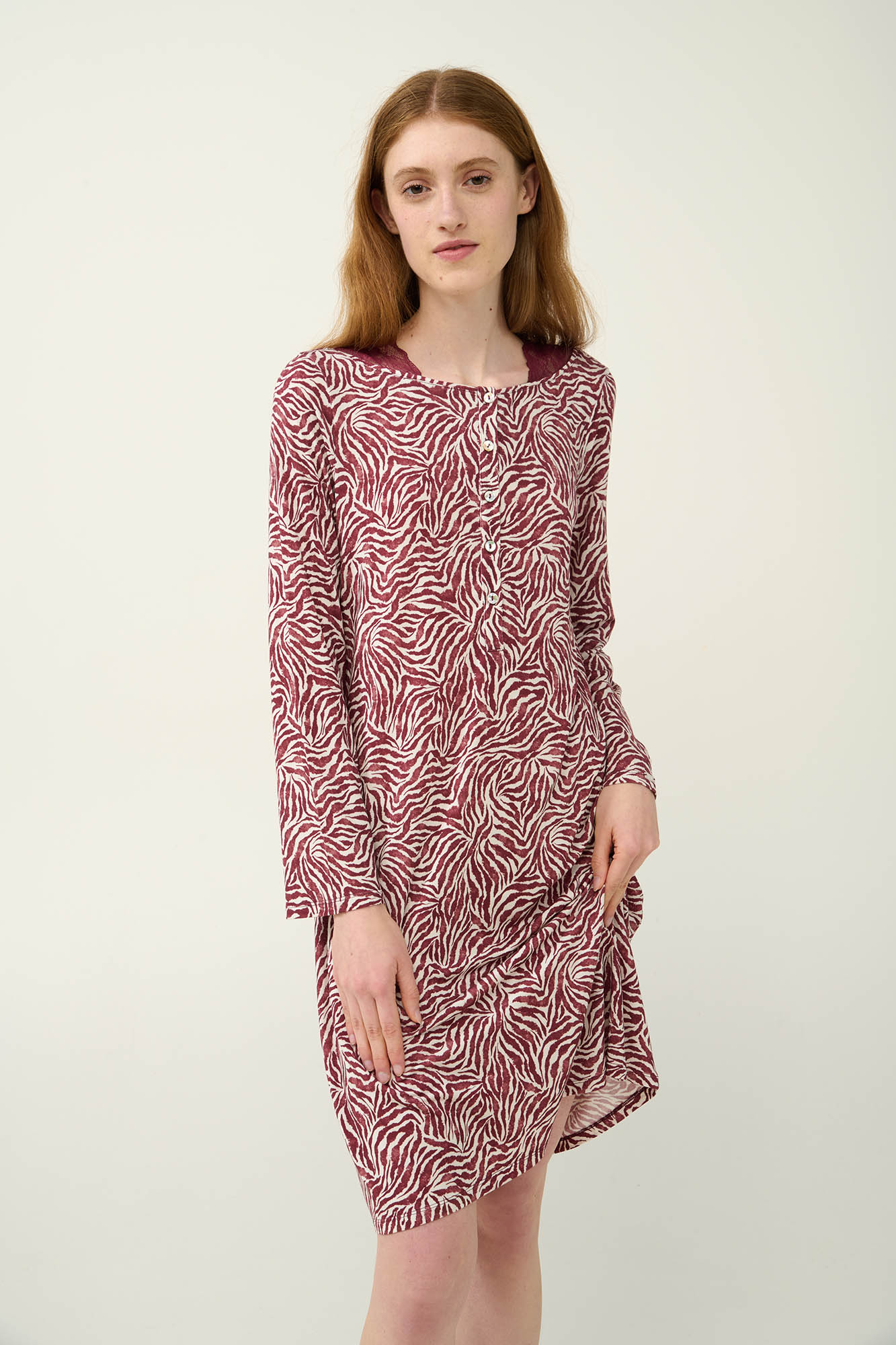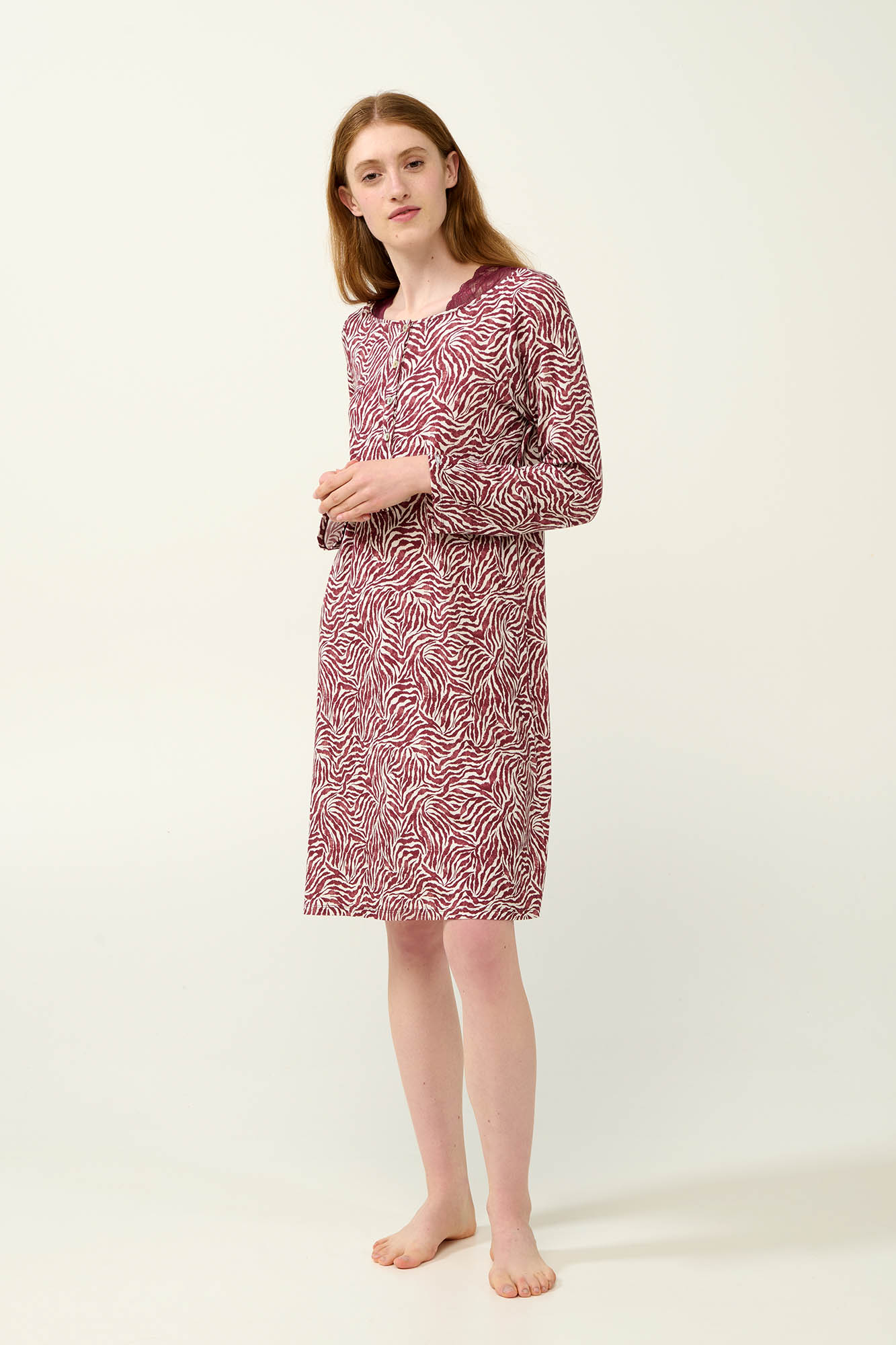 Ανακάλυψε την ιδανική ισορροπία ανάμεσα στην άνεση και το στυλ με αυτό το κομψό χειμερινό νυχτικό, φτιαγμένο από απαλό και διαπνέον LENZING Tencel Modal Micro. Σχεδιασμένο με πατιλέτα σε εκλεπτυσμένο μοτίβο ζέβρα σε λευκές - μπορντό αποχρώσεις και διακριτικές λεπτομέρειες από δαντέλα, που χαρίζουν μια αίσθηση πολυτέλειας. Ιδανικό για στιγμές χαλάρωσης στο τέλος μιας μεγάλης ημέρας.