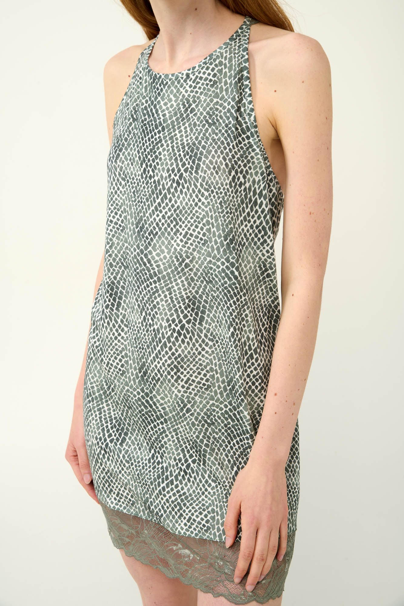 Αφεθείτε στην κομψότητα που σας προσφέρει αυτό το γοητευτικό νυχτικό με animal print μοτίβο σε πράσινη ανθρακί απόχρωση. Σχεδιασμένο με ανοιχτή πλάτη, διακοσμημένη με δαντέλα που κουμπώνει ψηλά στο λαιμό και δαντέλα στο κάτω μέρος είναι μια εξαιρετικά ρομαντική επιλογή που θα αναδείξει τη θηλυκότητα σας. Κατασκευασμένο από απαλό Lenzing Tencel Modal Micro που αγκαλιάζει ευχάριστα το σώμα θα σας βοηθήσει να απολαύσετε μοναδικές στιγμές χαλάρωσης.