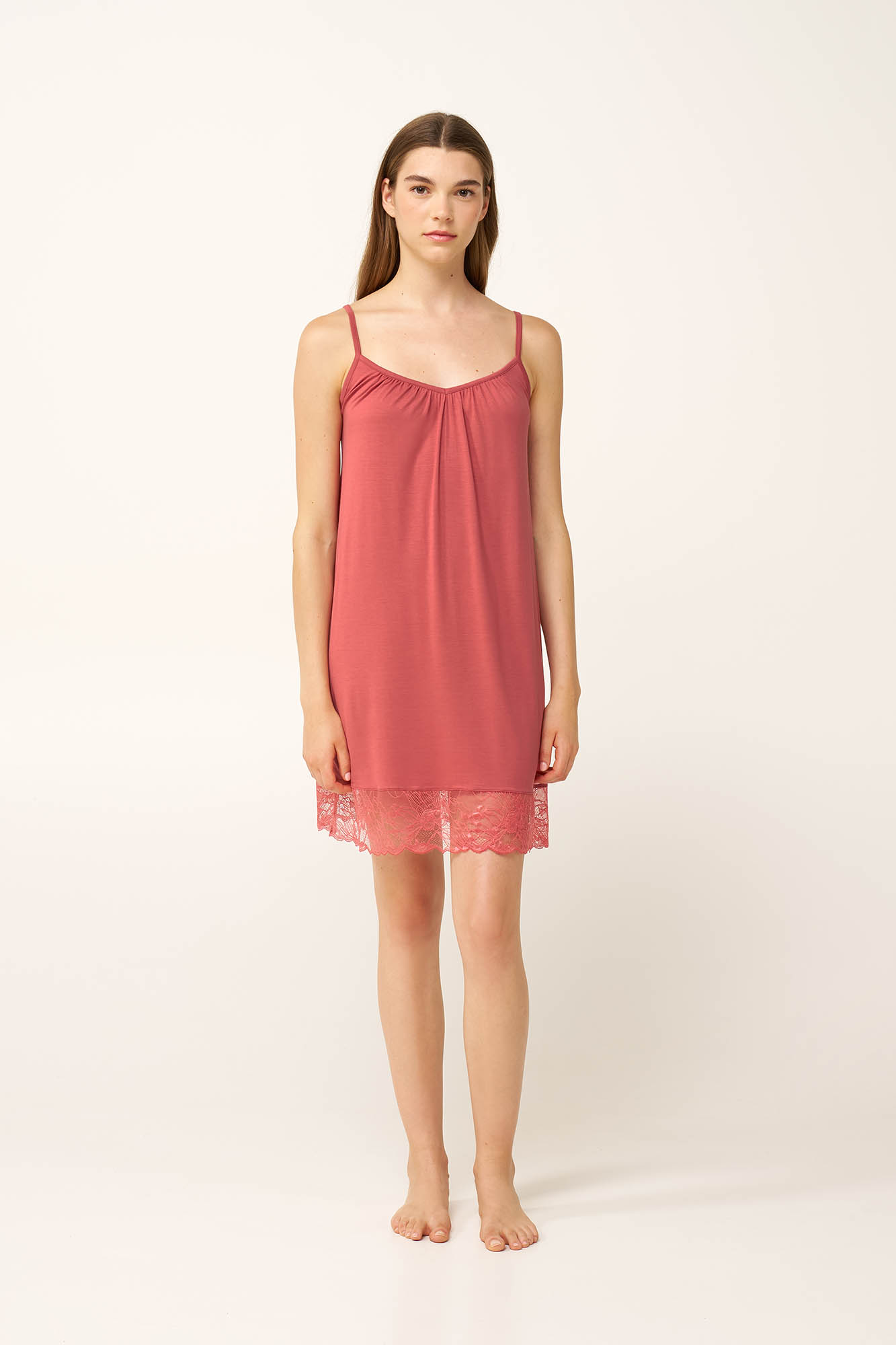 Απαλό, αέρινο και θηλυκό, αυτό το νυχτικό με λεπτές τιράντες είναι κατασκευασμένο από LENZING Tencel Modal Micro, προσφέροντας εξαιρετικά λεία και διαπνέουσα αίσθηση. Σχεδιασμένο για ζεστές καλοκαιρινές νύχτες, με ανάλαφρη γραμμή, πέφτει απαλά πάνω στο σώμα, χαρίζοντας άνεση χωρίς να κολλάει στο δέρμα. Οι διακριτικές σούρες στο στήθος προσθέτουν μια ρομαντική νότα, ενώ οι λεπτομέρειες δαντέλας στο τελείωμα ενισχύουν το θηλυκό του χαρακτήρα.