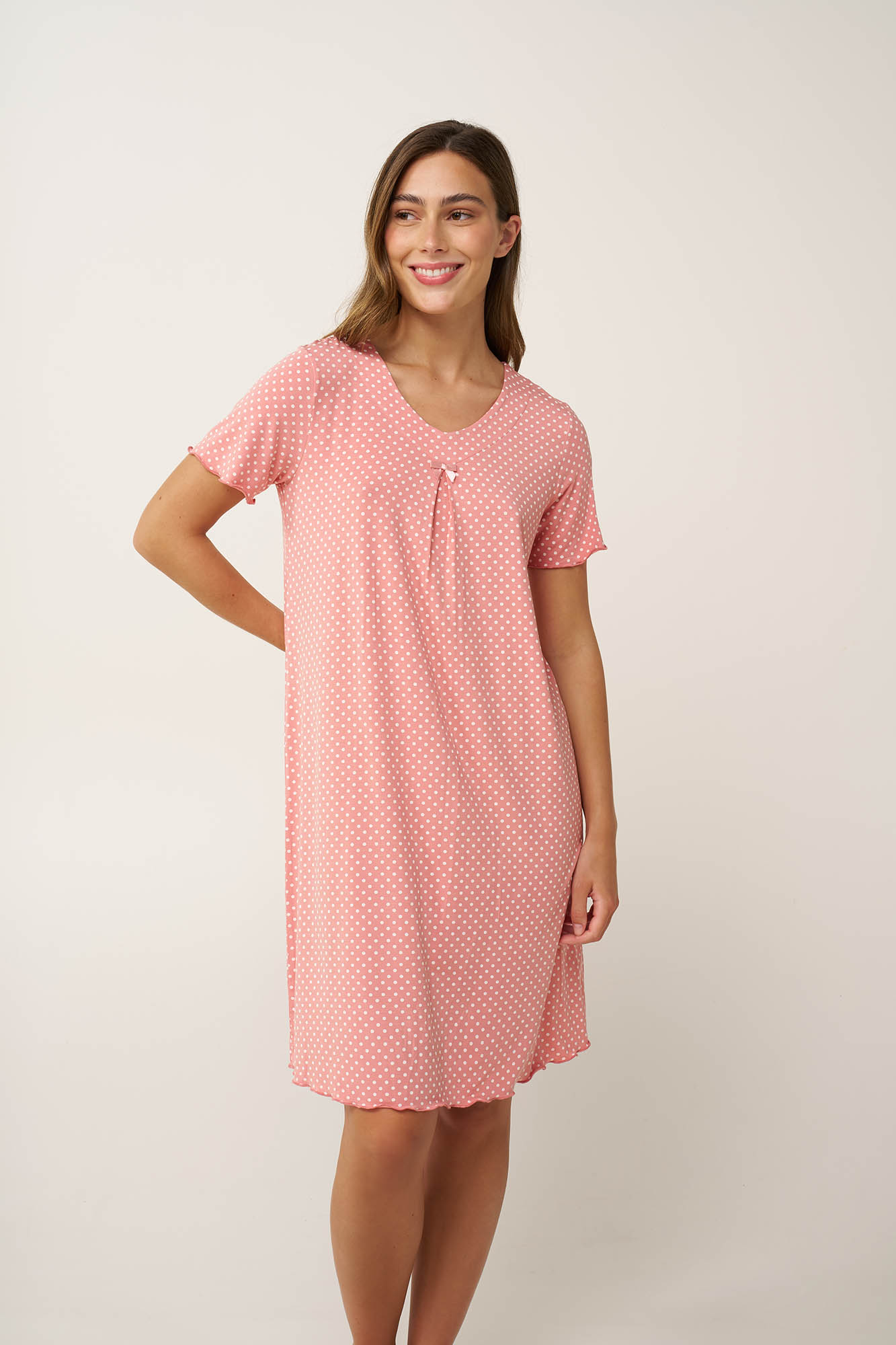 Τις ζεστές καλοκαιρινές νύχτες, αφεθείτε στην ανάλαφρη αίσθηση, που προσφέρει αυτό το γοητευτικό νυχτικό, κατασκευασμένο από εξαιρετικά απαλό και δροσερό LENZING Tencel Modal Micro. Το κλασικό λευκό πουά πάνω σε ροζ φόντο χαρίζει μια παιχνιδιάρικη, vintage κομψότητα, ιδανική για το καλοκαίρι. Τα κοντά μανίκια και η πιέτα στο μπροστινό μέρος προσφέρουν άνεση και ελευθερία κινήσεων, ενώ η διακριτική ελαστικότητα του υφάσματος εξασφαλίζει ευχάριστη εφαρμογή. Ιδανικό τόσο για στιγμές χαλάρωσης ή έναν ήρεμο, ξεκούραστο ύπνο.