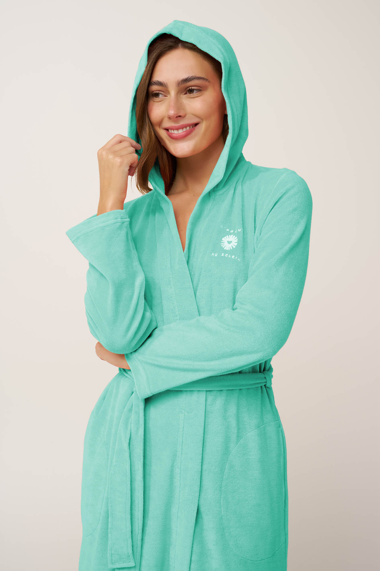 Αγκαλιάστε τις γαλήνιες καλοκαιρινές στιγμές όπως σας αγκαλιάζει αυτή η το καλοκαιρινή ρόμπα από απαλό frottee ύφασμα με υψηλή περιεκτικότητα σε βαμβάκι. Σχεδιασμένη με μακριά μανίκια, σταυρωτό μπροστινό κλείσιμο με ζώνη που δένει στη μέση, πρακτικές πλαϊνές τσέπες και κουκούλα, θα σας τυλίξει απαλά με άνεση και απορροφητικότητα . Με δροσερή απόχρωση που αποπνέει καλοκαιρινή αύρα, θα φορεθεί με ευκολία στην παραλία ή την πισίνα.