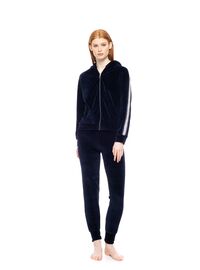 Γυναικεία φόρμα βελουτέ Pink Label σε sand χρώμα. Μπλούζα με στρογγυλή λαιμόκοψη και λάστιχο στα τελειώματα διακοσμημένο με λευκές και ροζ ρίγες. Παντελόνι σε ίσια γραμμή με μαλακό λάστιχο στην μέση και τσέπες.