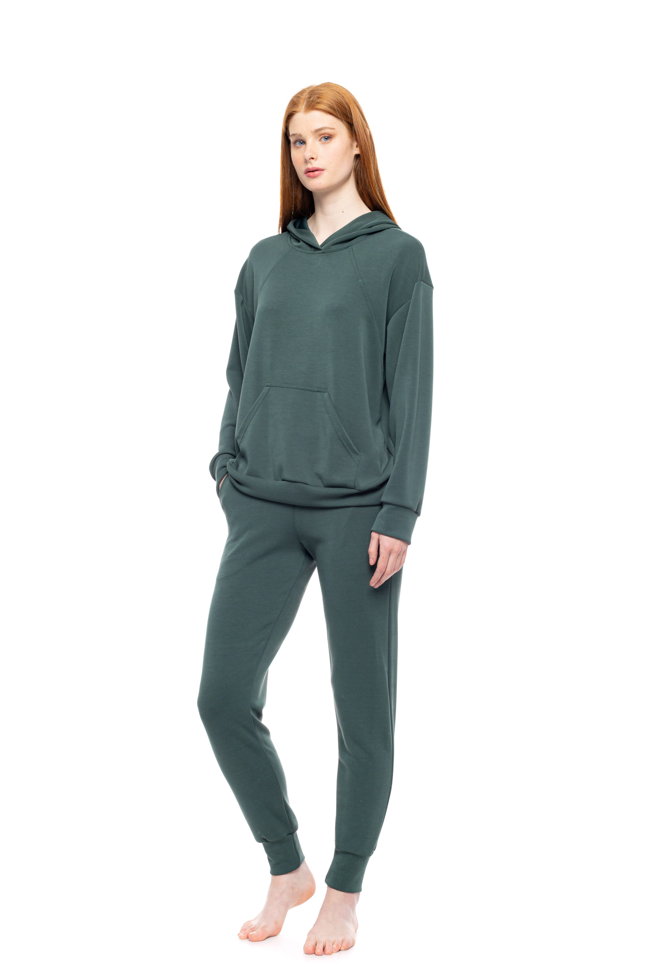 Γυναικεία φόρμα Pink Label. Dark Green μακρυμάνικη με λάστιχο στα τελείωματα της μπλούζας, κουκούλα και μεγάλη τσέπη μπροστά. Μακρύ μονόχρωμο παντελόνι σε ίσια γραμμή με μαλακό λάστιχο στην μέση και στους αστραγάλους.