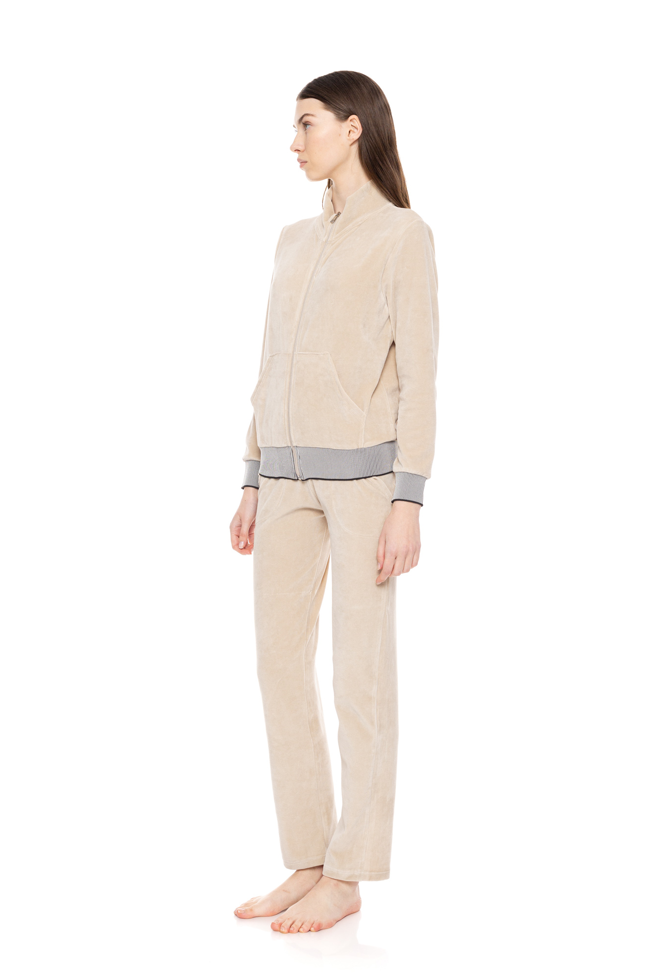 Γυναικεία φόρμα Pink Label βελουτέ σε skin χρώμα με τσέπες. Ζακέτα με φερμουάρ και λάστιχο στα μανίκια και την μέση με μαύρες ρίγες. Παντελόνι σε ίσια γραμμή με μαλακό λάστιχο στην μέση.