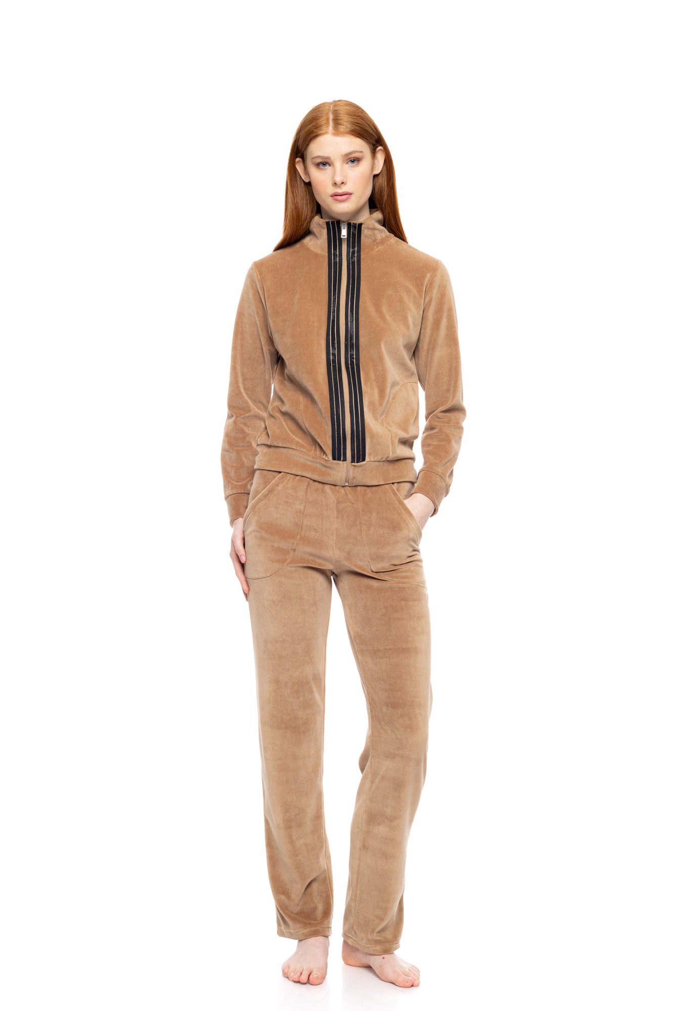 Γυναικεία φόρμα Pink Label βελουτέ σε sand χρώμα με τσέπες. Ζακέτα διακοσμημένη με στρας στο φερμουάρ , μανσέτες στα μανίκια και την μέση. Παντελόνι σε ίσια γραμμή με μαλακό λάστιχο στην μέση.