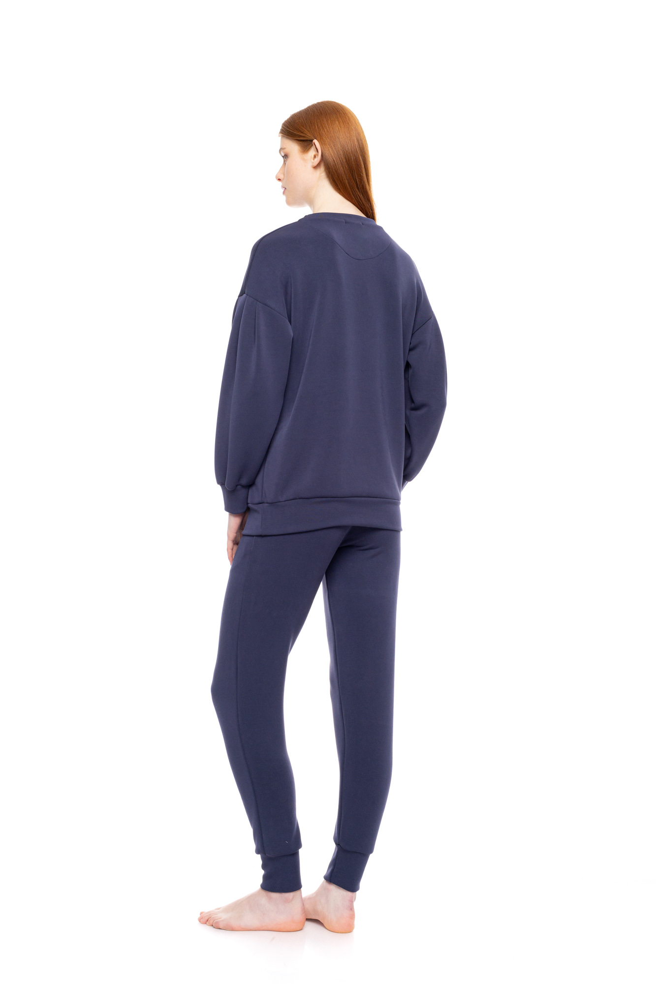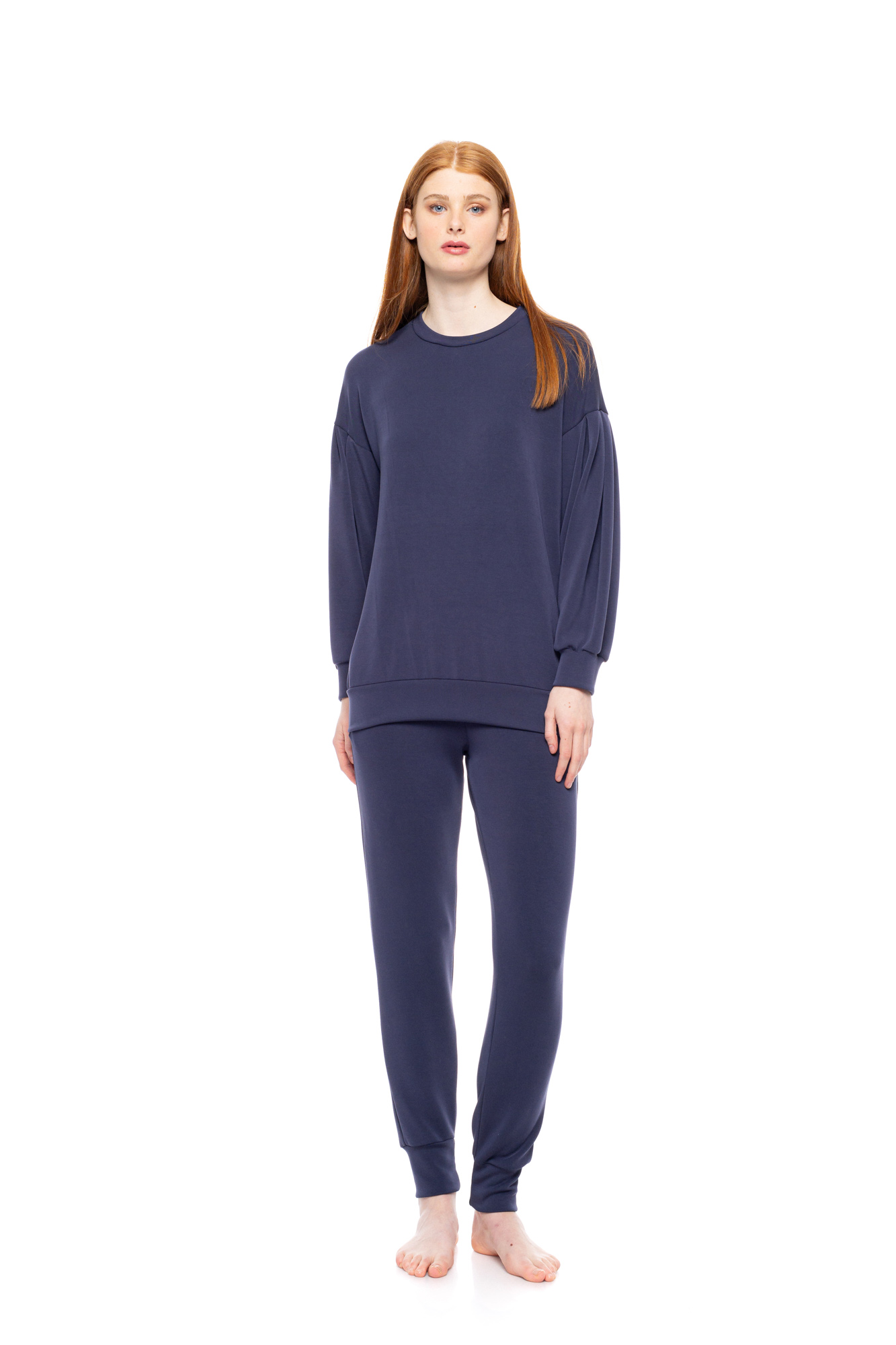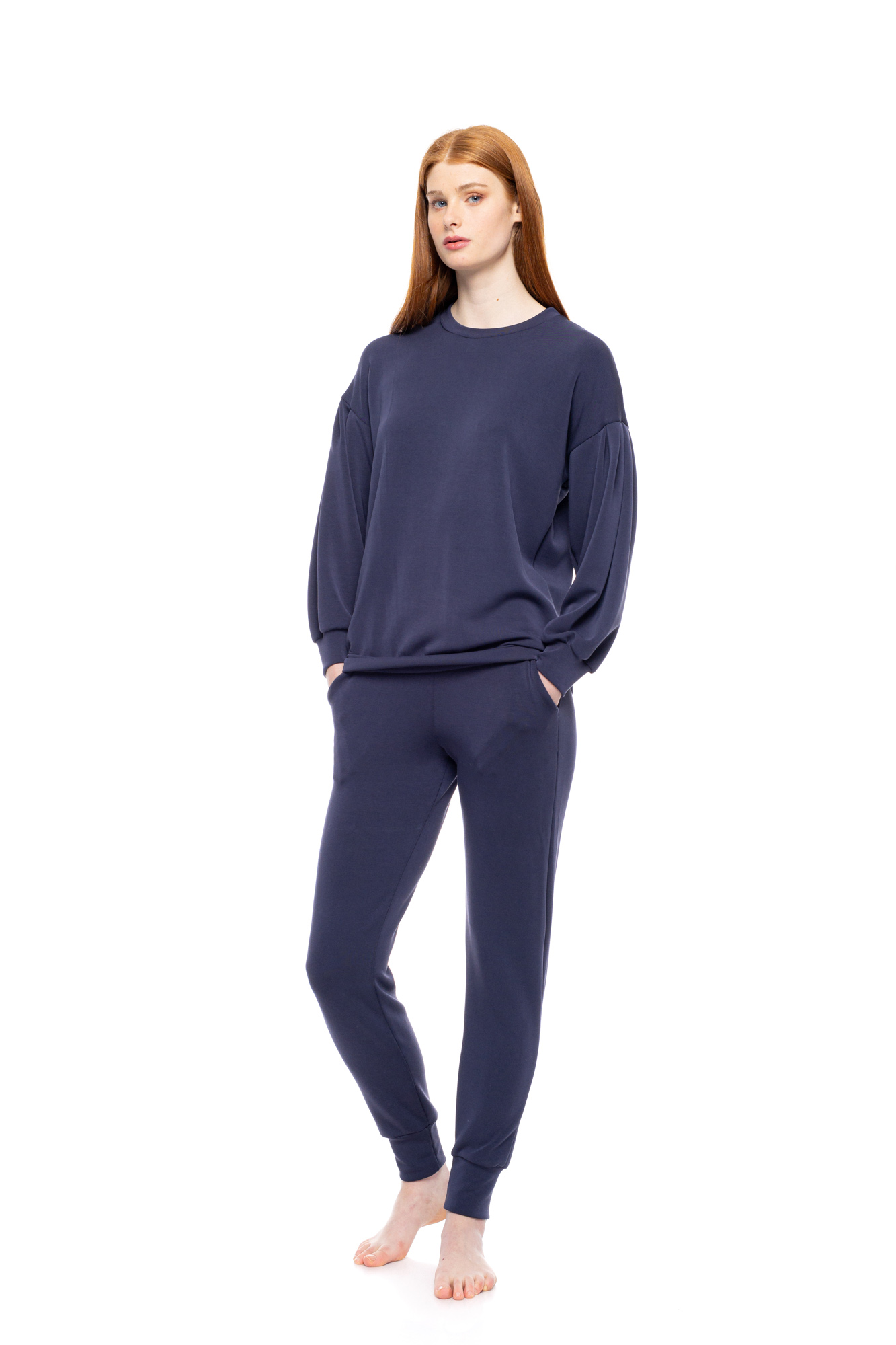 Γυναικεία φόρμα Pink Label. Skin μακρυμάνικη με λάστιχο στα τελείωματα της μπλούζας και εντυπωσιακά πλούσια μανίκια. Μακρύ μονόχρωμο παντελόνι σε ίσια γραμμή με μαλακό λάστιχο στην μέση και στους αστραγάλους.