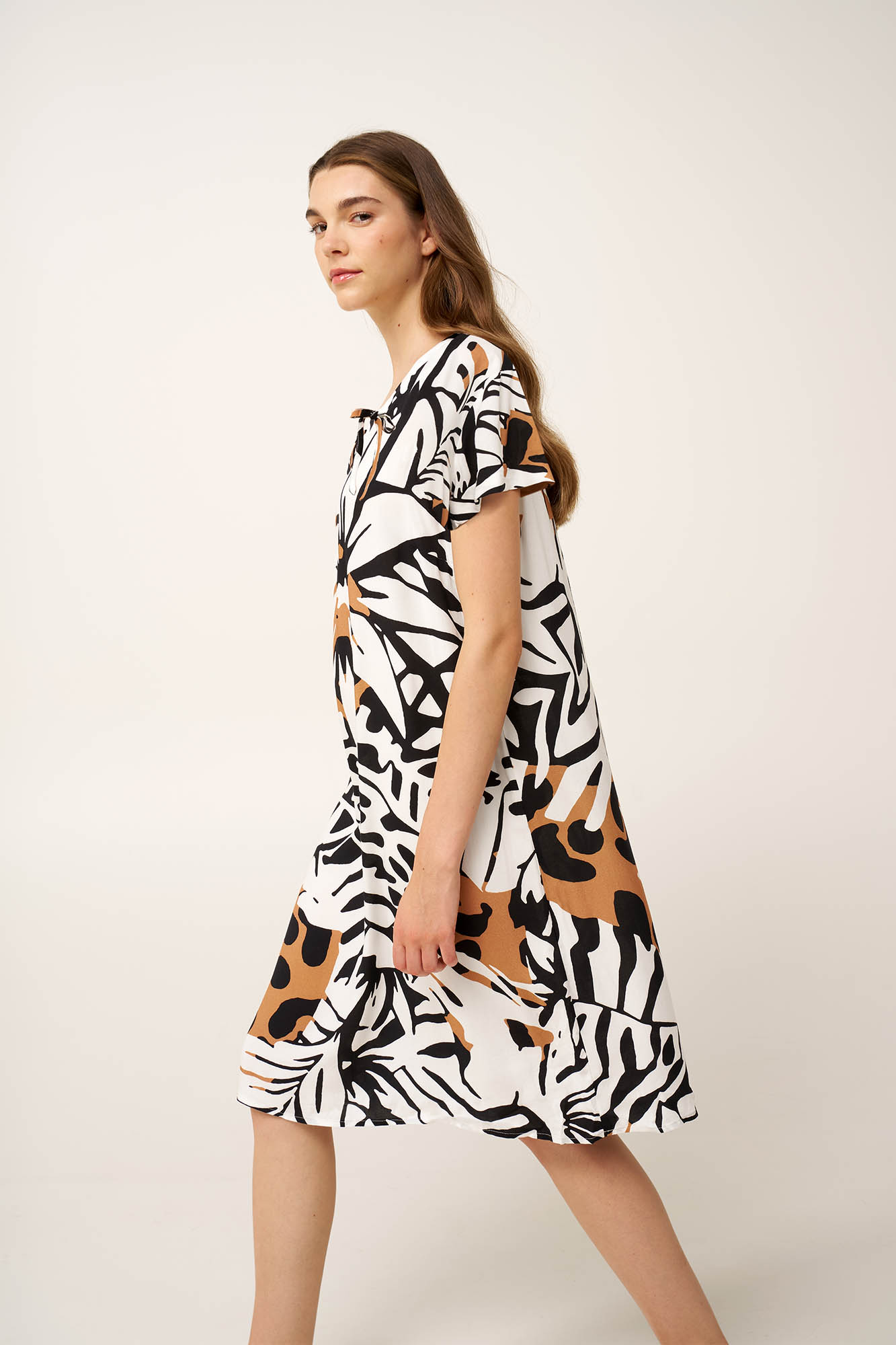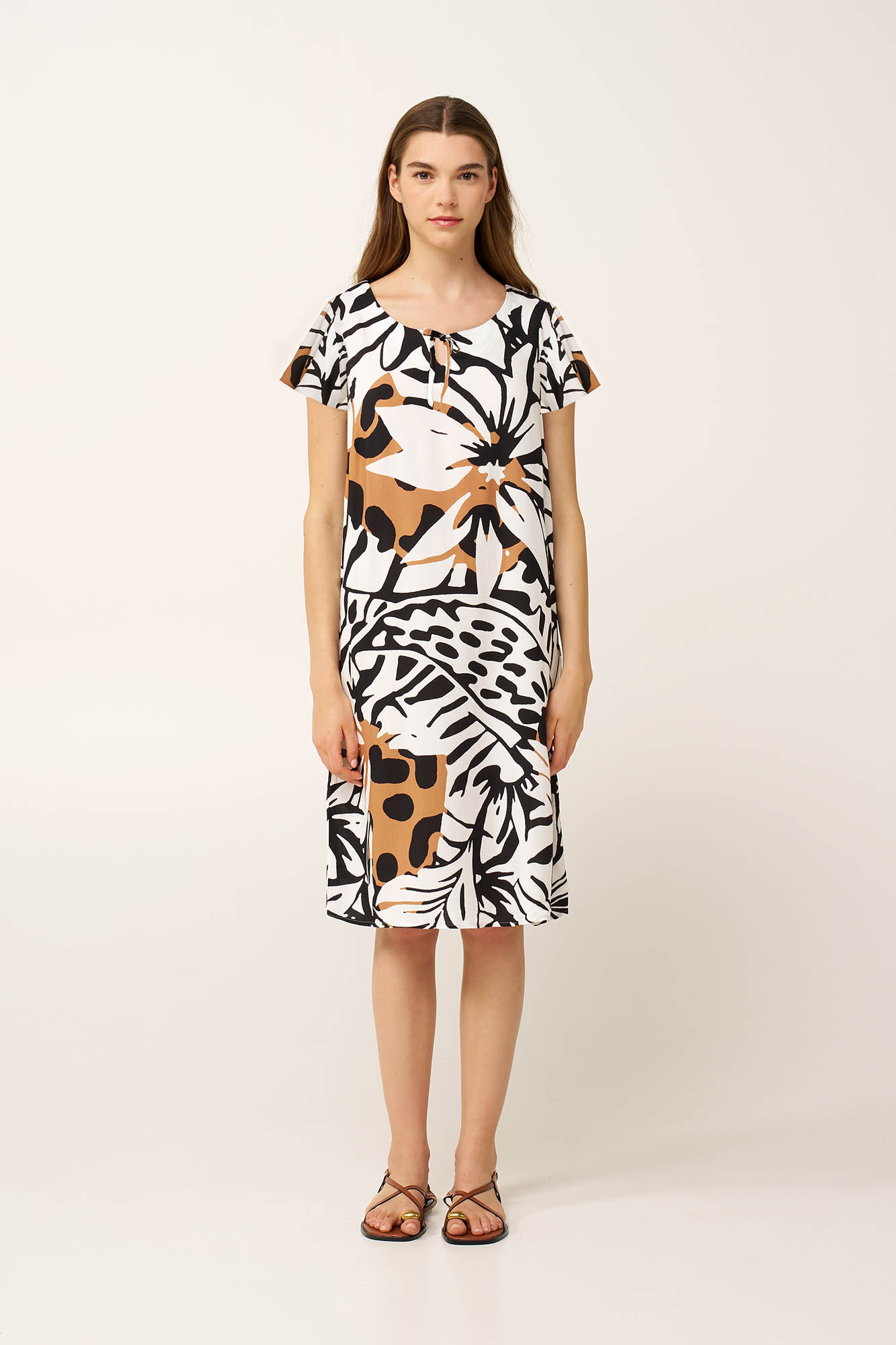 Επιλέξτε αυτό το κομψό καλοκαιρινό φόρεμα, κατασκευασμένο από διαπνέον μείγμα ποπλίνας, viscose και λινού. Σχεδιασμένο με κοντά μανίκια και άνετη γραμμή, προσφέρει δροσερή εφαρμογή και κίνηση σε κάθε βήμα. Ολοκληρωμένο με oversized τροπικά φύλλα σε ασπρόμαυρο print, και ζεστούς τόνους της άμμου που προσθέτουν βάθος και χαρακτήρα. Διαχρονικό αλλά και εκφραστικό, αυτό το κομμάτι είναι ιδανικό για resort εμφανίσεις και ηλιόλουστα σκηνικά όπου η δυναμική συναντά την ανεπιτήδευτη κομψότητα.