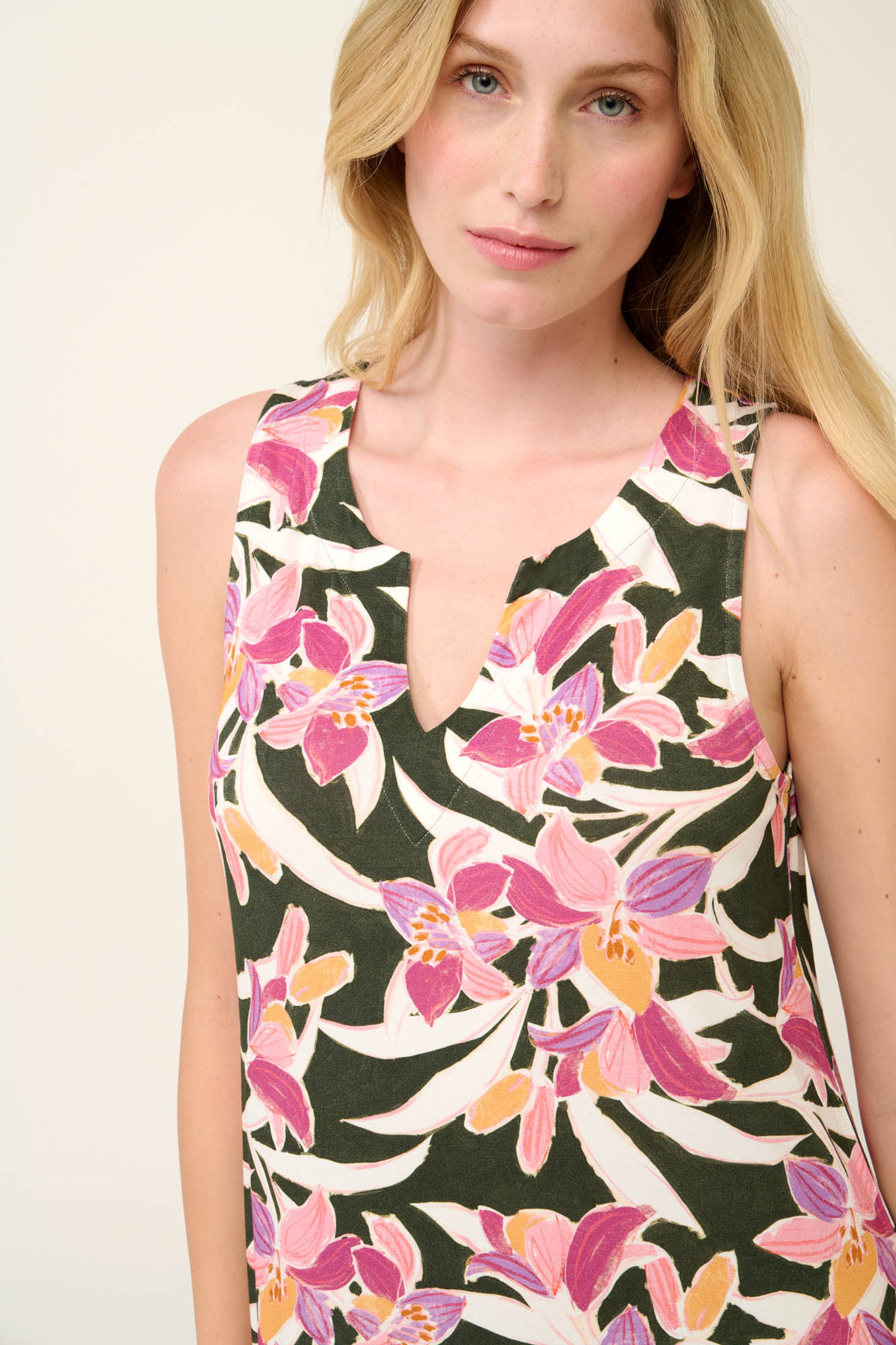 Παραμείνετε άνετη και ανάλαφρη με ένα αμάνικο καλοκαιρινό φόρεμα, σε δροσερό μοτίβο ακουαρέλας με κρίνα Σχεδιασμένο για αβίαστη κομψότητα, διαθέτει μια μοντέρνα V λαιμόκοψη και κλασική γραμμή που κολακεύει κάθε σιλουέτα. Κατασκευασμένο από μαλακή, ελαστική viscose, προσφέρει άνεση και ελευθερία κινήσεων. Ιδανικό για ζεστές ημέρες, τη παραλία ή χαλαρές εμφανίσεις.