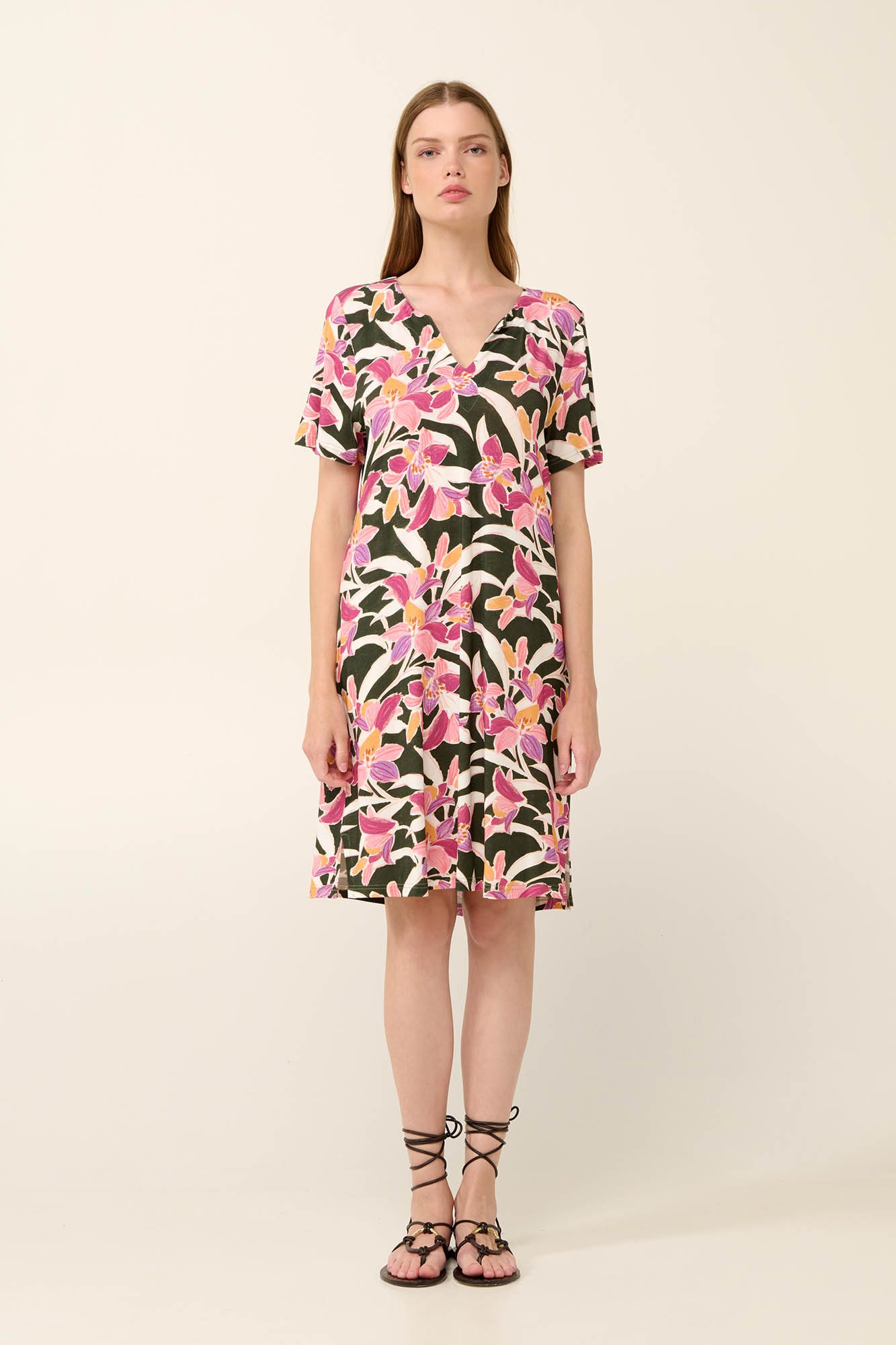 Μεταφερθείτε σε έναν τροπικό παράδεισο με ένα αέρινο καλοκαιρινό φόρεμα, διακοσμημένο με ένα ζωηρό μοτίβο ακουαρέλας με κρίνα. Εμπνευσμένο από την ομορφιά της φύσης, οι ζωντανές αποχρώσεις, το κομψό φλοράλ σχέδιο και το V ντεκολτέ αποπνέουν φρεσκάδα και γοητεία. Κατασκευασμένο από απαλή, ελαστική viscose, αγκαλιάζει ευχάριστα το σώμα ενώ προσφέρει άνεση στην κίνηση. Ιδανικό για ηλιόλουστες βόλτες ή καλοκαιρινά πάρτι.