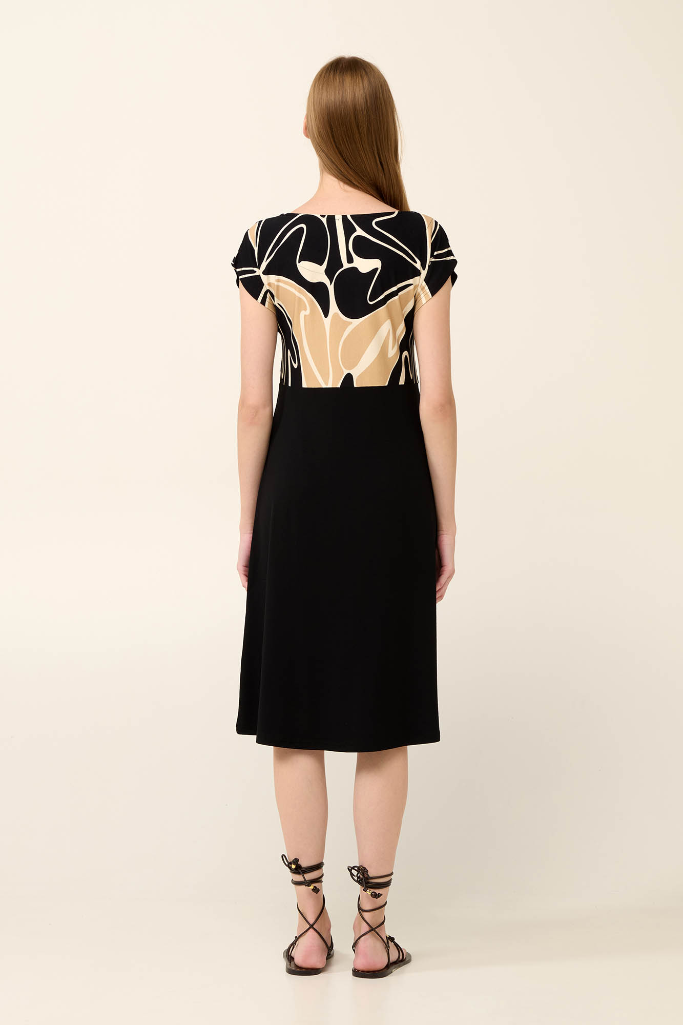 Ελέγκαντο και αβίαστα κομψό, αυτό το καλοκαιρινό φόρεμα διαθέτει ένα αφηρημένο φλοράλ σχέδιο σε σκίτσο σε συνδυασμό με μια μονόχρωμη μαύρη φούστα για εντυπωσιακή αντίθεση. Κατασκευασμένο από μαλακή, ελαστική βισκόζη, προσφέρει ελαφριά αίσθηση που αναπνέει. Μια κολακευτική λεπτομέρεια στη μέση με μια statement αγκράφα ενισχύει τη σιλουέτα, ενώ τα μανίκια με καπάκι και η ρευστή φούστα σε μήκος μίντι δημιουργούν μια διαχρονική, θηλυκή εμφάνιση - ιδανική για καθημερινό και νυχτερινό στυλ.