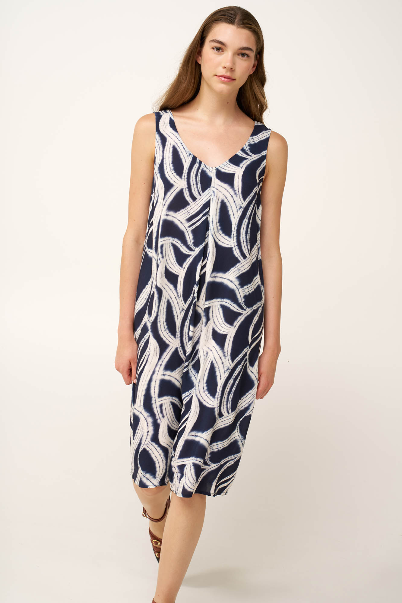 Αγκαλιάστε τις ηλιόλουστες μέρες με αυτό το κομψό καλοκαιρινό φόρεμα, κατασκευασμένο από 100% viscose ποπλίνα που προσφέρει απαλή και διαπνέουσα αίσθηση. Είναι σχεδιασμένο με πιέτα στο μπροστινό μέρος που χαρίζει χαλαρή εφαρμογή και κίνηση. Το αφηρημένο εκρού μοτίβο πάνω σε βαθύ μπλε καμβά, δημιουργεί εντυπωσιακή αντίθεση και σύγχρονο, εκφραστικό χαρακτήρα. Ιδανικό για καλοκαιρινές βόλτες, στιγμές δίπλα στη θάλασσα και χαλαρά απογεύματα.