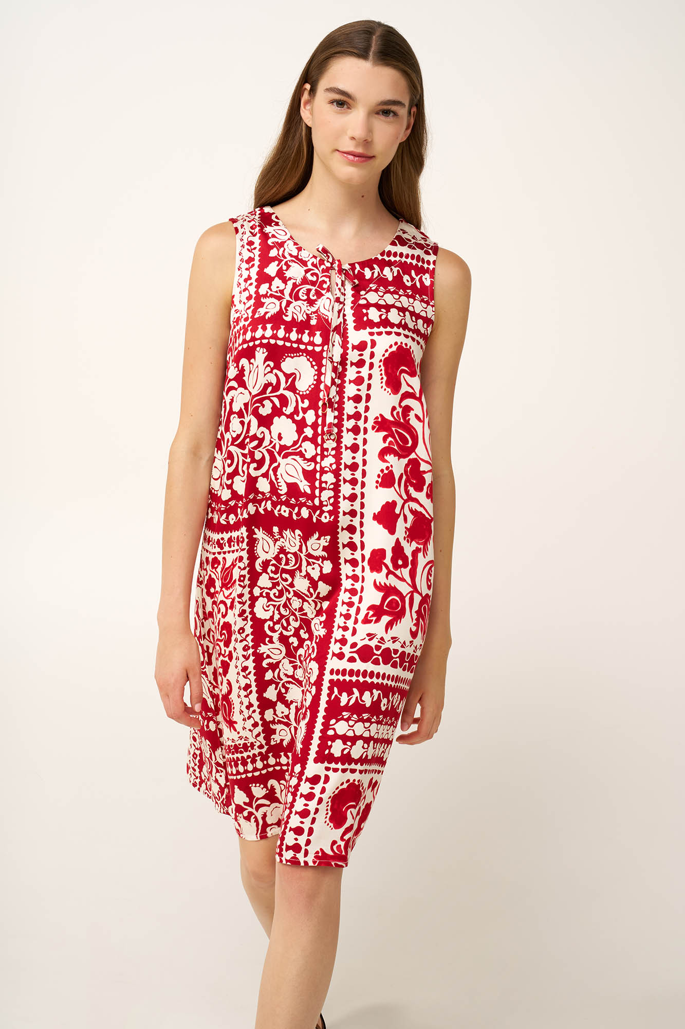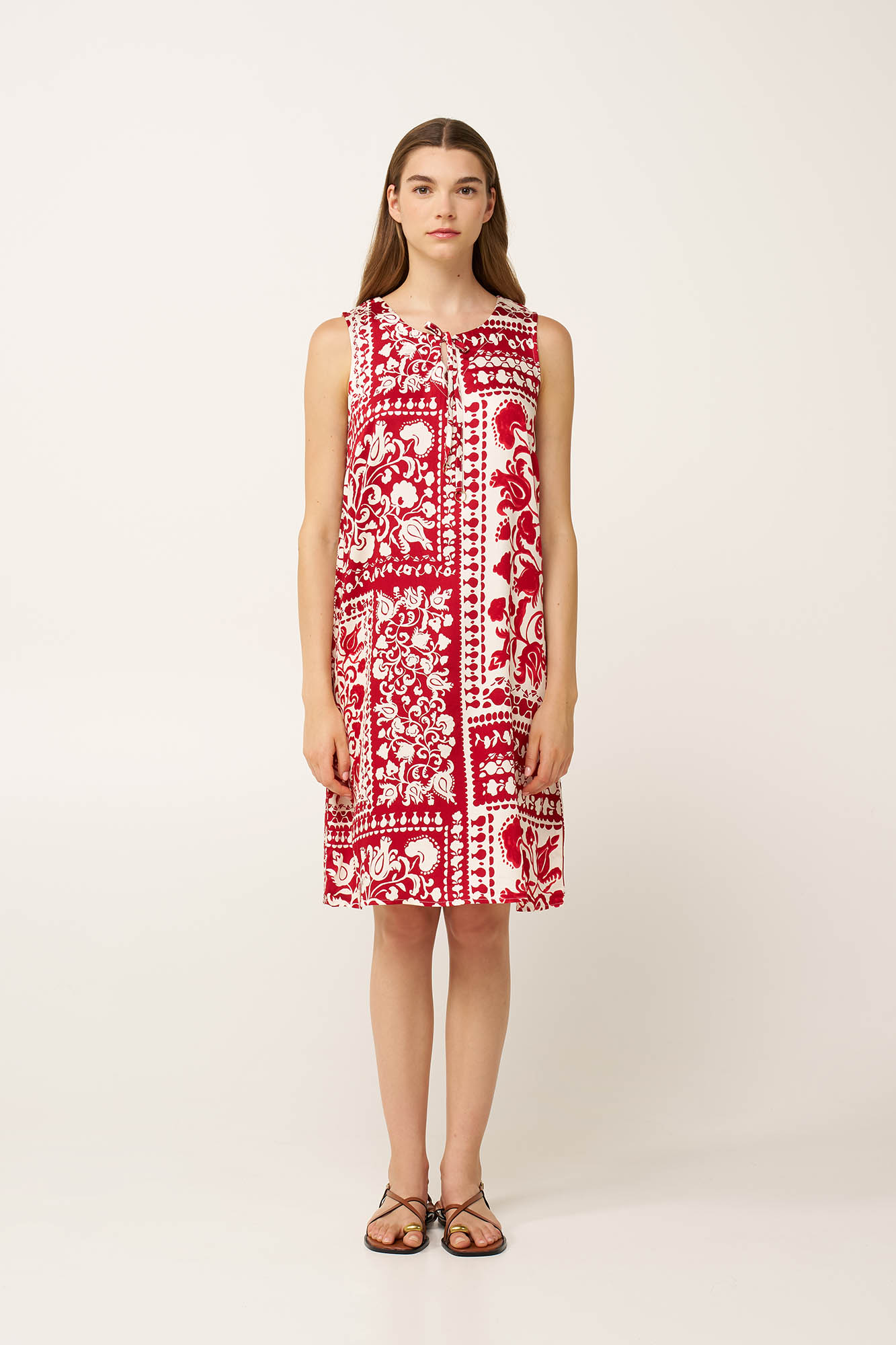 Ελαφρύ, αέρινο και ιδανικό για ηλιόλουστες μέρες, αυτό το καλοκαιρινό φόρεμα είναι κατασκευασμένο από διαπνέουσα 100% viscose ποπλίνα, προσφέροντας ανεπιτήδευτη καλοκαιρινή άνεση. Η λαιμόκοψη δένει μπροστά, προσθέτοντας μια απαλή, θηλυκή νότα, ενώ το μωσαϊκό από παραδοσιακά μοτίβα σε κόκκινο τερακότα, αποπνέει ζεστασιά και χαρακτήρα. Εύκολο και φυσικά εκφραστικό, το φόρεμα θα φορεθεί με άνεση από βόλτες δίπλα στη θάλασσα σε χαλαρές καλοκαιρινές συναντήσεις.