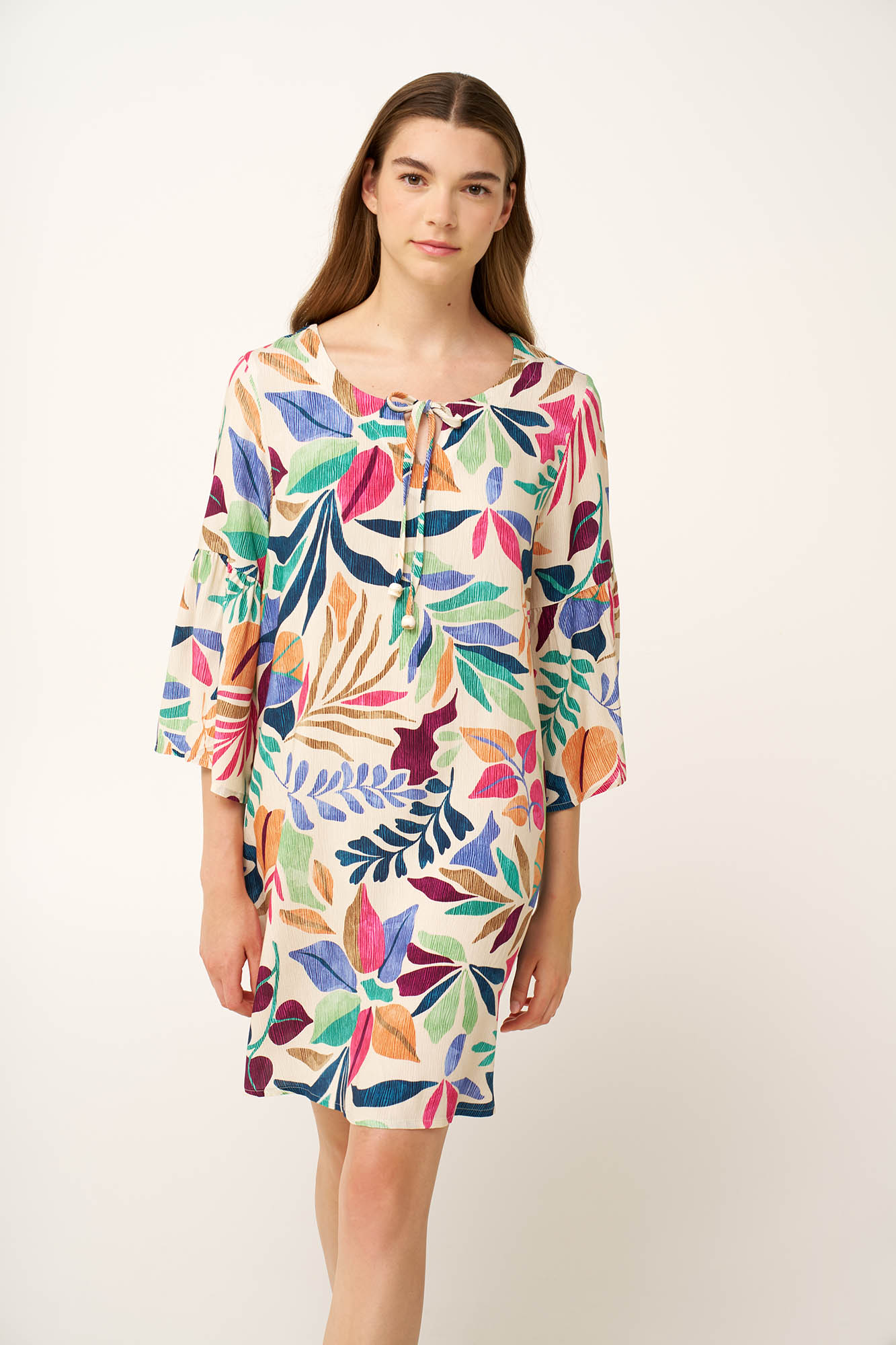 Μια δασερή προσέγγιση στο καλοκαιρινό ντύσιμο, αυτό το φόρεμα είναι κατασκευασμένο από διαπνέουσα 100% viscose ποπλίνα, προσφέροντας απαλή και αέρινη αίσθηση καθ’ όλη τη διάρκεια της ημέρας. Η άνετη σιλουέτα και τα χαλαρά του μανίκια προσθέτουν κίνηση σε κάθε βήμα. ενώ ένα print που αποτυπώνει έναν ζωντανό «χορό» από oversized φύλλα του Ειρηνικού, χαρίζει φωτεινότητα και γοητεία. Εκφραστικό και ανάλαφρο, είναι ιδανικό για ηλιόλουστες αποδράσεις, χαλαρές βόλτες το Σαββατοκύριακο ή για να απολαμβάνετε τον ρυθμό του καλοκαιριού.