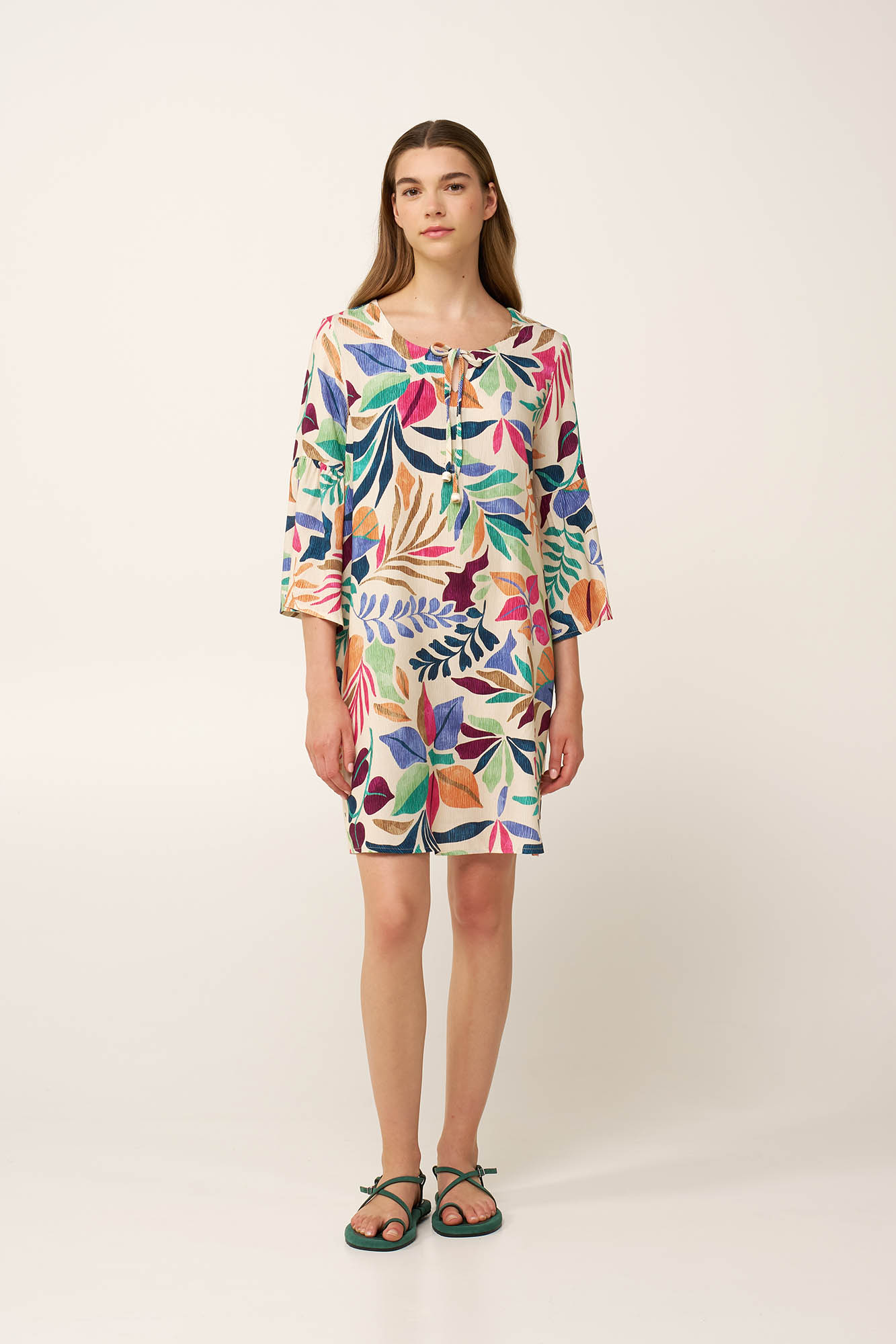 Μια δασερή προσέγγιση στο καλοκαιρινό ντύσιμο, αυτό το φόρεμα είναι κατασκευασμένο από διαπνέουσα 100% viscose ποπλίνα, προσφέροντας απαλή και αέρινη αίσθηση καθ’ όλη τη διάρκεια της ημέρας. Η άνετη σιλουέτα και τα χαλαρά του μανίκια προσθέτουν κίνηση σε κάθε βήμα. ενώ ένα print που αποτυπώνει έναν ζωντανό «χορό» από oversized φύλλα του Ειρηνικού, χαρίζει φωτεινότητα και γοητεία. Εκφραστικό και ανάλαφρο, είναι ιδανικό για ηλιόλουστες αποδράσεις, χαλαρές βόλτες το Σαββατοκύριακο ή για να απολαμβάνετε τον ρυθμό του καλοκαιριού.
