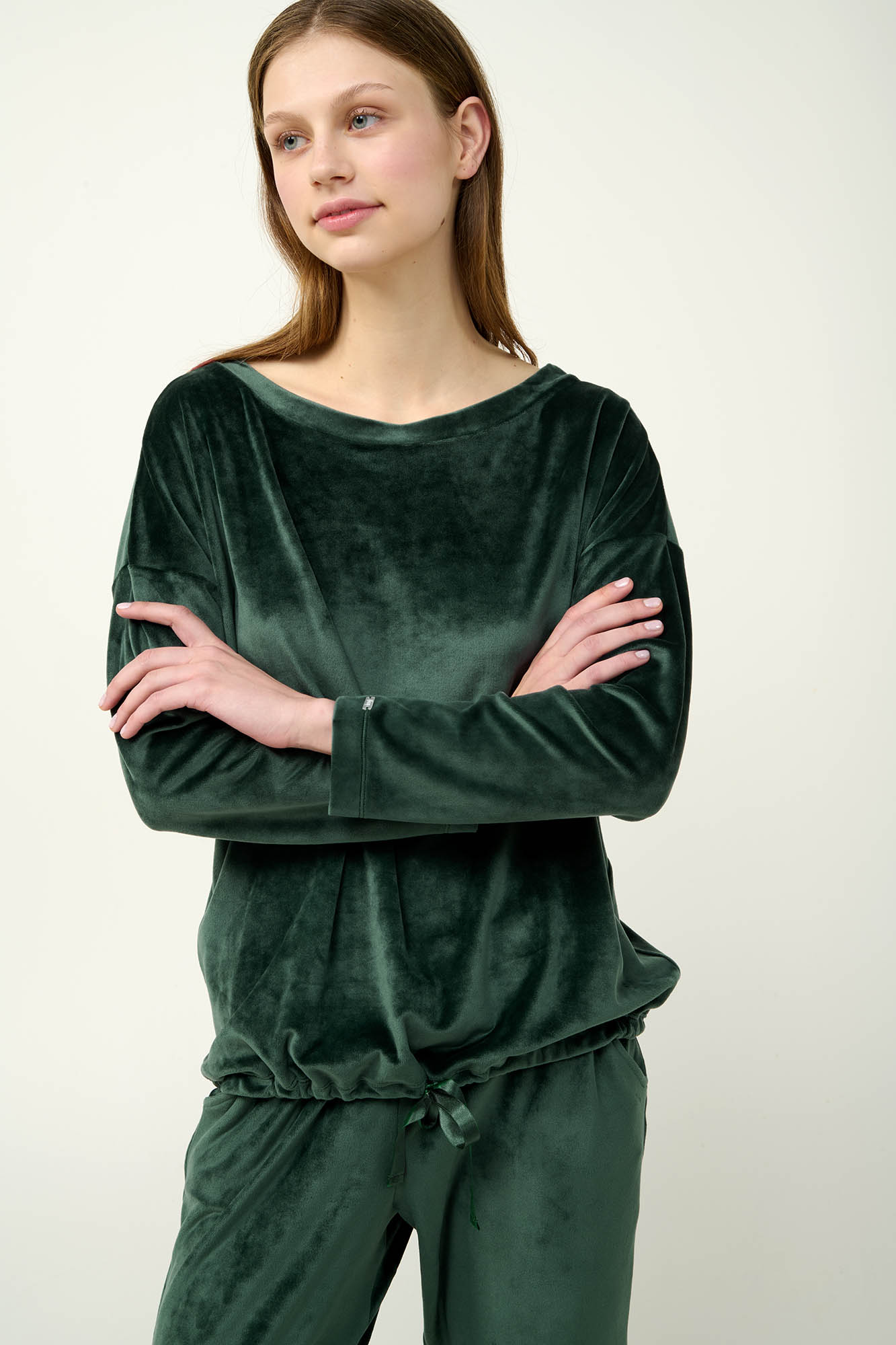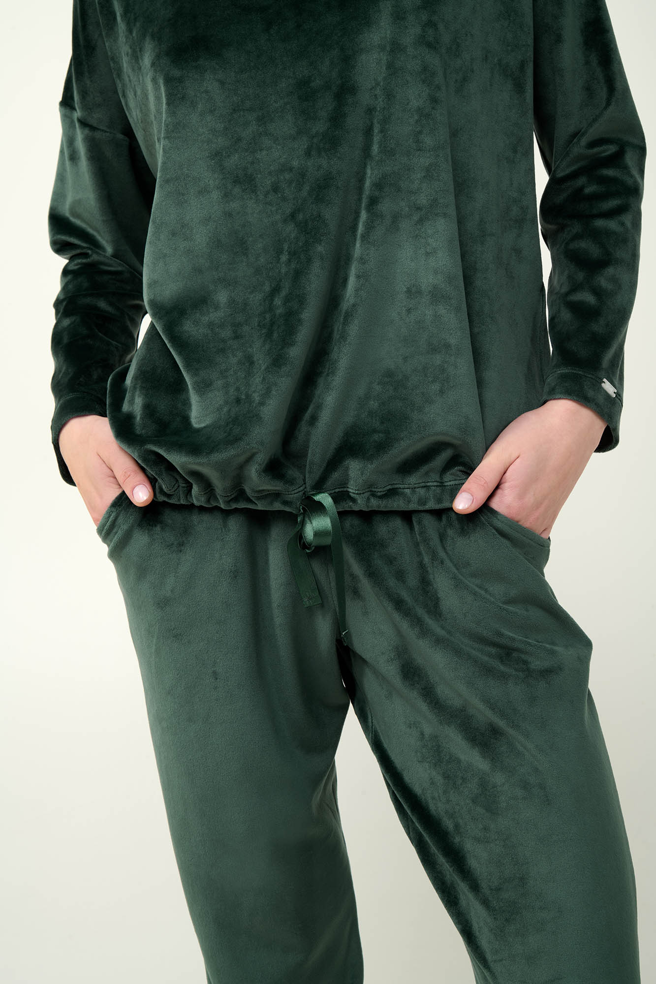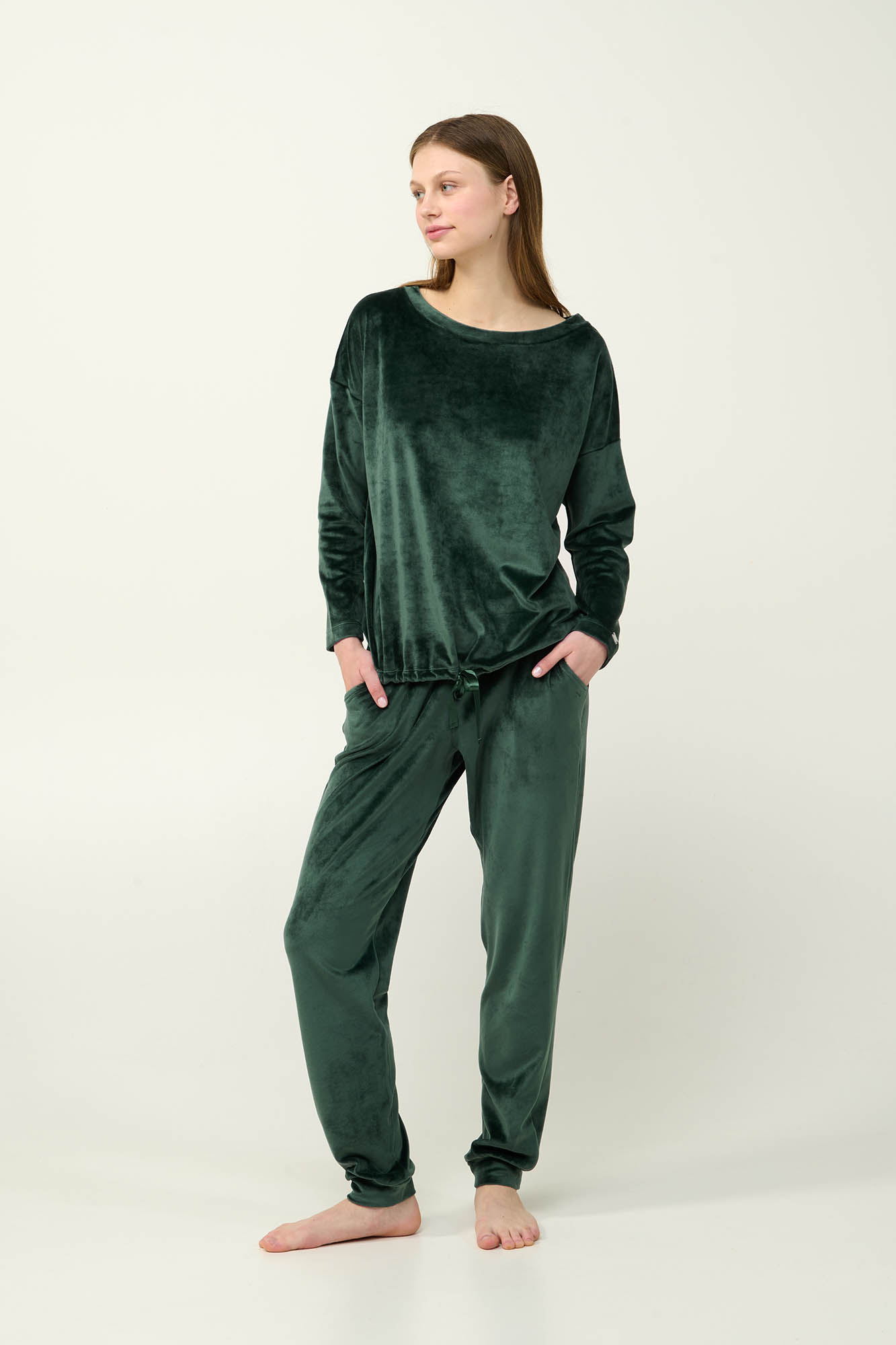 Επιλέξτε μια μονόχρωμη χειμερινή, γυναικεία φόρμα από απαλό και ελαστικό βελούδο. Το πάνω μέρος είναι σχεδιασμένο σε χαλαρή γραμμή με ρυθμιζόμενο λάστιχο στη μέση για βέλτιστη εφαρμογή. Το σετ συμπληρώνει ένα μονόχρωμο παντελόνι με μανσέτες. Ιδανικό για χαλαρές στιγμές στο σπίτι ή casual εξόδους, αυτό το σετ έχει σχεδιαστεί για να παρέχει κομψότητα και άνεση.
