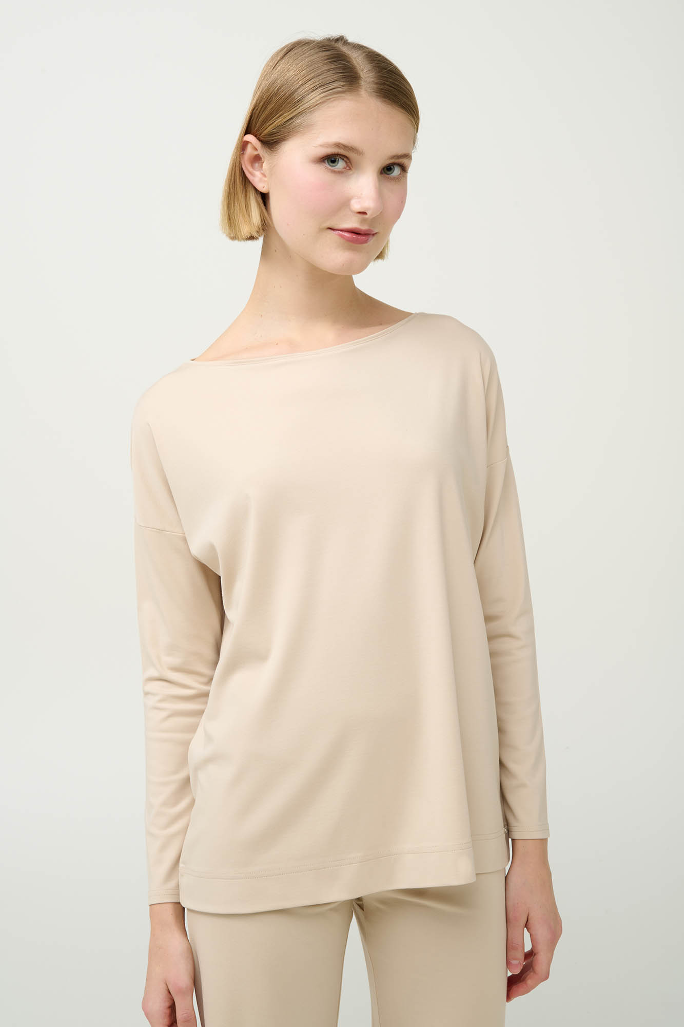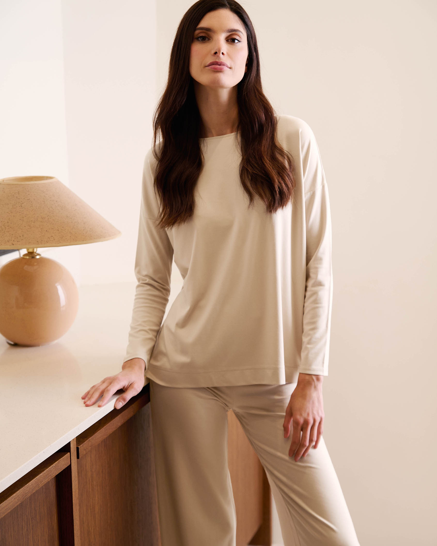 Απολαύστε στυλ και άνεση με αυτό το μακρυμάνικο τοπ, φτιαγμένο από απαλό, ελαστικό ύφασμα. Το λιτό του σχέδιο χαρίζει διαχρονική κομψότητα, ενώ η χαλαρή γραμμή προσφέρει ελευθερία κινήσεων. Ιδανικό για στιγμές χαλάρωσης στο σπίτι ή για ελαφριές δραστηριότητες, συνδυάζεται εύκολα με το αγαπημένο σας παντελόνι για ένα κομψό και άνετο σύνολο.