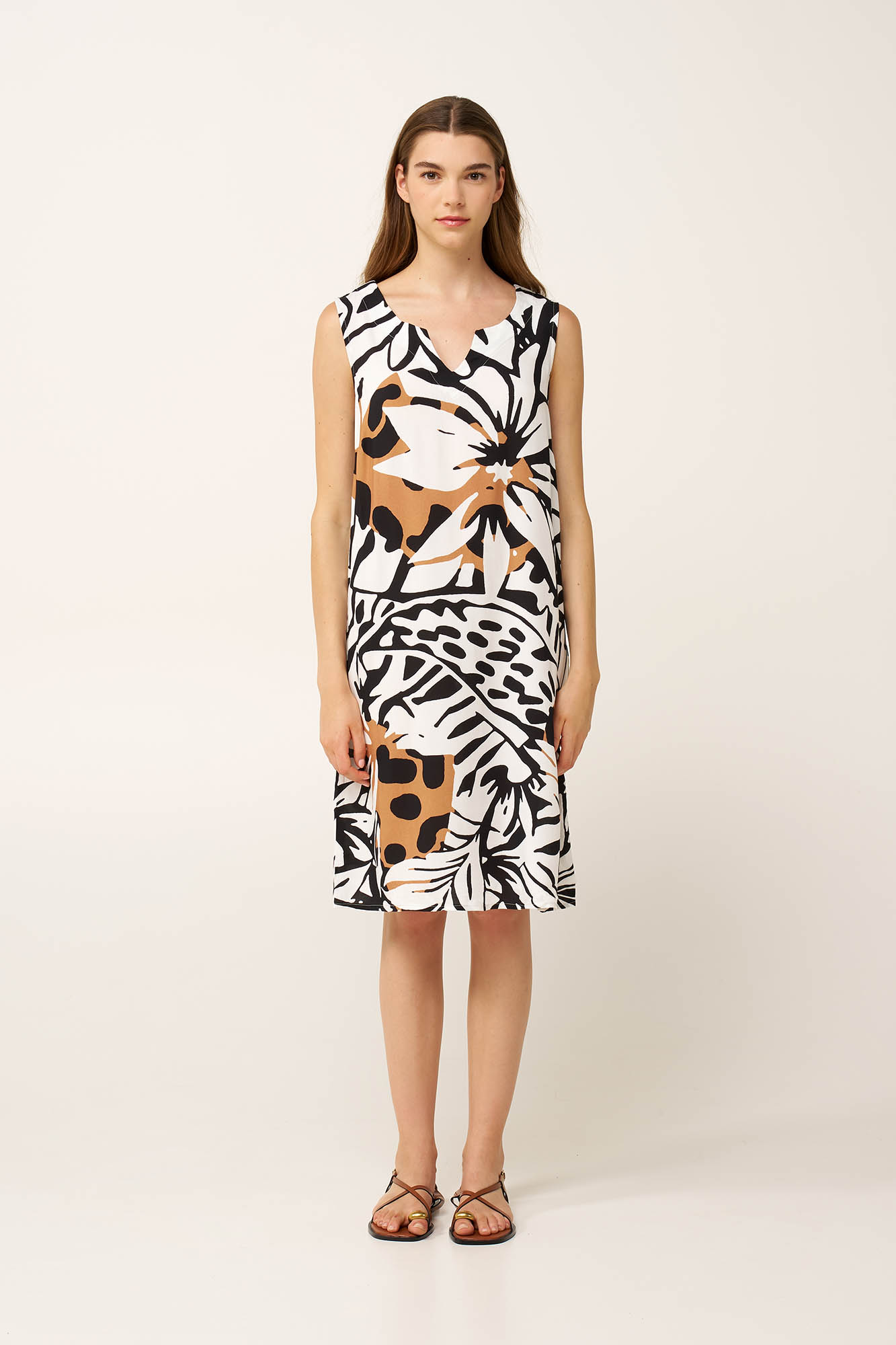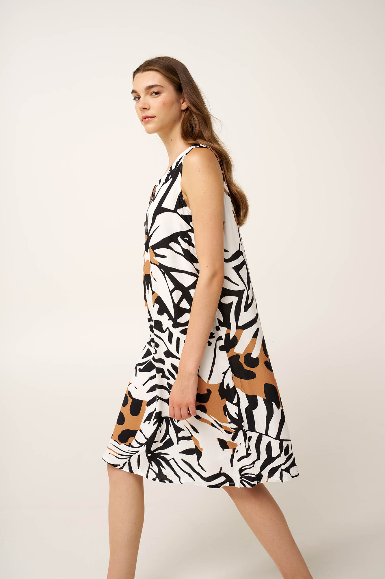 Επιλέξτε ένα δροσερό, καλοκαιρινό φόρεμα, κατασκευασμένο από διαπνέον μείγμα ποπλίνας από viscose και λινό για απαλή, φυσική αίσθηση. Σχεδιασμένο με oversized τροπικά φύλλα σε ασπρόμαυρο αφρικανικό print, η εντυπωσιακή αντίθεση και οι ζεστοί τόνοι της άμμου χαρίζουν δύναμη και χαρακτήρα στο σχέδιο. Εντυπωσιακό και αδάμαστο, ιδανικό για να ξεχωρίζετε όπου κι αν σας οδηγήσει το καλοκαίρι.