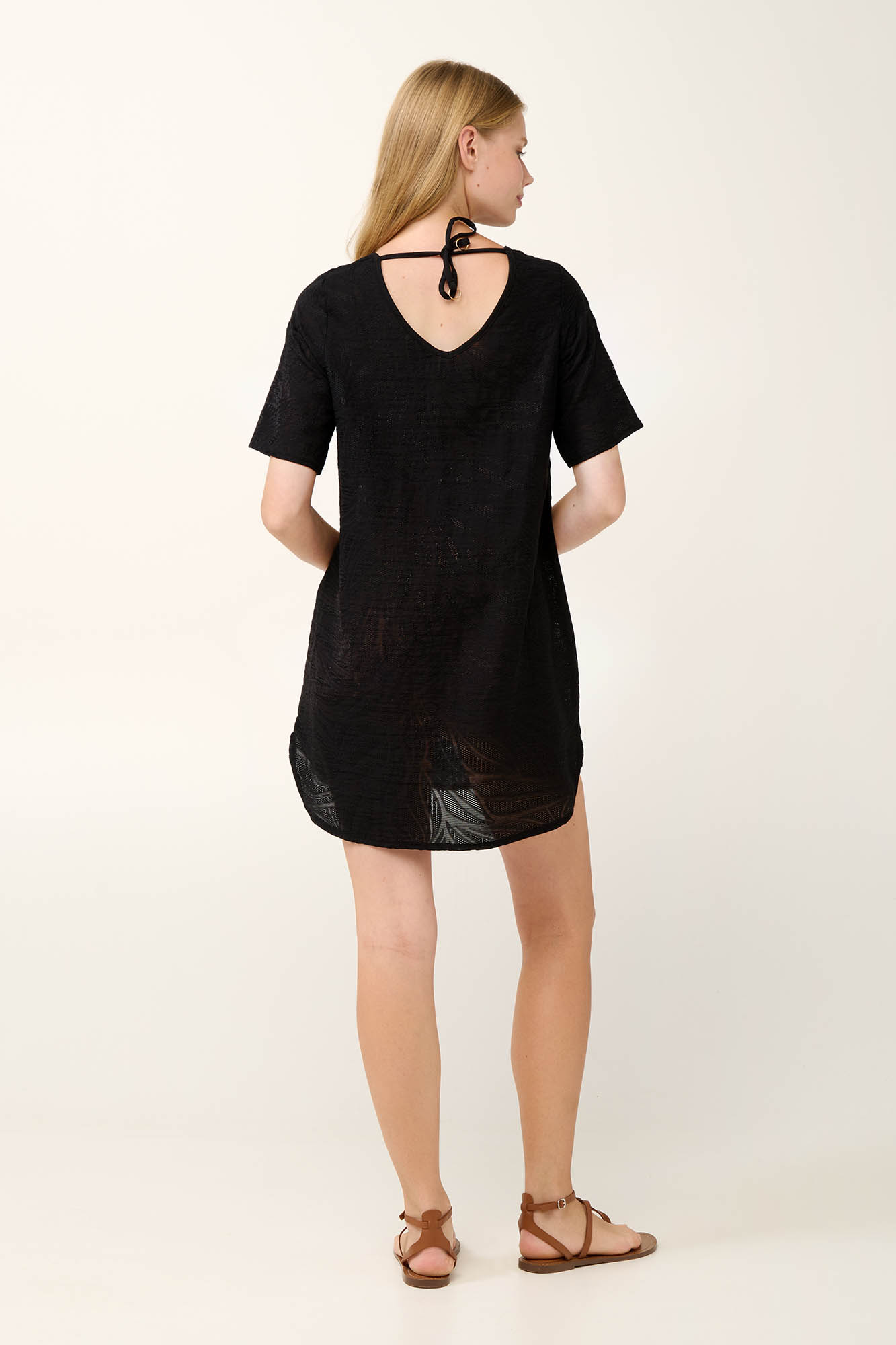 Απολαύστε την άνεση που σας προσφέρει αυτό το αέρινο καλοκαιρινό φόρεμα από ελαφριά jacquard viscose, που χαρίζει απαλότητα και δροσερή αίσθηση. Σχεδιασμένο με κομψή V λαιμόκοψη μπροστά και πίσω που δένει στο πίσω μέρος του λαιμού και προσθέτει μια θηλυκή νότα στην εμφάνιση σας. Ιδανικό για να φορεθεί πάνω από το μαγιό ή μετά την παραλία, είναι μια εύκολη επιλογή για αποδράσεις δίπλα στη θάλασσα.