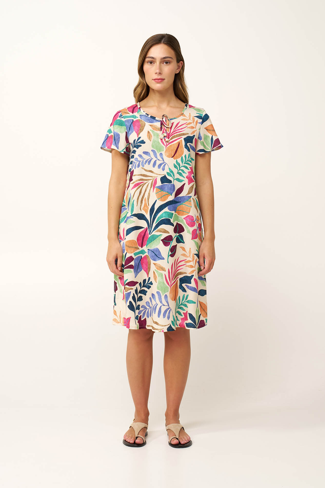 Προσθέστε στην γκαρνταρόμπα σας, αυτό το φόρεμα είναι κατασκευασμένο από 100% viscose ποπλίνα, προσφέροντας απαλή και ανάλαφρη αίσθηση. Σχεδιασμένο σε χαλαρή γραμμή, κινείται ελεύθερα και άνετα σε κάθε βήμα. Το μοτίβο αποτυπώνει έναν ζωντανό «χορό» από oversized φύλλα του Ειρηνικού με μια χαρούμενη, καλλιτεχνική σύνθεση. Ιδανικό για εξορμήσεις στην παραλία, χαλαρές καλοκαιρινές βόλτες ή ηλιόλουστες στιγμές, αυτό το φόρεμα χαρίζει κίνηση και φως.