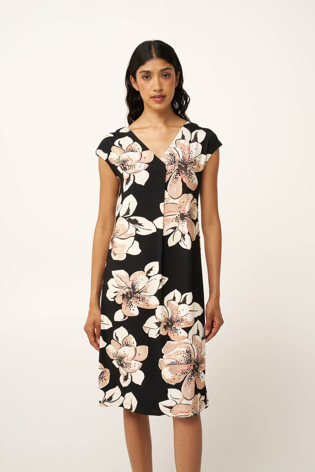 Χαρίστε κομψότητα στις ημέρες με αυτό το καλοκαιρινό φόρεμα από ένα μείγμα viscose και elastane. Απαλό, δροσερό και με διακριτική ελαστικότητα, αγκαλιάζει το σώμα κολακεύοντας τη σιλουέτα. Με λαιμόκοψη V μπροστά και πίσω και μια πιέτα που προσθέτει άνεση και διακριτική κίνηση στο φόρεμα. Το floral print με τις εντυπωσιακές μανόλιες σε μαύρο καμβά, χαρίζει ηρεμία κι ρομαντισμό. Ιδανικό για ζεστές ημέρες που συνεχίζονται σε καλοκαιρινά βραδινά σχέδια.